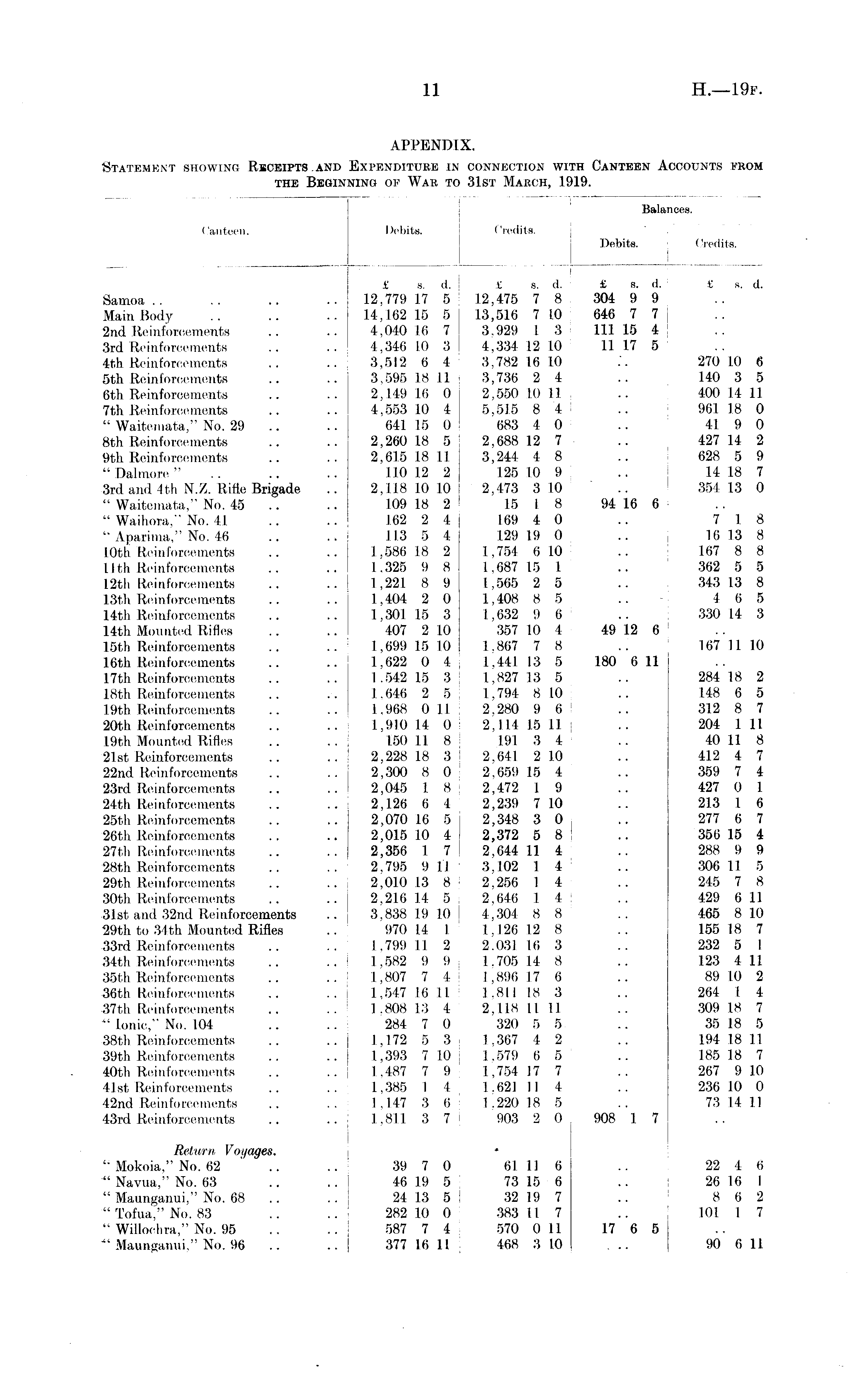 Balances. Canteen. ('anteen. Debits. Credits. I Debits. Credits. Samoa Main Body 2nd Reinforcements 3rd Reinforcements 4th Reinforcements 5th Reinforcements 6th Reinforcements 7th Reinforcements " Waitemata," No. 29 8th Reinforcements 9th Reinforcements " Dal more " 3rd and 4th N.Z. Rifle Brigade " Waitemata," No. 45 " Waihora," No. 41 " Aparima," No. 46 I Oth Reinforcements llth Reinforcements 12th Reinforcements 13th Reinforcements 14th Reinforcements 14th Mounted Rifles 15th Reinforcements 16th Reinforcements 17th Reinforcements 18th Reinforcements 19th Reinforcements 20th Reinforcements 1.9th Mounted Rifles 21st Reinforcements 22nd Reinforcements 23rd Reinforcements 24th Reinforcements 25th Reinforcements 26th Reinforcements 27th Reinforcements 28th Reinforcements 29th Reinforcements 30th Reinforcements ■31st and 32nd Reinforcements 29th to 34th Mounted Rifles 33rd Reinforcements 34th Reinforcements 35th Reinforcements 36th Reinforcements 37th Reinforcements "Ionic," No. 104 38th Reinforcements 39th Reinforcements 40th Reinforcements 41st Reinforcements 42nd Reinforcements 43rd Reinforcements ■■! i £ s. d. I 12,779 17 5 14,162 15 5 I 4,040 16 7 I 4,346 10 3 3,512 6 4 3,595 18 11 ; 2,149 16 0 j 4,553 10 4 641 15 0 ! 2,260 18 5 ! 2,615 18 11 110 12 2 2,118 10 10 109 18 2 162 2 4 113 5 4 1,586 18 2 1,325 9 8 1,221 8 9 1,404 2 0 1,301 15 3 407 2 10 1,699 15 10 1,622 0 4 1.542 15 3 1.646 2 5 1,968 Oil 1,910 14 0 150 11 8 2,228 18 3 2,300 8 0 2,045 1 8 2,126 6 4 2,070 16 5 2,015 10 4 2,356 1 7 2.795 9 II 2,010 13 8 2,216 14 5 3,838 19 10 970 14 1 1.799 11 2 1,582 9 9 1.807 7 4 I.517 16 II 1.808 13 4 284 7 0 1.172 5 3 1,393 7 10 1.487 7 9 1.385 1 4 1,147 3 6 1,811 3 7 £ s. d. 12,475 7 8 13,516 7 10 3.929 1 3 4,334 12 10 3.782 16 10 3,736 2 4 2,550 10 11 5,515 8 4 683 4 0 2,688 12 7 3,244 4 8 125 10 9 2,473 3 10 15 I 8 169 4 0 129 19 0 1,754 6 10 1,687 15 1 1,565 2 5 1,408 8 5 1,632 9 6 357 10 4 1.867 7 8 1,441 13 5 1,827 13 5 1.794 8 10 2,280 9 6 2.114 15 11 191 3 4 2,641 2 10 2,659 15 4 2,472 1 9 2,239 7 10 2,348 3 0 2,372 5 8 2,644 11 4 3,102 1 4 2,256 1 4 2,646 1 4 4,304 8 8 1,126 12 8 2.031 16 3 1.705 14 8 1,896 17 6 1.811 18 3 2,118 11 11 320 5 5 1.367 4 2 1.579 6 5 1,754 17 7 1.621 II 4 1.220 18 5 903 2 0 £ s. d. 304 9 9 646 7 7 111 15 4 11 17 5 94 16 6 i 49 12 6 180 6 11 908 I. 7 £ s. d. 270 10 6 140 3 5 400 14 11 961 18 0 41 9 0 427 14 2 628 5 9 14 18 7 354 13 0 7 1 8 16 13 8 167 8 8 362 5 5 343 13 8 4 6 5 330 14 3 167 II 10 284 18 2 148 6 5 312 8 7 204 1 11 40 U 8 412 4 7 359 7 4 427 0 1 213 I 6 277 6 7 356 15 4 288 9 9 306 II 5 245 7 8 429 6 11 465 8 10 155 18 7 232 5 I 123 4 11 89 10 2 264 1 4 309 18 7 35 18 5 194 18 11 185 18 7 267 9 10 236 10 0 73 14 11 Return Voyages. " Mokoia," No. 62 " Navua," No. 63 " Maunganui," No. 68 " Tofua," No. 83 " Willochra," No. 95 *' Maunganui," No. 96 39 7 0 46 19 5 24 13 5 282 10 0 587 7 4 j 377 16 11 • 61 II 6 73 15 6 32 19 7 383 II 7 570 0 11 468 3 10 17 6 5 22 4 6 26 16 I 8 6 2 101 1 7 90 6 11