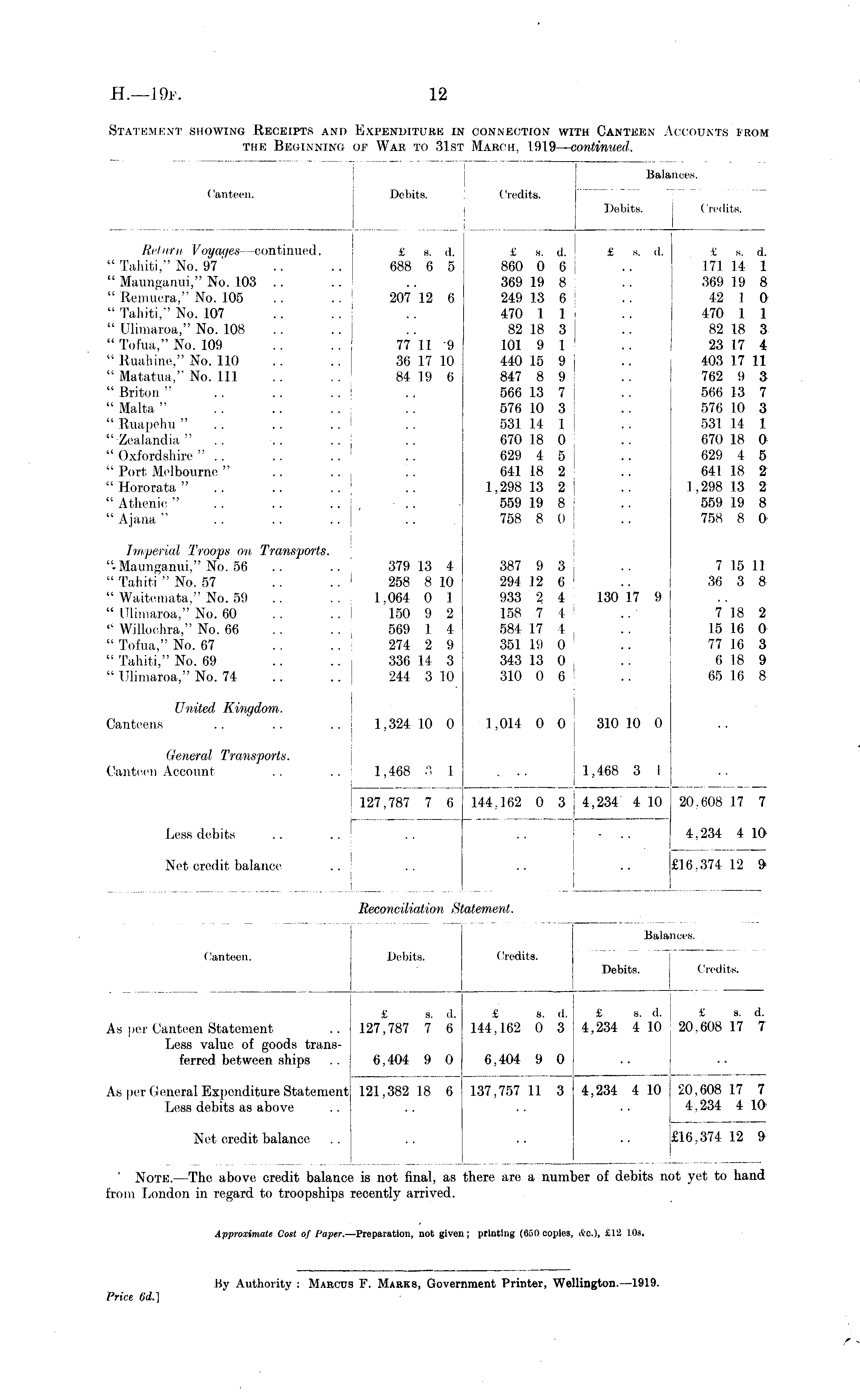 ('anteen. Debits. Return Voyages —continued. s, s. d. " Tahiti," No. 97 ' .. .. 688 6 5 " Maunganui," No. 103 .. " Reinuera," No. 105 .. .. 207 12 6 " Tahiti," No. 107 " Ulimaroa," No. 108 " Tofua," No. 109 .. .. 77 11 9 " Ruahine," No. 110 .. .. 36 17 10 " Matatua," No. Ill .. .. 84 19 6 " Briton " " Malta " " Ruapehu " . . " Zealandia " " Oxfordshire " .. " Port Melbourne, " " Hororata " .. " Athenic " .. . . .. , " Ajana " Credits. £ s. 860 0 369 19 249 13 470 1 82 18 101 9 440 15 847 8 566 13 576 10 531 14 670 18 629 4 641 18 1,298 13 559 19 758 8 d. 6 8 6 1 i 3 j i ! 9 i 9 ! 7 i 3 1 •'I 2 2 i 8 I 0 Debits. £ s. £ s. (I. £ s. d. 171 14 1 369 19 8 42 I 0 470 I 1 82 18 3 23 17 4 403 17 11 762 9 3 566 13 7 576 10 3 531 14 1 670 18 0 629 4 5 641 18 2 1.298 13 2 559 19 8 758 8 O Balances. Debits. d. Credits. Imperial Troops on Transports. "-Maunganui," No. 56 .. .. 379 13 4 " Tahiti " No. 57 .. .. • 258 8 10 " Waitemata," No. 59 .. .. 1,064 0 1 " Ulimaroa," No. 60 .. .. | 150 9 2 " Willoehra," No. 66 .. .. 569 1 4 " Tofua," No. 67 .. .. 274 2 9 " Tahiti," No. 69 .. .. 336 14 3 " Ulimaroa," No. 74 .. .. 244 3 10 387 9 294 12 933 2 158 7 584 17 351 19 343 13 310 0 3 6 4 4 4 0 °l 6 ! 130 17 7 15 11 36 3 8 130 17 9 7 18 2 15 16 0 77 16 3 6 18 9 65 16 8 9 United Kingdom. 1,014 0 0 310 10 310 10 0 0 Canteens .. .. .. 1,324 10 0 General Transports. Canteen Account .. .. I 1,468 3 1 1,468 3 ,468 3 1 1 127,787 7 6 144.162 0 3 4,234 4 10 ,234 4 10 20,608 17 7 Less debits 4.234 4 10 Net credit balance £16.374 12 9 Reconciliation St Mement. Balances. Canteen. Debits. Credits. Debits. Credits. As per Canteen Statement Less value of goods transferred between ships £ 127,787 s. 7 d. 6 £ 144,162 s. d. 0 3 £ 4,234 s. d. 4 10 £ s. 20.608 17 a. 7 6,404 9 0 6,404 9 0 As per General Expenditure Statement Less debits as above 121,382 18 6 137,757 11 3 4,234 4 10 20,608 17 7 4.234 4 10 Net credit balance £16,374 12 9 Note. —The above credit balance from London in regard to troopships is not final, as ■ecently arrived. there are a num ier of debits m ot yet, to hand