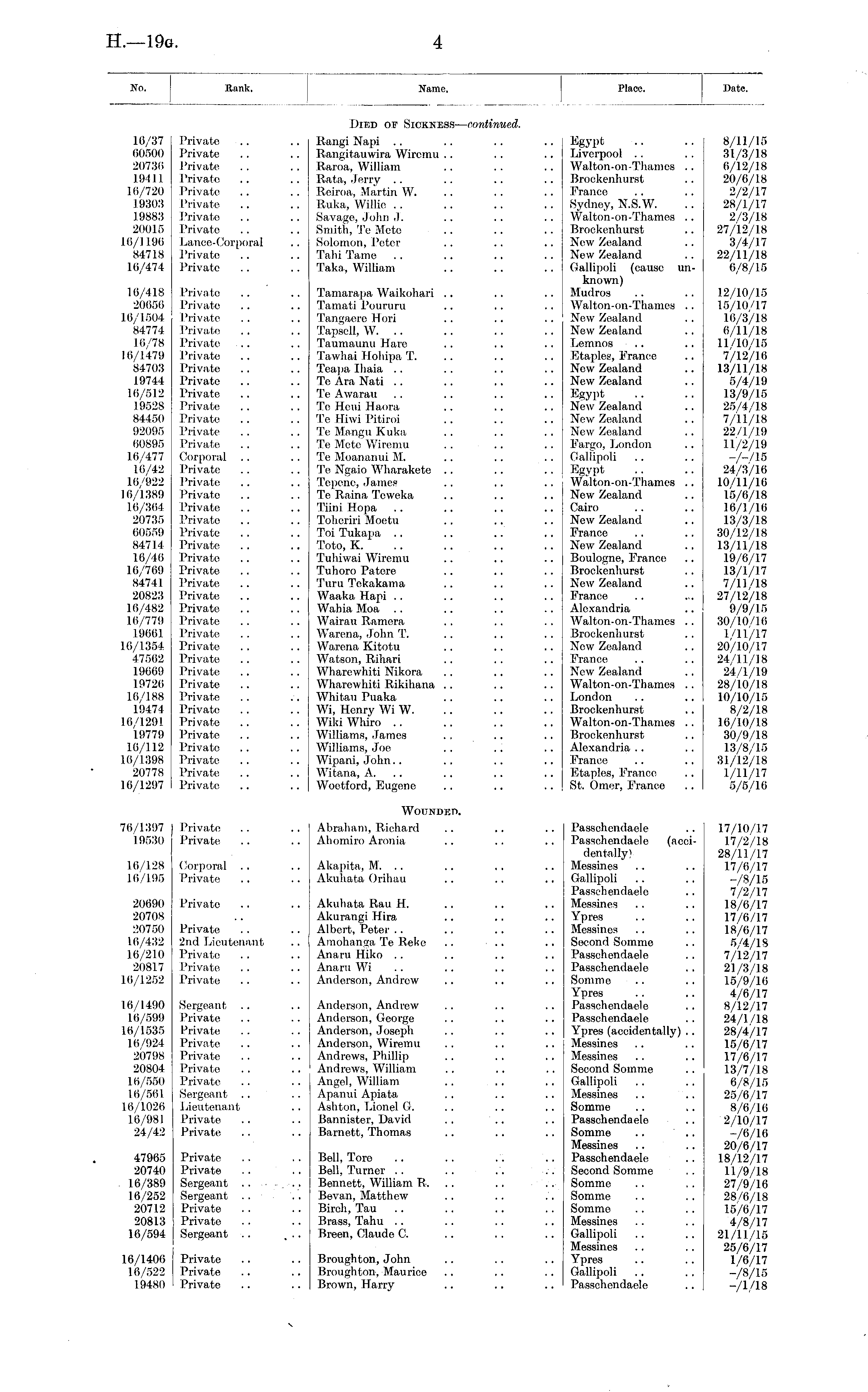 No. Bank. Name. Name. Place. Place. Date. Private Private Private Privato Private Private Private Privato Lance-Corporal Private Private Died oe Sickness— continued. 10/37 60500 20730 19411 16/720 19303 19883 20015 16/1196 84718 16/474 16/418 20050 10/1504 84774 16/78 16/1479 84703 19744 16/512 .19528 84450 92095 60895 16/477 16/42 16/922 16/1389 1.6/364 20735 60559 84714 16/46 16/769 84741 20823 16/482 16/779 19661 16/1354 47562 19669 19726 16/188 19474 16/1291 19779 16/112 16/1398 20778 16/1297 Private Private Private Private Private Private Private Private Private Private Private Private Private Corporal .. Private Private Private Private Privato Private Private Private Private Private Private Private Private Private Private Private Private Private Private Private Private Private Private Private Private Private Rangi Napi Rangitauwira Wiremu Raroa, William Rata, Jerry Reiroa, Martin W. .. Ruka, Willie Savage, John J. .. Smith, Te Mete Solomon, Peter Tahi Tame .. Taka, William Tamarapa Waikohari Tamati Poururu Tangaere Hori .. Tapsell, W. .. Taumaunu Hare Tawhai Hohipa T. Teapa Ihaia .. .. Te Ara Nati Te Awarau . . Te Heui Haora Te Hiwi Pitiroi . . Te Mangu Kuka Te Meto Wiremu . . Te Moananui M. Te Ngaio Wharakete Tepene, James Te Rain a Tcweka Tiini Hopa Tohoriri Moetu . . Toi Tukapa .. .. Toto, K. Tuhiwai Wiremu Tuhoro Patoro Turu Tekakama Waaka Hapi Wahia Moa Wairau Ramora Warena, John T. Warena Kitotu Watson, Rihari Wharewhiti Nikora Wharewhiti Rikihana Whitau Puaka .. Wi, Henry Wi W. . . Wiki Whiro Williams, James Williams, Joe Wipani, John Witana, A. Woetford, Eugene : : i ■ ■ ( ; i : i ] - : : i - : : i : i : : : : ] : i ] i ] : i : j : i Egypt Liverpool Walton-on-Thames .. Brockenhurst France Sydney, N.S.W. Walton-on-Thames .. Brockenhurst New Zealand New Zealand Gallipoli (cause unknown) Mudros Walton-on-Thames .. New Zealand New Zealand Lemnos Etaples, France New Zealand New Zealand Egypt New Zealand New Zealand New Zealand Fargo, London Gallipoli Egypt Walton-on-Thames .. New Zealand Cairo New Zealand France New Zealand Boulogne, France Brockenhurst New Zealand France Alexandria Walton-on-Thames .. Brockenhurst New Zealand Prance New Zealand Walton-on-Thames .. London Brockenhurst Walton-on-Thames .. Brockenhurst Alexandria France Etaples, France St. Omer, Franco 8/11/15 31/3/18 6/12/18 20/6/18 2/2/1.7 28/1/17 2/3/18 27/12/18 3/4/17 22/11/18 6/8/15 12/10/15 15/10/17 10/3/18 6/11/18 11/10/15 7/12/16 13/11/18 5/4/19 13/9/15 25/4/18 7/11/18 22/1/19 11/2/19 -/-/IB 24/3/16 10/11/16 15/6/18 16/1/16 13/3/18 30/12/18 13/11/18 19/6/17 13/1/17 7/11/18 27/12/18 9/9/15 30/1.0/16 1/11/17 20/10/17 24/11/18 24/1/19 28/10/18 10A0/15 8/2/18 16/10/18 30/9/18 13/8/15 31/12/18 1/11/17 5/5/16 76/1397 19530 Private Private, Wounded. 17/10/17 17/2/18 28/11/17 17/6/17 -A/15 7/2/17 18/6/17 17/6/17 18/6/17 5/4/18 7/12/17 21/3/18 15/9/16 4/6/17 8/12/17 24/1/18 28/4/17 15/6/17 17/6/17 13/7/18 6/8/15 25/6/17 8/6/16 2/10/17 -/6/16 20/6/17 18/12/17 11/9/18 27/9/16 28/6/18 15/6/17 4/8/17 21/11/15 25/6/17 1/6/17 -A/15 -/I/I8 16/128 16/195 20690 20708 20750 16/432 16/210 20817 16/1252 16/1490 16/599 16/1535 16/924 20798 20804 16/550 16/561 16/1026 16/981 24/42 Corporal Private Private Privato 2nd Lieutenant Privato Private Private Sergeant .. Private Private Private Private Privato Private Sergeant .. Lieutenant Private Private Abraham, Richard Ahomiro Aronia Akapita, M. .. Akuhata Orihau Akuhata Rau H. Akurangi Hira .. Albert, Peter Amohanga Te Reke .. Anaru Hiko Anaru Wi Anderson, Androw Anderson, Andrew Anderson, George Anderson, Joseph Anderson, Wiremu Andrews, Phillip Andrews, William Angel, William .. Apanui Apiata Ashton, Lionel G. Bannister, David Barnett, Thomas .. Bell, Tore .. Bell, Turner Bennett, William R. . . Bcvan, Matthew . . Birch, Tau .. Brass, Tahu Breen, Claude C. Broughton, John Broughton, Maurice Brown, Harry j i : i Passchendaele Passchendaele (accidentally! Messines Gallipoli Passchendaele Messines Ypres Messines Second Somme Passchendaele Passchendaele, Somme Ypres Passchendaele Passchendaele Ypres (accidentally) .. Messines Messines Second Somme Gallipoli Messines .. Somme Passchendaele Somme .. Messines Passchendaele Second Somme Somme Somme Somme Messines Gallipoli Messines Ypres Gallipoli Passchondaele 47965 20740 16/389 16/252 20712 20813 16/594 Private Private Sergeant .. Sergeant .. Private Private Sergeant .. 16/1406 16/522 19480 Private Private Private