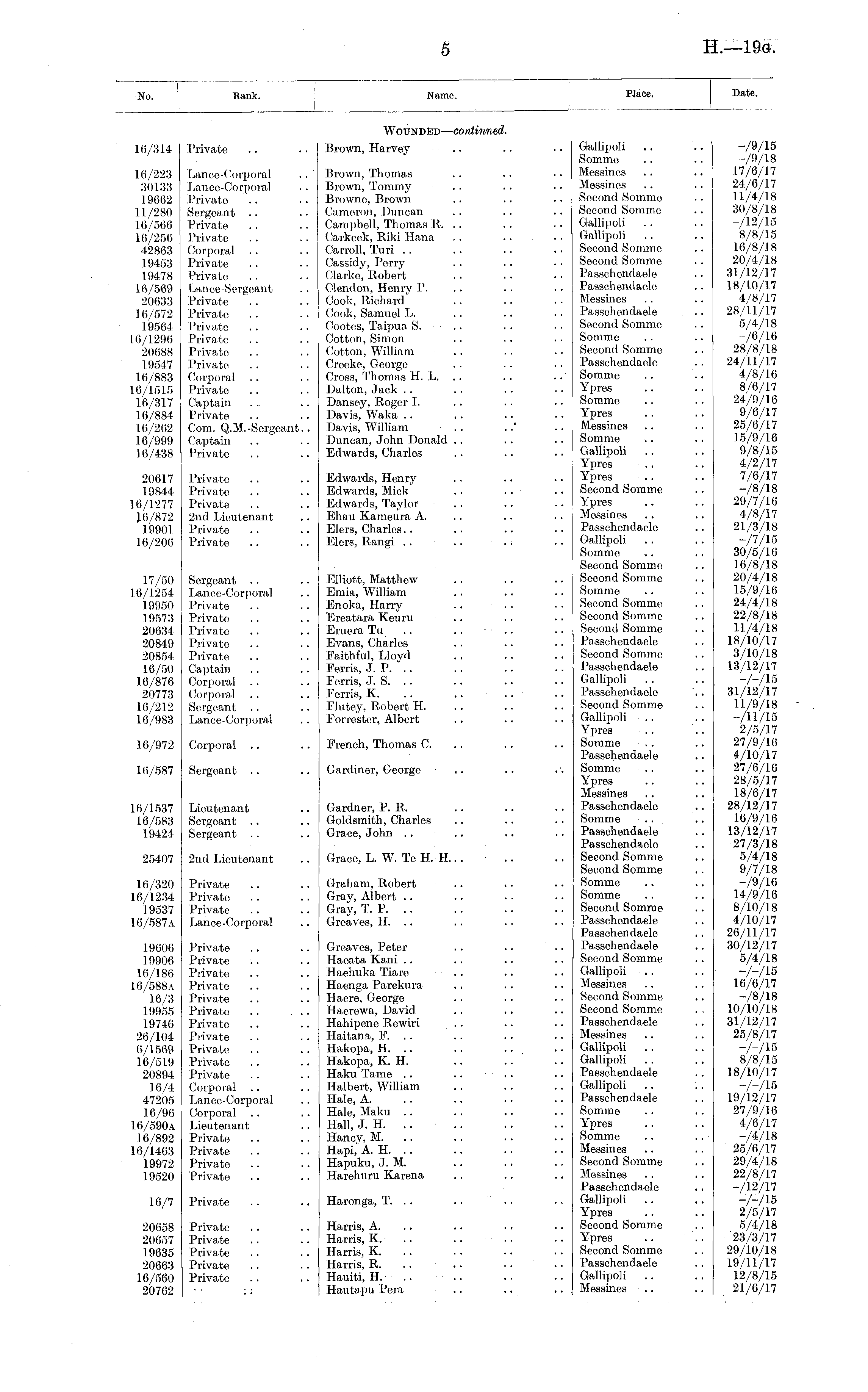 No. Itank. Name, Place. Date. Wounded— continued. 16/314 Private Brown, Harvey Gallipoli Somme Messines Messines Second Sommo Second Somme Gallipoli Gallipoli Second Somme Second Somme Passchendaele Passchendaele Messines Passchendaele Second Somme Somme Second Somme Passchendaele Somme, Ypres Somme Ypres Messinos Somme Gallipoli Ypres Ypres Second Somme Ypres Messines Passchondaele Gallipoli Somme Second Somme Second Somme Sommo Second Somme Second Somme Second Sommo Passchendaele Second Somme Passchendaele Gallipoli Passchendaele Second Somme Gallipoli Ypres Somme Passchendaele Sommo Ypres Messines Passchendaele Somme Passchendaele Passchendaele Second Sommo Second Somme Somme Somme Second Somme Passch endaele Passchendaele Passchendaele Second Somme Gallipoli Messines Second Somme Second Somme Passchendaele Messines Gallipoli Gallipoli Passchendaele Gallipoli Passchendaele Sommo Ypres Somme Messines Second Somme Messines Passchendaele Gallipoli Ypres Second Somme Ypres Second Somme Passchendaele Gallipoli Messines - .. -/9/15 -A/18 17/0/17 24/6/17 11/4/18 30/8/18 -/12/15 8/8/15 16/8/18 20/4/18 31/12/17 18/10/17 4/8/17 28/11/17 5/4/18 -/6/16 28/8/18 24/11/17 4/8/16 8/6/17 24/9/16 9/6/17 25/6/17 15/9/16 9/8/15 4/2/17 7/6/17 -A/18 29/7/16 4/8/17 21/3/18 -A/15 30/5/10 16/8/18 20/4/18 15/9/16 24/4/18 22/8/18 11/4/1.8 18/10/17 3/10/18 13/12/17 -A/15 31/12/17 11/9/18 -/11/15 2/5/17 27/9/16 4/10/17 27/6/16 28/5/17 18/6/1.7 28/12/17 16/9/16 13/12/17 27/3/18 5/4/18 9/7/18 -/9/16 14/9/16 8/10/18 4/10/17 26/11/17 30/12/17 5/4/18 -A/15 16/6/17 -/8/18 10/10/18 31/12/17 25/8/17 -A/15 8/8/15 18/10/17 A-/15 19/12/17 27/9/16 4/6/17 -A/is 25/6/17 29/4/18 22/8/17 -/12/17 -A/15 2/5/17 5/4/18 23/3/17 29/10/18 19/11/17 12/8/15 21/6/17 16/223 30133 19662 11/280 16/566 16/256 42863 19453 19478 16/569 20633 16/572 19564 6/1296 20688 19547 16/883 .6/1515 16/317 16/884 16/262 16/999 16/438 Lance-Corporal Lance-Corporal Privato Sergeant Private Private Corporal Private Private Lance-Sergeant Private Privato Private Private Private Private Corporal Private Captain Private Com. Q.M.-Sergeant.. Captain Private Brown, Thomas Brown, Tommy Browne, Brown Cameron, Duncan Campbell, Thomas R. . . Carkeek, Riki liana Carroll, Turi Oassidy, Perry Clarke, Robert Clendon, Henry P. Cook, Richard Cook, Samuel L. Cootes, Taipua S. .. Cotton, Simon Cotton, William Creeke, Georgo Cross, Thomas H. L. Dalton, Jack Danscy, Roger I. Davis, Waka Davis, William Duncan, John Donald Edwards, Charles 20617 19844 16/1277 16/872 19901 16/200 Private Private Private 2nd Lieutenant Private Private Edwards, Henry Edwards, Mick .. Edwards, Taylor Elian Kameura A. Elers, Charles Elers, Rangi . . .. . i 17/50 16/1254 19950 19573 20634 20849 20854 16/50 16/876 20773 16/212 16/983 Sergeant Lance-Corporal Private Private Private Private Privato Captain Corporal Corporal Sergeant Lance-Corporal Elliott, Matthew Emia, William Enoka, Harry . . Ereatara Keuru Eruera Tu .. .. Evans, Charlos Faithful, Lloyd Ferris, J. P. .. Ferris, J. S. .. Ferris, K. .. .. Flutey, Robert H. Forrester, Albert 16/972 Corporal French, Thomas C, 16/587 Sergeant Gardiner, George 16/1537 16/583 19424 Lieutenant Sergeant Sergeant Gardner, P. R. Goldsmith, Charles Grace, John 25407 2nd Lieutenant Grace, L. W. Te H. H... 16/320 16/1234 19537 I6/587A Private Private Privato Lance-Corporal Graham, Robert Gray, Albert Gray, T. P. .. Greaves, H. .. 19606 19900 16/186 I6/588A 16/3 19955 19746 26/104 6/1569 16/519 20894 16/4 47205 16/96 I6/590A 16/892 16/1463 19972 19520 Privato Private Private Privato Private Private .. ... Private Private Private Private Private Corporal Lance-Corporal Corporal Lieutenant Private Private Private Private Greaves, Peter Haeata Kani Haehuka Tiare Haenga Parekura Haere, George Haorowa, David Hahipene Rewiri Haitana, F. . . Hakopa, H. .. .. Hakopa, K. H. Haku Tame Halbert, William Hale, A. Hale, Maku Hall, J. H. . . Hancv, M. .. Hapi,' A. H. .. Hapuku, J. M. Harohuru Karen a 16/7 Private Haronga, T. .. .. 20658 20657 19635 20663 16/560 20762 Private Private Privato Private, Private .. Harris, A. Harris, K. .. .. Harris, K. . . Harris, R. .. Hauiti, H. .. .. Hautapu Peru ..