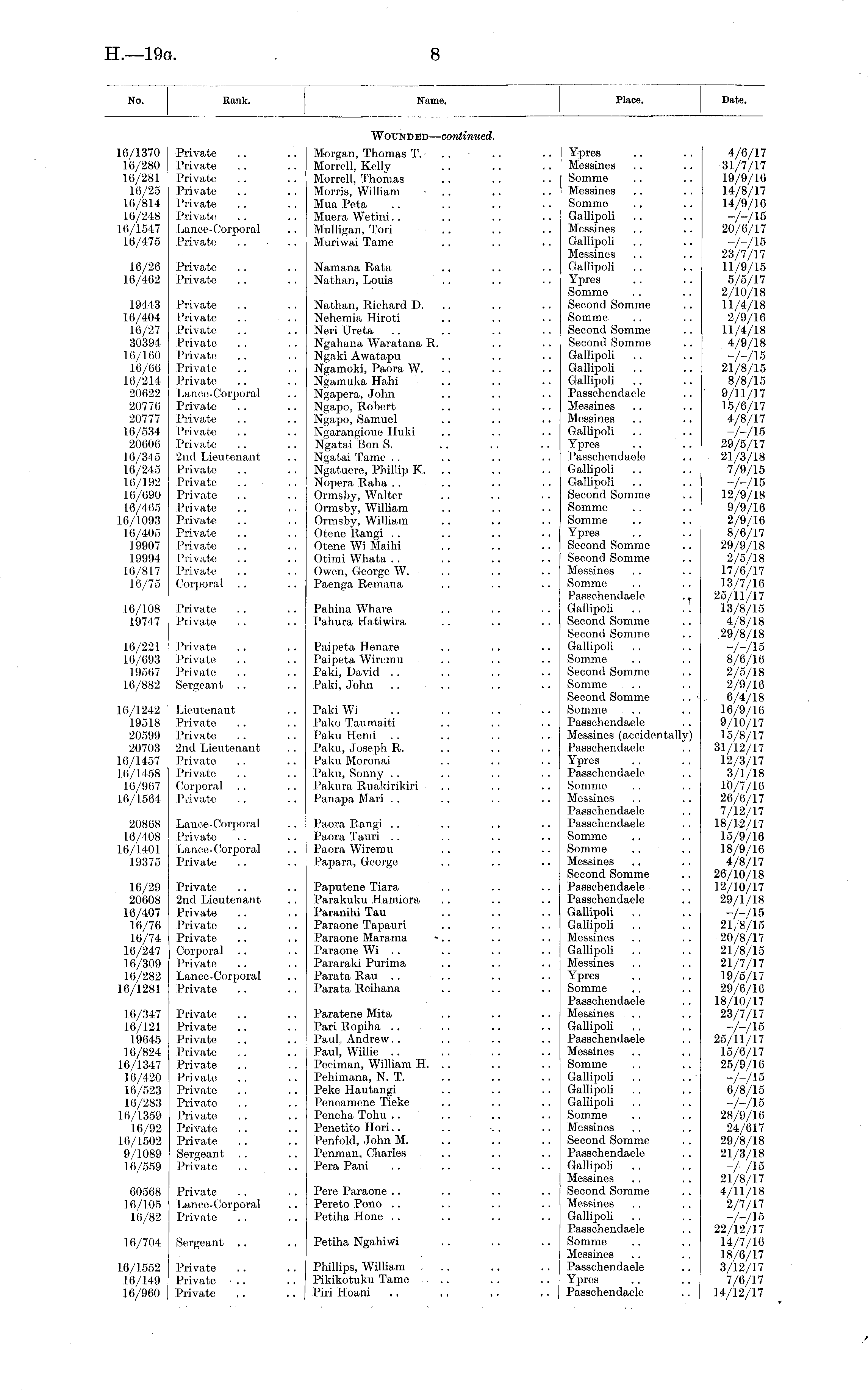 No. Hank. Name. Place. Date. Wounded— continued. 16/1370 10/280 10/281 16/25 16/814 16/248 16/1547 16/475 16/26 16/462 19443 16/404 16/27 30394 16/160 16/66 16/214 20022 20776 20777 16/534 20606 16/345 16/245 16/192 16/690 16/465 16/1093 16/405 19907 19994 10/817 10/75 16/108 19747 16/221 16/693 19567 16/882 16/1242 19518 20599 20703 16/1457 16/1458 16/967 16/1564 Private Private Private Private Private Private Lanoe-Corporal Private Privato Private Privato Private Private Private Private Privato Private Lance-Corporal Privato Private Private Private 2nd Lieutenant Private Private Private Private Private Private Private Private Private Corporal Private Private Private Private Private Sergeant .. Lieutenant Private Private 2nd Lieutenant Private Private Corporal Private Morgan, Thomas T. Morrell, Kelly Morrell, 'Thomas Morris, William Mua Peta Muera Wetini Mulligan, Tori Muriwai Tame Namana Rata Nathan, Louis Nathan, Richard D. Nehemia Hiroti Neri TJreta Ngahana Waratana R. Ngaki Awatapu Ngamoki, Paora W. Ngamuka Hahi Ngapera, John Ngapo, Robert Ngapo, Samuel Ngarangioue Huki Ngatai Bon S. Ngatai Tame Ngatuere, Phillip K. .. Nopera Raha Ormsby, Walter Ormsby, William Ormsby, William Otene Rangi Otene Wi Maihi Otimi Whata Owen, George W. Pacnga Remana Pahina Whare Pahura Hatiwira Paipeta Henare Paipeta Wiremu Paki, David Paki, John Paki Wi Pako Taumaiti Paku Henri Paku, Joseph R. Paku Moronai Paku, Sonny Pakura Ruakirikiri Panapa Mari Ypres Messines Somme Messines Somme Gallipoli Messines Gallipoli Messines Gallipoli Ypres Somme Second Somme Somme Second Somme Second Somme Gallipoli Gallipoli Gallipoli Passchendaele Messines Messines Gallipoli Ypres Passchendaele Gallipoli Gallipoli Second Somme Somme Somme Ypres Second Somme Second Somme Messines Somme Passchendaele ., Gallipoli .. Second Somme Second Somme Gallipoli Somme Second Somme Somme Second Somme .. • Somme Passchondaele Messines (accidentally) Passchendaele Ypres Passchendaele Somme Messines Passchendaele Passchondaele, Somme Somme Messines Second Somme Passchendaele Passchendaele Gallipoli Gallipoli Messines Gallipoli Messines Ypres Somme Passchendaele Messines Gallipoli Passchendaele Messines Somme Gallipoli .. Gallipoli Gallipoli Somme Messines Second Somme Passchendaele Gallipoli Mossines Second Somme Messines Gallipoli Passchendaele Somme Messines Passchendaele Ypres Passchendaele 4/6/17 31/7/17 19/9/16 14/8/17 14/9/16 -A/15 20/6/17 -A/15 23/7/17 11/9/15 5/5/17 2/10/18 11/4/18 2/9/16 11/4/18 4/9/18 -A/15 21/8/15 8/8/15 9/11/17 15/0/17 4/8/17 -A/15 29/5/17 21/3/18 7/9/15 -A/15 12/9/18 9/9/16 2/9/16 8/6/17 29/9/18 2/5/18 17/6/17 13/7/16 25/11/17 13/8/15 4/8/18 29/8/18 -A/IS 8/6/10 2/5/18 2/9/16 6/4/1.8 16/9/10 9/10/17 15/8/17 31/12/17 12/3/17 3/1/18 10/7/16 26/6/17 7/12/17 18/12/17 15/9/16 18/9/16 4/8/17 26/10/18 12/10/17 29/1/18 -/-/I5 21/8/15 20/8/17 21/8/15 21/7/17 19/5/17 29/6/16 18/10/17 23/7/17 -A/15 25/11/17 15/6/17 25/9/16 -A/15 6/8/15 -A/15 28/9/16 24/617 29/8/18 21/3/18 -A/is 21/8/17 4/11/18 2/7/17 -A/15 22/12/17 14/7/16 18/6/17 3/12/17 7/6/17 14/12/17 20868 10/408 16/1401 19375 Lance-Corporal Privato Lance-Corporal Private Paora Rangi Paora Tauri Paora Wiremu Papara, George 16/29 20608 16/407 16/76 16/74 16/247 16/309 16/282 16/1281 Private 2nd Lieutenant Private Private Private Corporal Private Lance-Corporal Private Paputene Tiara Parakuku Hamiora Paranihi Tau Paraone Tapauri Paraone Marama Paraone Wi Pararaki Purima Parata Rati Parata Reihana 16/347 16/121 19645 16/824 16/1347 16/420 16/523 16/283 16/1359 16/92 16/1502 9/1089 10/559 Private Private Private Private Private Privato Private Private Private Private Private Sergeant Private Paratene Mita Pari Ropiha Paul. Andrew Paul, Willie Peciman, William H. .. Pehimana, N. T. Poke Hautangi Peneamene Tieke Peneha Tohu Ponetito Hori Penfold, John M. Penman, Charles Pera Pani 60568 16/105 16/82 Private Lance-Corporal Private Pore Paraone, Pereto Pono Petiha Hone 16/704 Sergeant .. Petiha Ngahiwi 16/1552 16/149 16/960 Private Private - .. Private Phillips, William Pikikotuku Tame Piri Hoani