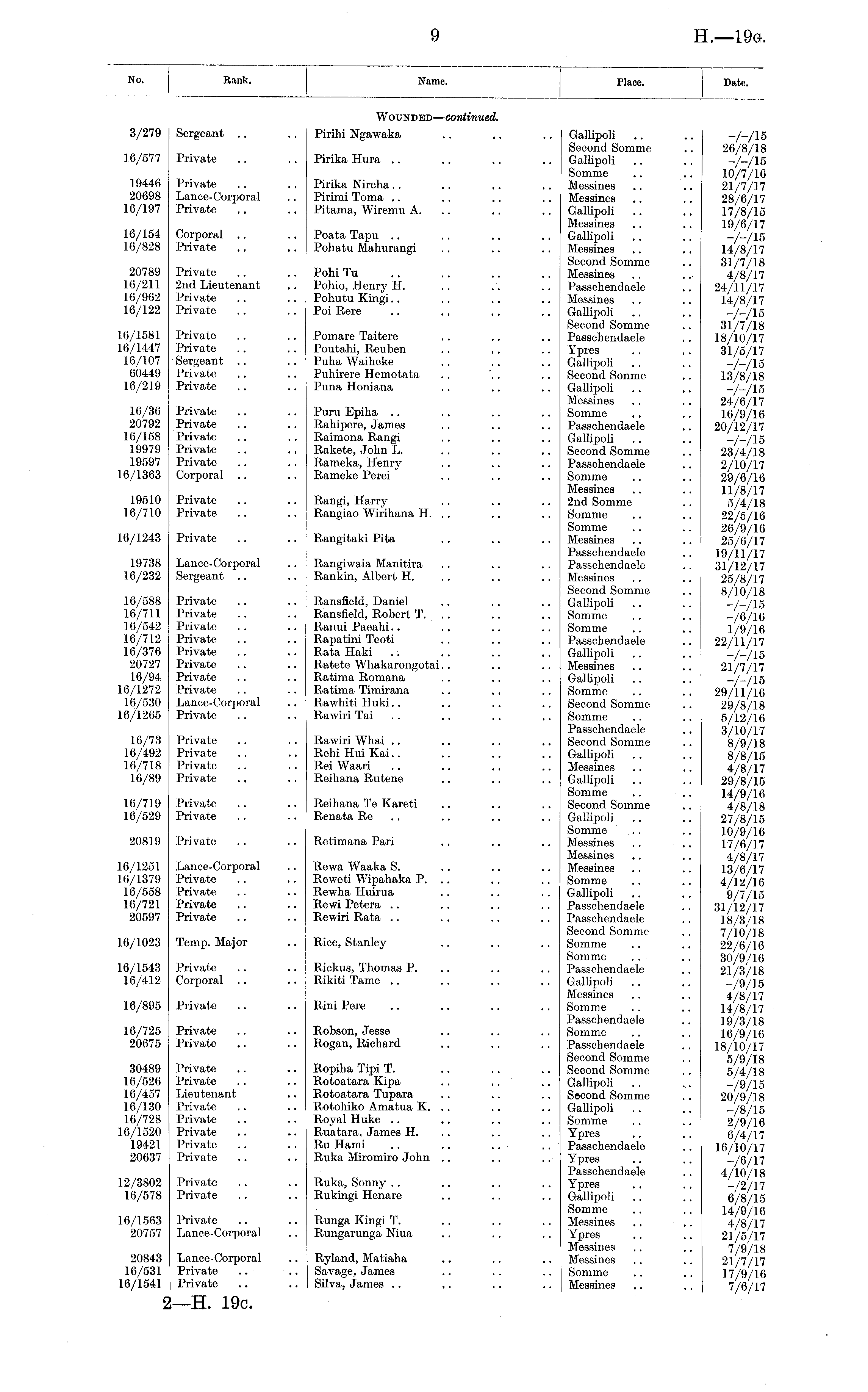 No. Hank. Name. Place. Date. Wounded,— continued. 3/279 Sergeant .. Pirihi Ngawaka Gallipoli Second Somme Gallipoli Somme Messines Messines Gallipoli Messines Gallipoli Messines Second Somme Messines Passchendaele Messines Gallipoli Second Sommo Passchendaele Ypres Gallipoli Second Sonme Gallipoli Messines Somme Passchendaele Gallipoli Second Somme Passchendaele Sommo Messines 2nd Sommo Sommo Somme Messines Passchendaele Passchendaele Messines Second Somme Gallipoli Somme Somme Passchendaele Gallipoli Messines Gallipoli Somme Second Somme Somme Passchendaele Second Somme Gallipoli Messines Gallipoli Somme Second Somme Gallipoli Somme Messines Messines Messines Somme Gallipoli Passchendaele Passchendaele Second Somme Somme Somme Passchendaele Gallipoli Messines Somme Passchendaele Somme Passchendaele Second Somme Second Somme Gallipoli Second Somme Gallipoli Somme Ypres Passchendaele Ypres Passchendaele Ypres Gallipoli Somme Messines Ypres Messines Messines Somme Messines -A/15 26/8/18 -A/15 10/7/16 21/7/17 28/6/17 17/8/15 19/6/17 -A/15 14/8/17 31/7/18 4/8/17 24/11/17 14/8/17 -A/15 31/7/18 18/1.0/17 31/5/17 -A/15 13/8/18 "A/15 24/6/17 16/9/16 20/12/17 -A/15 23/4/18 2/10/17 29/6/16 11/8/17 5/4/18 22/5/16 26/9/16 25/6/17 19/11/17 31/12/17 25/8/17 8/10/18 -/-/IB -/6/16 1/9/16 22/11/17 -A/15 21/7/17 -A/15 29/11/16 29/8/18 5/12/16 3/10/17 8/9/18 8/8/15 4/8/17 29/8/15 14/9/16 4/8/18 27/8/15 10/9/10 17/6/17 4/8/17 13/6/17 4/12/16 9/7/15 31/12/17 18/3/18 7/10/18 22/6/16 30/9/16 21/3/18 -A/15 4/8/17 14/8/17 19/3/18 16/9/16 18/10/17 5/9/18 5/4/18 -/9/15 20/9/18 -A/15 2/9/10 6/4/17 16/10/17 -A/17 4/10/18 -A/17 6/8/15 14/9/16 4/8/17 21/5/17 7/9/18 21/7/17 17/9/16 7/6/17 16/577 Private Pirika Hura 19446 20698 16/197 Private Lance-Corporal Private Pirika Nireha Pirimi Toma Pitama, Wiremu A. 16/154 16/828 Corporal Private Poata Tapu Pohatu Mahurangi 20789 10/211 16/962 16/122 Private 2nd Lieutenant Private Private PohiTu Pohio, Henry H. Pohutu Kingi Poi Rere 16/1581 16/1447 16/107 60449 16/219 Private Private Sergeant Private Private Pomare Taitere Poutahi, Reuben Puha Waiheke Puhirere Hemotata Puna Honiana 16/36 20792 16/158 19979 19597 16/1363 Private Private Private Private Private Corporal Puru Epiha Rahipere, James Raimona Rangi Rakete, John L. Rameka, Henry Rameke Perei 19510 16/710 Private Private Rangi, Harry Rangiao Wirihana H. .. 16/1243 Private Rangitaki Pita 19738 16/232 Lance-Corporal Sergeant .. Rangi waia Manitira Rankin, Albert H. 16/588 16/711 16/542 16/712 16/376 20727 16/94 16/1272 16/530 16/1265 Private Private Private Private Private Private Private Private Lance-Corporal Private liansfield, Daniel Ranslield, Robert T. Ranui Paeahi Rapatini Teoti Rata Haki Ratoto Whakarongotai Ratima Romana Ratima Timirana Rawhiti Huki.. Rawiri Tai 16/73 16/492 16/718 16/89 Private Private Private Private Rawiri Whai Rehi Hui Kai Rei Waari Reihana Rutene 16/719 16/529 Private Private Reihana Te Kareti Renata Re 20819 Private Retimana Pari 16/1251 16/1379 16/558 16/721 20597 Lance-Corporal Private Private Private Private Rewa Waaka S. Reweti Wipahaka P. Rewha Huirua Rewi Petera Rewiri Rata 16/1023 Temp. Major Rice, Stanley 16/1543 16/412 Private Corporal .. Rickus, Thomas P. Rikiti Tame 16/895 Private Rini Pere 16/725 20675 Private Private Robson, Jesse Rogan, Richard 30489 16/526 16/457 16/130 16/728 16/1520 19421 20637 Private Private Lieutenant Private Private Private Private Private Ropiha Tipi T. Rotoatara Kipa . . Rotoatara Tupara Ilotohiko Amatua K. .. Royal Huke Ruatara, James H. Ru Hami .. .. Ruka Miromiro John 12/3802 16/578 Private Private Ruka, Sonny Rukingi Henare 16/1563 20757 Private Lance-Corporal Runga Kingi T. Rungarunga Niua 20843 10/531 16/1541 Lance-Corporal Private Private Ryland, Matiaha Savage, James Silva, James ..
