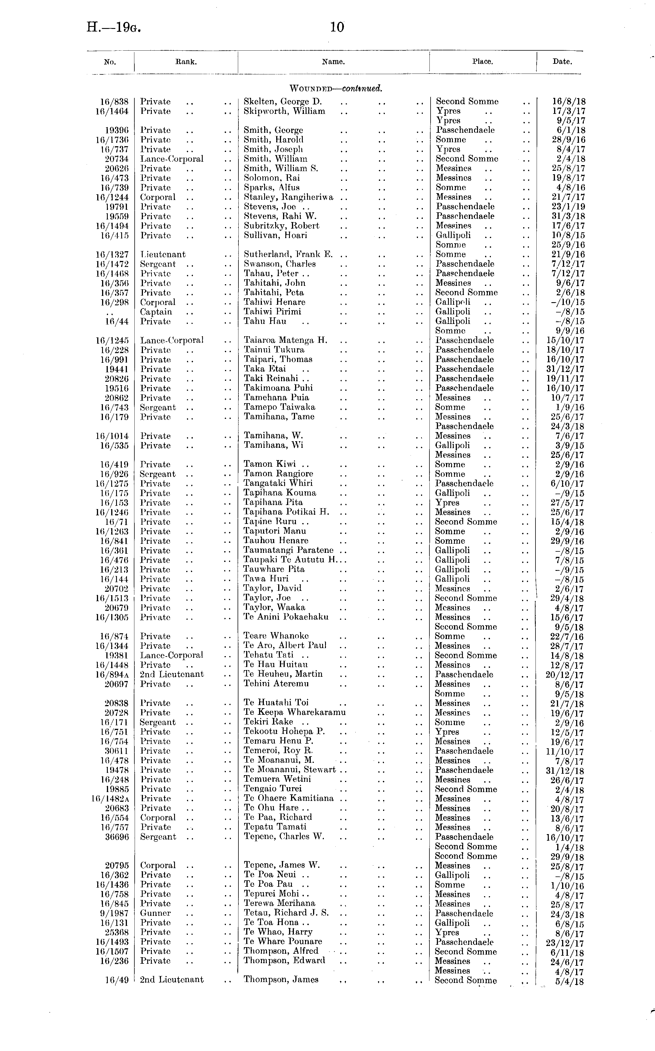 No. Rank. Name. Place. Date. Wou n ded — continued. 16/838 16/1464 Private Private Skelten, George D. Skipworth, William Second Somme Ypres Ypres Passchendaele Somme Ypres Second Somme Messines Messines Somme Messines Passchendaele Passchendaele Messines Gallipoli Somme Somme Passchendaele Passchendaele Messines Second Somme Gallipoli .. Gallipoli Gallipoli Somme Passchendaele Passchendaele Passchendaele Passchendaele Passchendaele Passchendaele Messines Somme Messines Passchendaele Messines Gallipoli Messines Somme Somme Passchendaele Gallipoli Ypres Messines Second Somme Somme Somme Gallipoli Gallipoli Gallipoli Gallipoli Messines Second Somme Messines Messines Second Somme Somme Messines Second Somme Messinos Passchendaele Messines Somme Messines Messines Somme Ypres Messines Passchendaele Messines Passchendaele Messines Second Somme Messines Messines Messines Messines Passchendaele Second Somme Second Somme Messines Gallipoli Somme Messines Messines Passchendaele Gallipoli Ypres Passchendaele Second Somme Messines Messines Second Somme 16/8/18 17/3/17 9/5/17 6/1/18 28/9/16 8/4/17 2/4/18 25/8/17 19/8/17 4/8/16 21/7/17 23/1/19 31/3/18 17/6/17 10/8/15 25/9/16 21/9/16 7/12/17 7/12/17 9/6/17 2/6/18 -/10/15 -A/is -A/15 9/9/16 15/10/17 18/10/17 16/10/17 31/12/17 19/11/17 10/10/17 10/7/17 1/9/16 25/6/17 24/3/18 7/6/17 3/9/15 25/6/17 2/9/16 2/9/16 6/10/17 -/0/15 27/5/17 25/6/17 15/4/18 2/9/16 29/9/16 -/8/15 7/8/15 -/9/15 -A/15 2/6/17 29/4/18 4/8/17 15/6/17 9/5/18 22/7/16 28/7/17 14/8/18 12/8/17 20/12/17 8/6/17 9/5/18 21/7/18 19/6/17 2/9/16 12/5/17 19/6/17 11/10/17 7/8/17 31/12/18 26/6/17 2/4/18 4/8/17 20/8/17 13/6/17 8/6/17 16/10/17 1/4/18 29/9/18 25/8/17 -/8/15 1/10/16 4/8/17 25/8/1.7 24/3/18 6/8/15 8/6/17 23/12/17 6/11/18 24/6/17 4/8/17 5/4/18 19396 16/1736 16/737 20734 20628 10/473 16/739 16/1244 19791 19559 16/1494 16/415 Private Private Private Lance-Corporal Private Private Private Corporal Private Private Private Privato Smith, George Smith, Harold .. ,. Smith, Joseph Smith, William Smith, William S. Solomon, Rai Sparks, Alius Stanley, Rangiheriwa Stevens, Joe .. Stevens, Rahi W. .. Subrit/.ky, Robert Sullivan, Hoari .. 16/1327 16/1472 16/1468 16/356 16/357 16/298 lieutenant Sergeant Private Private Private Corporal .. Captain Private Sutherland, Prank E. . . Swanson, Charles Tahau, Peter Tahitahi, John Tahitahi, Peta Tahiwi Henare Tahiwi Pirimi Tahu Hau 16/44 16/1245 16/228 16/991 19441 20826 19516 20862 16/743 16/179 Lance-Corporal Private Private Private Private Private Private Sergeant Private Taiaroa Matenga H. .. Tainiii Tukura Taipari, Thomas Taka Etai Taki Rein ah i Takimoana Piihi Tamchana I'liiti Tamepo Taiwaka Tamihana, Tame 16/1014 16/535 Private Private Tamihana, W. Tamihana, Wi 16/419 16/926 1.6/1275 16/175 16/1.53 16/1246 16/71 16/1263 16/841 16/361 16/476 16/213 16/144 20702 16/1513 20679 16/1305 Private Sergeant Private Private. Private Private Private Private Private Private Private Private Private Private Private Private Private Tamon Kiwi 'Tamon Rangiore Tangataki Whiri Tapihana Kouma Tapihana Pita Tapihana Potikai H. Tapine liuru Taputori Manu Tauhou Henare Taumatangi Paratene Taupaki Te Aututu H... Tauwhare Pita Tawa Huri .. .. Taylor, David Taylor, Joe Taylor, Waaka Te Anini Pokaehaku .. 16/874 16/1344 19381 16/1448 16/894A 20697 Private Private Lance-Corporal Privato 2nd Lieutenant Private Teare Whanoke Te Aro, Albert Paul Tohatii Tati Te, H au H uitau Te Heuheu, Martin Tehini Ateremu 20838 20728 16/171 16/751 16/754 30611 16/478 19478 16/248 19885 0/1482a 20083 16/554 16/757 36096 Private Private Sergeant Private Private Private Private Private Privato Private Private Private Corporal Private Sergeant .. Te Huatahi 'ioi Te, Keepa Wharekaramu Tekiri Rake Tekootu Hohepa P. Tern am Henu P. .. Temeroi, Roy R. Te Moananui, M. To Moananui, Stewart Temuera Wetini Tcngaio Turei Te Ohaere Kamitiana To Ohu Hare Te Paa, Richard Tepatu Tamati .. Tepene, Charles W. 20795 16/302 16/1436 16/758 16/845 9/1987 16/131 25368 16/1493 16/1507 16/236 Corporal Privato Private Privato Private Gunner Private Private Private Private Private Tepene, James W. Te Poa Neui To Poa Pau Tepurei Mohi Terewa Merihana Tetau, Richard J. S. .. Te Toa Hona Te Whao, Harry Te Whare Pounare Thompson, Alfred Thompson, Edward 16/49 2nd Lieutenant Thompson, James ,,
