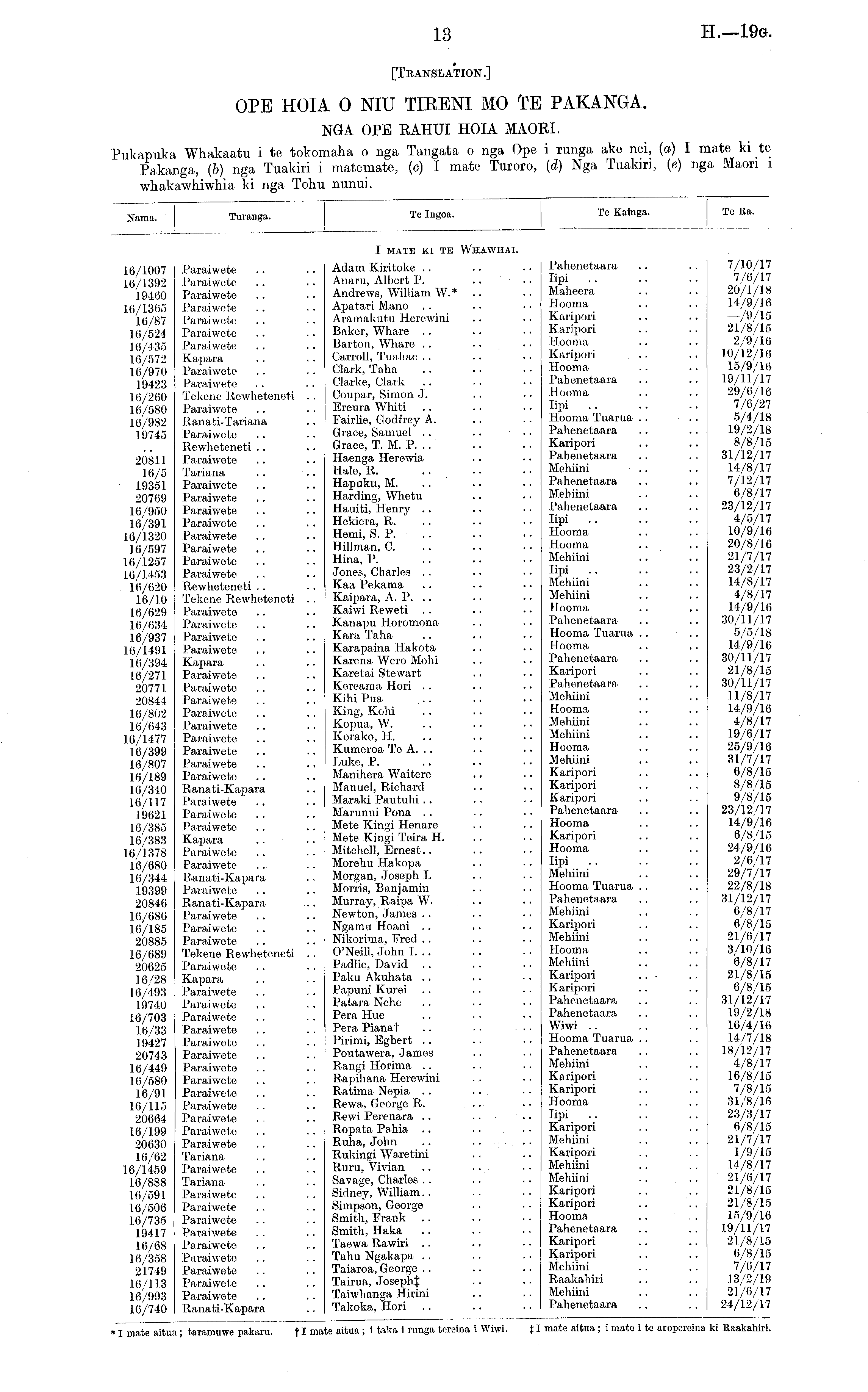 [Translation.] OPE HOIA O NIU TIRENI MO TE PAKANGA. NGA OPE RAHUI HOIA MAORI. Pukapuka Whakaatu i tE tokomaha o nga Tangata o nga Ope i runga ake nei, (a) I mate ki te Pakanga, (b) nga Tuakiri i matemate, (c) I mate Turoro, (d) Nga Tuakiri, (e) nga Maori i whakawhiwhia ki nga Tohu nunui.