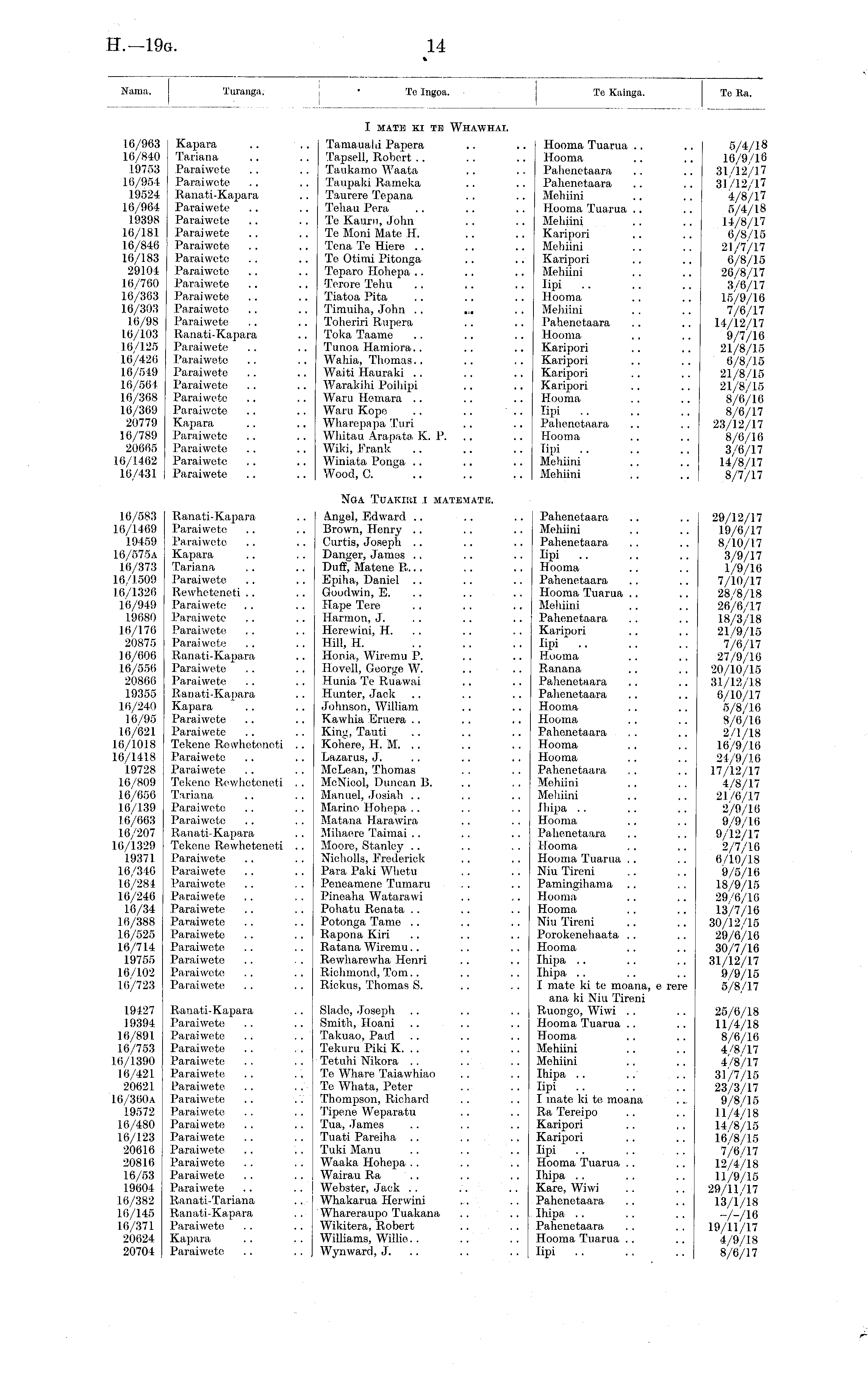 Nama. Turanga. Te Ingoa. Tc Ingoa. Te Kainga. To Ra. 16/963 Kapara 16/840 Tariana 19753 Paraiwete 16/954 Paraiwete 19524 Ranati-Kapara 16/964 Paraiwete 19398 Paraiwete 16/181 Paraiwete 16/846 Paraiwete 16/183 Paraiwete .. 29104 Paraiwete 16/760 Paraiwete .. 16/363 Paraiwete .. 16/303 Paraiwete 16/98 Paraiwete 16/103 Ranati-Kapara 10/125 Paraiwete 16/426 Paraiwete 16/519 Paraiwete .. 16/561 Paraiwete 16/368 Paraiwete .. 16/369 Paraiwete .. 20779 Kapara 16/789 Paraiwete 20665 Paraiwete 16/1462 Paraiwete 16/431 Paraiwete I MATE KI TE WHAWHAI. Tama u a hi Pa pera Tapsell, Robert Taukamo Waata Taupaki Rameka Taurcre Tepana Tehau Pera To Kauru, John Te Moni Mate II. Tcna Te Hiere To Otimi Pitonga Teparo Hohepa ■Terore Tchu Tiatoa Pita Timuiha, John . . ,„ Tohoriri Rnpera Toka Taame Tunoa Hamiora.. Wahia, Thomas Waiti Hauraki Warakihi Poihipi Waru Hemara Waru Kope Wharepapa Turi Whitau Arapata K. P. Wiki, Frank Winiata Ponga Wood, C. Hooma Tuarua Hooma Pahenetaara Pahenetaara Mehiini Hooma Tuarua Mehiini Karipori Mehiini Karipori Mehiini lipi Hooma Mehiini Pahenetaara Hooma Karipori Karipori Karipori Karipori Hooma Tipi Pahenetaara Hooma Tipi Mehiini Mehiini 5/4/1.8 16/9/16 31/12/17 31/12/17 4/8/17 5/4/18 14/8/17 6/8/15 21/7/17 6/8/1.5 26/8/17 3/6/1.7 15/9/16 7/6/17 14/12/17 9/7/16 21/8/15 6/8/15 21/8/15 21/8/15 8/6/16 8/6/1.7 23/12/17 8/6/16 3/6/17 14/8/17 8/7/17 16/583 Ranati-Kapara 1.6/1469 Paraiwete 19459 Paraiwete 16/575A Kapara 16/373 Tariana 16/1509 Paraiwete 16/1326 Rewheteneti 16/949 Paraiwete 19680 Paraiwete .. 16/176 Paraiwete, 20875 Paraiwete 16/606 Ranati-Kapara 16/556 Paraiwete 20866 Paraiwete 19355 Ranati-Kapara 16/240 Kapara 16/95 Paraiwete 16/621 Paraiwete 16/1018 Tekene Rewheteneti .. 16/1418 Paraiwete 19728 Paraiwete 16/809 Tekeno Rewheteneti . . 16/656 Tariana 16/139 Paraiwete 16/663 Paraiwete 16/207 Ranati-Kapara 10/1329 Tekene Rewheteneti .. 19371 Paraiwete 16/346 Paraiwete 16/281 Paraiwete 16/246 Paraiwete 16/34 Paraiwete 16/388 Paraiwete 1.6/525 Paraiwete .. 16/714 Paraiwete 19755 Paraiwete 16/102 Paraiwete 16A23 Paraiwete NOA TUAKIKI I MATEMATE. Pahenetaara Mehiini Pahenetaara lipi Hooma Pahenetaara Hooma Tuarua Mehiini Pahenetaara Karipori Tipi Hooma Ranana Pahenetaara Pahenetaara Hooma Hooma Pahenetaara Hooma Hooma Pahenetaara Mehiini Mehiini Ihipa Hooma Pahenetaara Hooma Hooma Tuarua Niu Tireni Pamingihama Hooma Hooma Niu Tireni Porokenehaata Hooma Ihipa Ihipa I mate ki te moana, e rere ana ki Niu Tireni Ruongo, Wiwi Hooma Tuarua Hooma Mehiini Mehiini Ihipa lipi I mate ki te moana Ra Tereipo Karipori Karipori lipi Hooma Tuarua Ihipa Kare, Wiwi Pahenetaara ihipa Pahenetaara Hooma Tuarua lipi Angel, Edward Brown, Henry Curtis, Joseph Danger, James Duff," Matene R... Epiha, Daniel Goodwin, E. Hape Tere Harmon, J. Herewini, H. Hill, H. Honia, Wiremu P. Hovell, George W. Hunia Te Ruawai Hunter, Jack Johnson, William Kawhia Eruera King, Tauti Kohere, H. M. .. Lazarus, J. McLean, Thomas McNicol, Duncan B. Manuel, Josiah Marino Hohepa Matana Harawira Mihaere Taimai Moore, Stanley Nicholls, Frederick Para Paki Whetu Peneaniene Tumaru Pineaha Watarawi Pohatu Renata Potonga Tame Rapona Kiri Ratana Wiremu Rewharowha Henri Richmond, Tom Rickus, Thomas S. 29/12/17 19/6/17 8/10/1.7 3/9/17 1/9/16 7/10/17 28/8/18 26/6/17 18/3/18 21/9/15 7/6/17 27/9/16 20/10/15 31/12/18 0/10/17 5/8/16 8/6/16 2/1/18 16/9/16 24/9/16 17/12/17 4/8/17 21/6/17 2/9/16 9/9/16 9/12/17 2/7/10 6/10/18 9/5/16 18/9/15 29/6/16 13/7/16 30/12/15 29/6/16 30/7/16 31/12/17 9/9/15 5/8/17 19427 Ranati-Kapara 19394 Paraiwete 16/891 Paraiwete 16/753 Paraiwete 16/1390 Paraiwete 16/421 Paraiwete 20621 Paraiwete 16/360A Paraiwete 19572 Paraiwete 16/480 Paraiwete 16/123 Paraiwete 20616 Paraiwete 20816 Paraiwete 16/53 Paraiwete 19604 Paraiwete 16/382 Ranati-Tariana 16/145 Ranati-Kapara 16/371 Paraiwete 20624 Kapara 20704 Paraiwete Slado, Joseph Smith, Hoani Takuao, Paul Tekuru Piki K. .. Tetuhi Nikora Te Whare Taiawhiao Te Whata, Peter Thompson, Richard Tipene Weparatu Tua, James Tuati Parciha Tuki Manu Waaka Hohepa Wairau Ra Webster, Jack . . Whakarua Herwini Whareraupo Tuakana Wikitera, Robert Williams, Willie.. Wynward, J. 25/6/18 11/4/18 8/6/16 4/8/17 4/8/17 31 A/15 23/3/1.7 9/8/15 1.1/4/18 14/8/15 16/8/15 7/6/1.7 12/4/18 11/9/15 29/11/17 13/1/18 -/-/16 19/11/17 4/9/18 8/6/17
