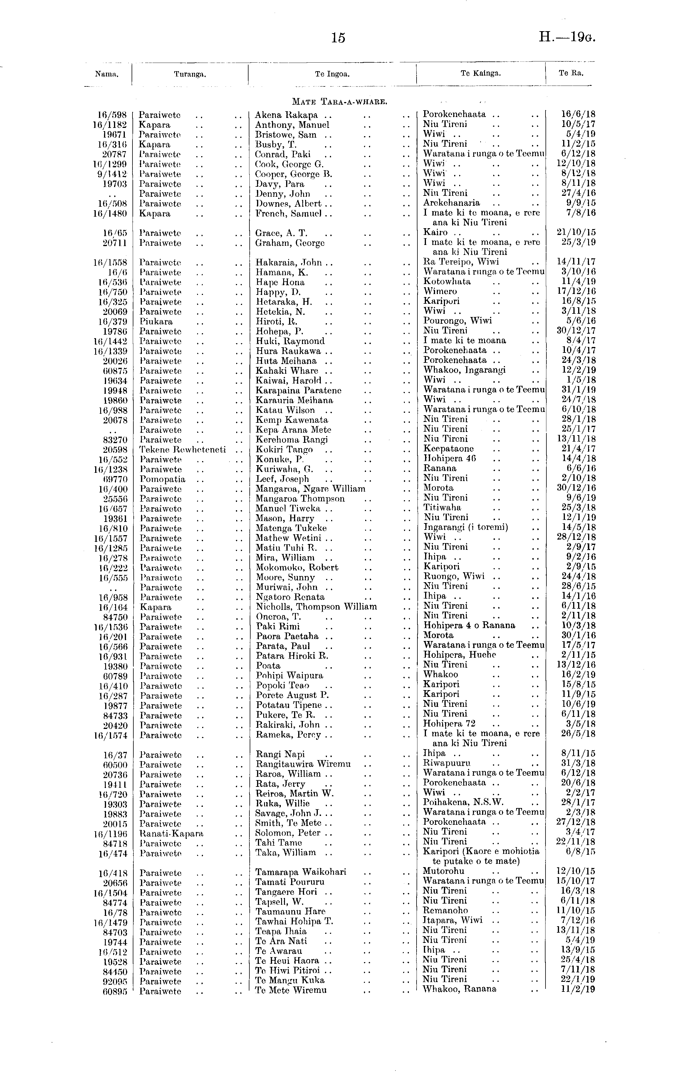 Nama. Turanga. Te Ingoa. Tc Kainga. To lla. 16/598 16/1182 19671 16/316 20787 16/1299 9/1412 19703 Paraiwete Kapara Paraiwete Kapara Paraiwete Paraiwete Paraiwete Paraiwete Paraiwete Paraiwete Kapara Mate Taea-a-wjiaee. 16/508 16/1480 16/65 20711 16/1558 16/6 16/536 16/750 16/325 20069 16/379 19786 16/1442 16/1339 20020 00875 19034 19948 19860 16/988 20678 83270 20598 10/552 16/1238 69770 16/400 25550 16/657 19361 16/810 10/'l557 16/1285 16/278 16/222 16/555 Paraiwete Paraiwete Paraiwete Paraiwete Paraiwete Paraiwete Paraiwete Paraiwete Piukara Paraiwete Paraiwete Paraiwete Paraiwete Paraiwete Paraiwete Paraiwete Paraiwete Paraiwete Paraiwete, Paraiwete Paraiwete Tekene Rewheteneti .. Paraiwete .. Paraiwete Pomopatia Paraiwete Paraiwete Paraiwete Paraiwete Paraiwete Paraiwete Paraiwete Paraiwete Paraiwete Paraiwete Paraiwete Paraiwete Kapara Paraiwete Paraiwete Paraiwete Paraiwete Paraiwete Paraiwete Paraiwete Paraiwete Paraiwete Paraiwete Paraiwete Paraiwete Paraiwete Akena liakapa Anthony, Manuel Bristowe, Sam Busby, T. Conrad, Paki Cook, George G. Cooper, George B. Davy, Para Denny, John Downes, Albert French, Samuel Grace, A. T. Graham, George llakaraia, John Hamana, K. Hape Hona Happy, D. Hetaraka, H. Hetekia, N. Hiroti, R. Hohepa, P. lluki, Raymond Hura liaukawa Huta Meihana Kahaki Whare Kaiwai, Harold Karapaina Paratene Karauria Meihana Katau Wilson Kemp Kawenata Kepa Arana Mete Kerehoma Rangi Kokiri Tango Konuke, P. Kuriwaha, G. Leef, Joseph Mangaroa, Ngare William Mangaroa Thompson Manuel Tiwcka Mason, Harry Matenga 'I'ukeke Mathew Wetini Matiu Tuhi R. .. Mira, William Mokomoko, Robert Moore, Sunny Muriwai, John Ngatoro Renata Nicholls, Thompson William Oncroa, T. Paki Rimi Paora Paetaha Parata, Paul Patara Hiroki R. Poata Pohipi Waipura Popoki Teao Porete August P. Potatau Tipene Pukere, Te li. .. Rakiraki, John Rameka, Percy Rangi Napi Rangitauwira Wiremu Raroa, William Rata, Jerry Reiroa, Martin W. Ruka, Willie Savage, John J. .. Smith, Te Mete Solomon. Peter Tahi Tame Taka, William Tamarapa Waikohari Tamati Poururu Tangaere Hori Tapsell, W. Tauinaunu Hare Tawhai Hohipa T. Teapa Ihaia Te Ara Nati Te Awarau Te Heui Haora Te Hiwi Pitiroi Te Mangu Kuka Te Mete Wiremu .. Porokenehaata .. .. 16/6/18 .. Niu Tireni .. .. 10/5/17 .. Wiwi .. .. .. 5/4/19 .. Niu Tireni .. .. 11/2/15 Waratana i runga o te Teemu 6/12/18 .. Wiwi .. .. .. 12/10 18 .. Wiwi .. .. .. 8/12/18 .. Wiwi .. .. .. 8/11/18 . . Niu Tireni .. .. 27/4/16 Arekehanaria .. .. 9/9/15 I mate ki te moana, e rere 7/8/16 ana ki Niu Tireni .. Kairo .. .. .. 21/10/15 1 mate ki te moana, e rere 25/3/19 ana ki Niu Tireni .. Ra Tereipo, Wiwi .. 14/11/17 Waratana i rivngao te Teemu 3/10/16 .. Kotowhata .. .. 11/4/19 .. Wimero .. .. 17/12/16 .. Karipori .. .. 16/8/15 .. Wiwi .. .. .. 3/11/18 Pourongo, Wiwi .. 5/6/16 . . Niu Tireni .. .. 30/12/17 I mate ki te moana .. 8/4/17 Porokenehaata .. .. 10/4/17 Porokenehaata .. .. 24/3/18 Whakoo, Ingarangi .. 12/2/19 .. Wiwi .. .. .. 1/5/18 Waratana i runga o te Teemu 31/1/19 .. Wiwi .. .. .. 24/7/18 Waratana i runga ote Teemu 6/10/18 .. Niu Tireni .. .. 28/1/18 .. Niu Tireni .. .. 25/1/17 .. Niu Tireni .. .. 13/11/18 Keepataone .. .. 21/4/17 .. Hohipera 46 .. .. 14/4/18 Ranana .. .. 6/6/16 .. Niu Tireni . . .. 2/10/18 .. Morota .. .. 30/12/16 .. Niu Tireni .. .. 9/6/19 .. Titiwaha .. .. 25/3/18 .. Niu Tireni .. .. 12/1/19 Ingarangi (i toremi) .. 14/5/18 .. Wiwi ,. .. .. 28/12/18 . . Niu Tireni .. .. 2/9/17 .. Ihipa .. .. .. 9/2/16 .. Karipori .. .. 2/9/15 .. Ruongo, Wiwi .. .. 24/4/18 .. Niu Tireni .. .. 28/6/15 .. Ihipa .. .. .. 14/1/16 .. Niu Tireni .. .. 6/11/18 .. Niu Tireni .. .. 2/11/18 Hohipera 4 o Ranana .. 10/3/18 .. Morota .. .. 30/1/16 Waratana i runga o te Teemu 17/5/17 .. Hohipera, I luetic .. 2/11/15 .. Niu Tireni .. .. 13/12/16 .. Whakoo .. .. 16/2/19 .. Karipori .. .. 15/8/15 .. Karipori .. .. 11/9/1.5 .. Niu Tireni .. .. 10/6/19 .. Niu Tireni .. .. 6/11/18 .. Hohipera 72 .. .. 3/5/18 I mate ki te moana, e rere 26/5/18 ana ki Niu Tireni .. Ihipa .. .. .. 8/11/15 .. Riwapuuru . . .. 31/3/18 Waratana i runga o te Teemu 6/12/18 .. Porokenehaata .. .. 20/6/18 .. Wiwi .. .. .. 2/2/17 .. Poihakcna, N.S.W. .. 28/1/17 Waratana i runga o te Teemu 2/3/18 Porokenehaata .. .. 27/12/18 . . Niu Tireni .. . . 3/4^7 .. Niu Tireni .. .. 22/11/18 Karipori (Kaore c mohiotia 6/8/15 te putake o te mate) .. Mutorohu .. .. 12/10/15 Waratana i runga o te Teemu 15/10/17 .. Niu Tireni .. .. 16/3/18 .. Niu Tireni .. .. 6/11/18 .. Remanoho .. .. 11/10/15 .. Ita para, Wiwi .. .. 7/12/16 .. Niu Tireni .. .. 13/11/18 .. Niu Tireni .. .. 5/4/19 .. Ihipa .. .. .. 13/9/15 .. Niu Tireni .. .. 25/4/18 .. Niu Tireni .. .. 7/11/18 .. Niu Tireni .. .. 22/1/19 .. Whakoo, Ranana .. 11/2/19 1.6/958 16/164 84750 16 1536 16/201 16/566 16/931 19380 60789 16/410 16/287 19877 84733 20420 16/1574 16/37 60500 20736 19411 16/720 19303 19883 20015 16/1196 84718 16/474 Paraiwete Paraiwete Paraiwete Paraiwete Paraiwete Paraiwete Paraiwete Paraiwete Ranati-Kapara Paraiwete Paraiwete 16/418 20656 16/1504 84774 16/78 16/1479 84703 19744 16/512 19528 84450 92095 60895 Paraiwete Paraiwete Paraiwete Paraiwete Paraiwete Paraiwete Paraiwete Paraiwete Paraiwete Paraiwete Paraiwete Paraiwete Paraiwete