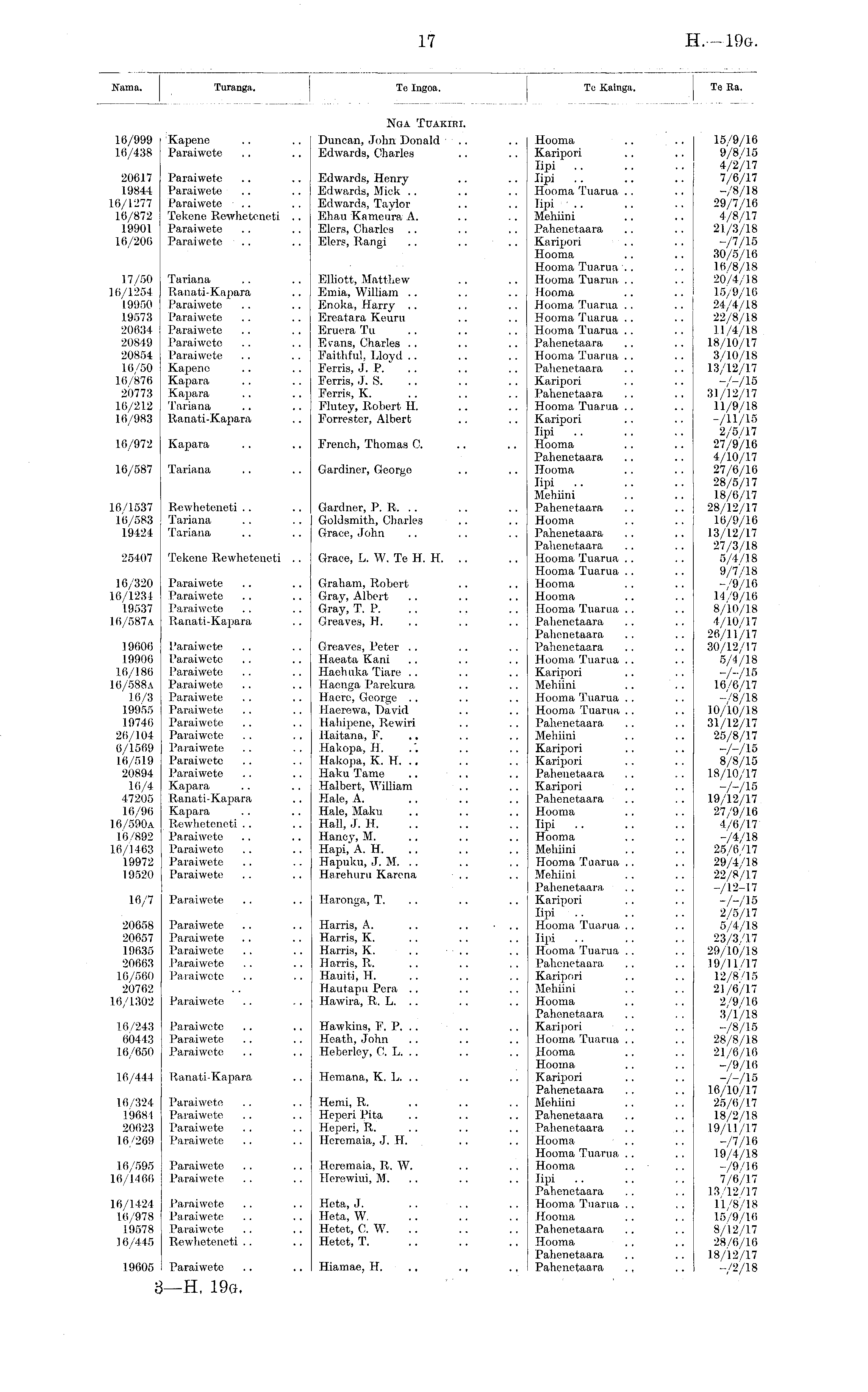 Nama. Turanga. Te Ingoa. Te Kainga. To Ra. 16/999 Kapene 10/438 Paraiwete NOA TUAKIRI. 15/9/16 9/8/15 4/2/17 7/6/17 -A/18 29/7/16 4/8/17 21/3/18 -A/15 30/5/16 16/8/18 20/4/18 15/9/16 24/4/18 22/8/18 11/4/18 18/10/17 3/10/18 13/12/17 -A/15 31/12/17 11/9/18 -/11/15 2/5/17 27/9/10 4/10/17 27/6/16 28/5/17 18/6/17 28/12/17 16/9/16 13/12/17 27/3/18 5/4/18 9/7/18 -/9/16 11/9/16 8/10/18 4/10/17 26/11/17 30/12/17 5/4/18 -A/15 1.6/6/17 -A/18 10/10/18 31/12/17 25/8/17 -A/15 8/8/15 18/10/17 -A/15 19/12/1.7 27/9/16 4/6/17 -/4-/18 25/6/17 29/4/18 22/8/17 -/12-17 -A/15 2/5/17 5/4/18 23/3/17 29/10/18 19/11/17 12/8/15 21/6/17 2/9/16 3/1/18 -A/15 28/8/18 21/6/10 -/9/1-6 -A/15 16/10/17 25/6/17 18/2/18 19/11/17 -A/16 19/4/18 -/9/16 7/6/17 13/12/17 11/8/18 15/9/16 8/12/17 28/6/16 18/12/17 -/%/n 20617 Paraiwete 19844 Paraiwete 16/1277 Paraiwete 10/872 Tekene Rewheteneti .. .19901 Paraiwete 16/206 Paraiwete 17/50 Tariana 16/1254 Ranati-Kapara 19950 Paraiwete 19573 Paraiwete 20634 Paraiwete 20849 Paraiwete 20854 Paraiwete 16/50 Kapene 16/876 Kapara 20773 Kapara. 16/212 Tariana 16/983 Ranati-Kapara 16/972 Kapara 16/587 Tariana 16/1537 Rewheteneti 16/583 Tariana 19424 Tariana 25407 Tekene Rewheteneti .. 16/320 Paraiwete 16/1234 Paraiwete 19537 Paraiwete 10/587A Ranati-Kapara 19606 Paraiwete 19906 Paraiwete 16/186 Paraiwete 16/588A Paraiwete 1.6/3 Paraiwete 1.9955 Paraiwete 19746 Paraiwete 26/104 Paraiwete 6/1569 Paraiwete 16/519 Paraiwete 20894 Paraiwete 16/4 Kapara 47205 Ranati-Kapara 16/96 Kapara 16/590A Rewheteneti 16/892 Paraiwete 16/1463 Paraiwete 19972 Paraiwete 19520 Paraiwete .. Duncan, John Donald Edwards, Charles Edwards, Henry Edwards, Mick Edwards, Taylor Ehau Kameura A. Elers, Charles Elers, Rangi Elliott, Matthew Emia, William Enoka, Harry Ereatara Keuru Eruera Tu Evans, Charles Faithful, Lloyd Ferris, J. P. Ferris, J. S. Eerris, K. Flutey, Robert H. Forrester, Albert French, Thomas C. Gardiner, George Gardner, P. Ii. Goldsmith, Charles Grace, John Grace, L. W. Te H. H. Graham, Robert Gray, Albert Gray, T. P. Greaves, H. Greaves, Peter Haeata Kani Haehuka Tiare Hacnga Parekura Haero, George Haerewa, David Habipene, Rewiri Haitana, F. Hakopa, H. .". Hakopa, K. H. Haku Tame Halbert, William Hale, A. Hale, M:aku Hall, J. 11. Hancy, M. Hapi, A. H. Hapuku, J. M. .. Harchuru Karena Haronga, T. Harris, A. Harris, K. Harris, K. .. Harris, R. Hauiti, H. Ilautapu Pera Hawira, Ii. L. .. Hawkins, F. P. . . Heath, John Hebcrlcy, 0. L. .. Hemana, K. L. .. Semi, R. Heperi Pita Heperi, R. Hcremaia, J. PI. Heremaia, R. W. Herewiui, M. . . Heta, J. Heta, W. Hetet, C. W. Hetet, T. Hiamae, H. Hooma Karipori lipi .. lipi Hooma Tuarua .. lipi Mehiini Pahenetaara Karipori Hooma Hooma Tuarua . . Hooma Tuarua .. Hooma Hooma Tuarua . . Hooma Tuarua .. Hooma Tuarua .. Pahenetaara Hooma Tuarua .. Pahenetaara Karipori Pahenetaara Hooma Tuarua .. Karipori lipi Hooma Pahenetaara Hooma lipi Mehiini Pahenetaara Hooma Pahenetaara Pahenetaara Hooma Tuarua . . Hooma Tuarua .. Hooma Hooma Hooma Tuarua .. Pahenetaara Pahenetaara Pahenetaara Hooma Tuarua .. Karipori Mehiini Hooma Tuarua . . Hooma Tuarua .. Pahenetaara Mehiini Karipori Karipori Pahenetaara Karipori Pahenetaara Hooma lipi Hooma Mehiini Hooma Tuarua .. Mehiini Pahenetaara Karipori lipi Hooma Tuarua . . lipi Hooma Tuarua . . Pahenetaara Karipori Mehiini Hooma Pahenetaara Karipori Hooma Tuarua . . Hooma Hooma Karipori Pahenetaara Mehiini Pahenetaara Pahenetaara Hooma Hooma Tuarua . . Hooma Tipi Pahenetaara Hooma Tuarua . . Hooma Pahenetaara Hooma Pahenetaara Pahenetaara 16/7 Paraiwete 20658 Paraiwete 20657 Paraiwete 19635 Paraiwete 20663 Paraiwete 16/560 Paraiwete 20762 10/1302 Paraiwete 1.6/243 Paraiwete 60443 Paraiwete 16/650 Paraiwete 16/444 Ranati-Kapara 16/324 Paraiwete 19681 Paraiwete 20623 Paraiwete 16/269 Paraiwete 16/595 Paraiwete Hi/1466 Paraiwete 16/1424 Paraiwete 16/978 Paraiwete 19578 Paraiwete 16/445 Rewheteneti 19605 Paraiwete