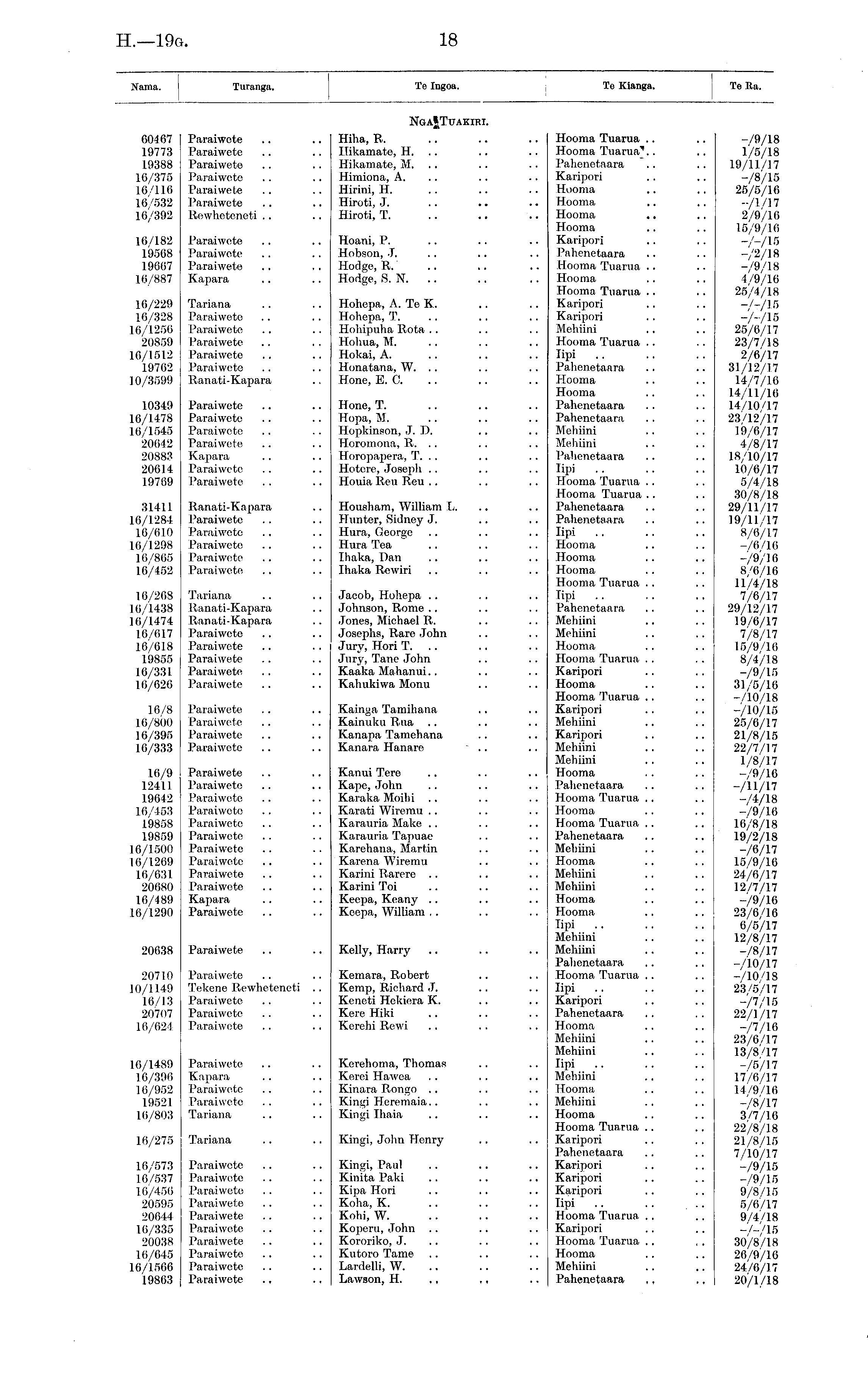 Nama. Turanga. Te Ingoa. To Kianga. TeRa. NgaJTuakibi. 60467 19773 19388 16/375 16/116 16/532 16/392 Paraiwete Paraiwete Paraiwete Paraiwete Paraiwete Paraiwete Rewheteneti Hiha, R. Hikamate, H. .. Hikamate, M. . . Himiona, A. Hirini, H. Hiroti, J. Hiroti, T. Hooma Tuarua .. Hooma Tuarua'.. Pahenetaara Karipori Hooma Hooma Hooma Hooma Karipori Pahenetaara Hooma Tuarua .. Hooma Hooma Tuarua .. Karipori Karipori Mehiini Hooma Tuarua .. Tipi Pahenetaara Hooma Hooma Pahenetaara Pahenetaara Mehiini Mehiini Pahenetaara lipi Hooma Tuarua .. Hooma Tuarua . . Pahenetaara Pahenetaara lipi Hooma Hooma Hooma Hooma Tuarua .. Tipi Pahenetaara Mehiini Mehiini Hooma Hooma Tuarua . . Karipori Hooma Hooma Tuarua .. Karipori Mehiini Karipori Mehiini Mehiini Hooma Pahenetaara Hooma Tuarua .. Hooma Hooma Tuarua .. Pahenetaara Mehiini Hooma Mehiini Mehiini Hooma Hooma Tipi Mehiini Mehiini Pahenetaara Hooma Tuarua .. lipi Karipori Pahenetaara Hooma Mehiini Mehiini lipi Mehiini Hooma Mehiini Hooma Hooma Tuarua .. Karipori Pahenetaara Karipori Karipori Karipori lipi Hooma Tuarua .. Karipori Hooma Tuarua .. Hooma Mehiini Pahenetaara ,, -/9/18 1/5/18 19/11/17 -/8/15 25/5/16 -/1./17 2/9/16 15/9/16 -/-/15 -A/18 -/9/18 4/9/16 25/4/18 -A/15 -A/15 25/6/17 28/7/18 2/6/n 31/12/17 14/7/16 14/11/16 14/10/17 23/12/17 19/6/1.7 4/8/17 18/10/17 10/6/17 5/4/18 30/8/18 29/11/17 19/11/17 8/6/1.7 -/6/16 -/9/16 8/6/16 11/4/18 7/6/17 29/12/17 19/6/17 7/8/17 15/9/16 8/4/18 -A/15 31/5/16 -710/18 -/10/15 25/6/17 21/8/15 22/7/17 1/8/17 -/9/16 AH/17 -/4/18 -/9/16 16/8/18 19/2/18 -A/17 15/9/16 24/6/17 12/7/17 "A/16 23/6/16 6/5/17 12/8/17 -/8/17 -/10/17 -710/18 23/5/17 -A/15 22/1/17 -A/16 23/6/17 13/8/17 -/5/17 17/6/17 14/9/16 -A/17 3/7/16 22/8/18 21/8/15 7/10/17 -A/15 -A/15 9/8/15 5/6/17 9/4/18 -A/15 30/8/18 26/9/16 24/6/17 20A/18 16/182 19568 19667 16/887 Paraiwete Paraiwete Paraiwete Kapara Hoani, P. Hobson, J. Hodge, R. Hodge, S. N. .. 16/229 16/328 16/1256 2085!) 16/1512 19762 10/3599 Tariana Paraiwete Paraiwete Paraiwete Paraiwete Paraiwete Ranati-Kapara Hohepa, A. Te K. Hohepa, T. Hohipuha Rota Hohua, M. Hokai, A. Honatana, W. Hone, E. 0. 10349 16/1478 16/1545 20042 20883 20614 19769 Paraiwete Paraiwete Paraiwete Paraiwete Kapara Paraiwete Paraiwete Hone, T. Hopa, M. Hopkinson, J. D. Horomona, R. .. Horopapera, T. .. Hotore, Josejih Houia lieu Reu 31411 16/1284 16/610 16/1298 16/865 16/452 Ranati-Kapara Paraiwete Paraiwete Paraiwete Paraiwete Paraiwete Housham, William L. Hunter, Sidney J. Hura, George Hura Tea Ihaka, Dan Ihaka Rewiri 16/268 16/1438 16/1474 1.6/617 16/618 19855 16/331 16/626 Tariana Ranati-Kapara lianati-Kapara Paraiwete Paraiwete Paraiwete Paraiwete Paraiwete Jacob, Hohepa Johnson, Rome Jones, Michael R. Josephs, Rare John Jury, Hori T. .. Jury, Tane John Kaaka M'ahanui.. Kahukiwa Monu 16/8 16/800 16/395 16/333 Paraiwete Paraiwete Paraiwete Paraiwete Kainga Tamihana Kainuku liua Kanapa Tamehana Kanara Hanare 16/9 12411 19642 1.6/453 19858 19859 16/1500 16/1269 16/631 20680 16/489 16/1290 Paraiwete Paraiwete Paraiwete Paraiwete Paraiwete Paraiwete Paraiwete Paraiwete Paraiwete Paraiwete Kapara Paraiwete Kanui Tere Kape, John Karaka Moihi Karati Wiremu Karauria Make Karauria Tapuae Karehana, Martin Karena Wiremu Karini Rarero Karini Toi Keepa, Keany Keepa, William 20638 Paraiwete Kelly, Harry 20710 10/1149 16/13 20707 16/624: Paraiwete Tekene Rewheteneti .. Paraiwete Paraiwete Paraiwete Kemara, Robert Kemp, Richard J. Keneti Hekiera K. Kere Hiki Kerehi Rewi 16/1489 16/396 16/952 19521 16/803 Paraiwete Kapara Paraiwete Paraiwete Tariana Kerehoma, Thomas Kerei Hawea Kinara Kingi Heremaia.. Kingi Ihaia 16/275 Tariana Kingi, John Henry 16/573 16/537 16/456 20595 20644 16/335 20038 16/645 16/1566 19863 Paraiwete Paraiwete Paraiwete Paraiwete Paraiwete Paraiwete Paraiwete Paraiwete Paraiwete Paraiwete Kingi, Paul Kinita Paki Kipa Hori Koha, K. Kohi, W. Koperu, John Kororiko, J. Kutoro Tame Lardelli, W. Lawson, H. ., ,,
