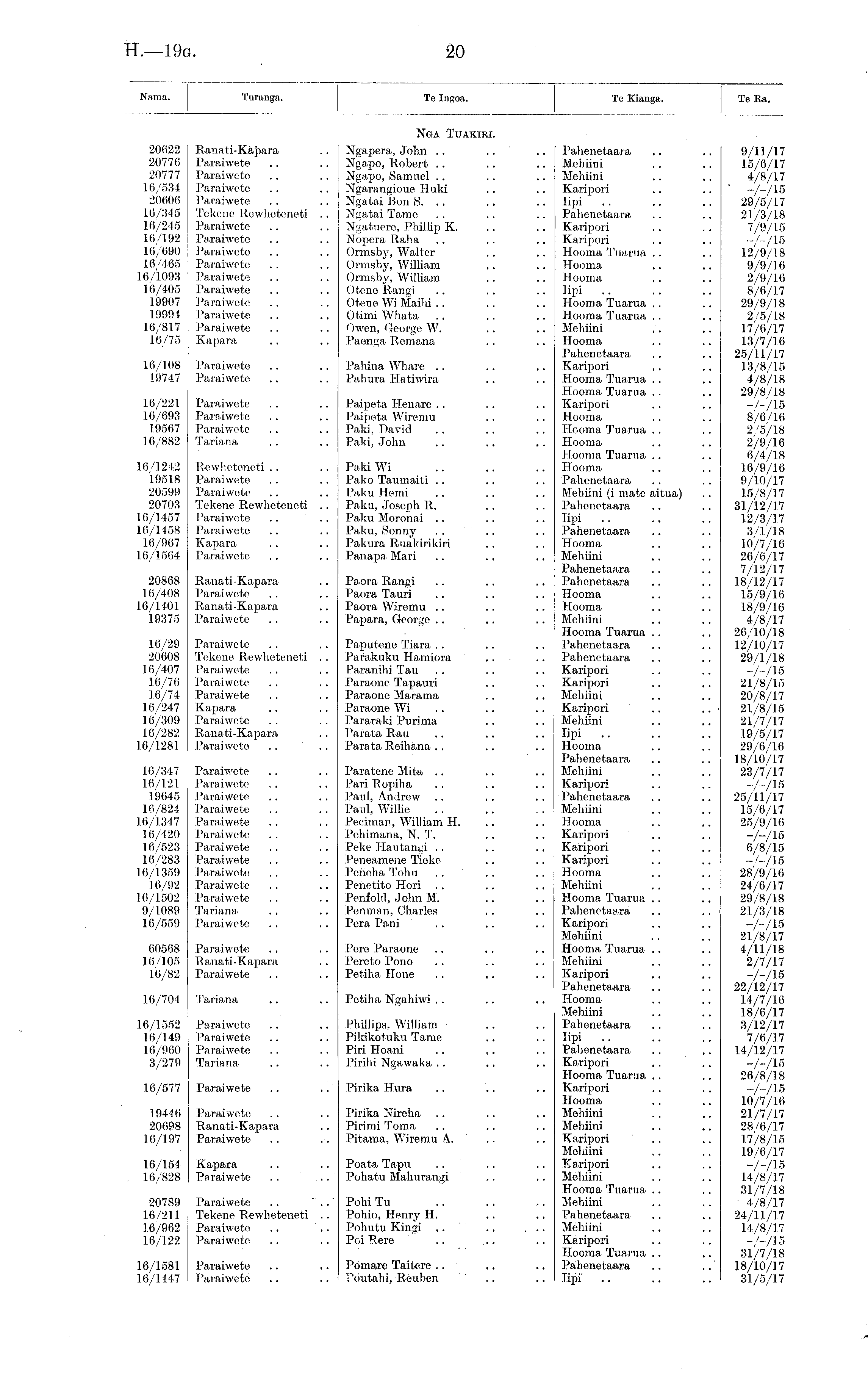 Nama. Turanga. Te Ingoa. Te Ingoa. To Kianga. Te Ra. NOA TlIAKIRI. 20622 Ranati-Kapara .. Ngapera, John 20776 Paraiwete .. . . Ngapo, Robert 20777 Paraiwete .. .. Ngapo, Samuel 16/534 Paraiwete .. .. Ngarangioue Huki 20606 Paraiwete .. .. Ngatai Bon S. .. 16/345 Tekene Rewheteneti .. Ngatai Tame 16/245 Paraiwete .. . . Ngatuere, Phillip K. 16/192 Paraiwete .. .. N opera Rah a 16/690 Paraiwete .. . . Ormsby, Walter 16/465 Paraiwete . . . . Ormsby, William 16/1093 Paraiwete . . . . Ormsby, William 16/405 Paraiwete .. .. Otene Rangi 19907 Paraiwete .. .. Otene Wi Maihi .. 19991 Paraiwete .. .. Otimi Whata 16/817 Paraiwete .. . . Owen, George W. 16/75 Kapara .. .. Paenga Romana Pahenetaara Mehiini Mehiini Karipori lipi Pahenetaara Karipori Karipori Hooma Tuarua . . Hooma Hooma lipi Hooma Tuarua .. Hooma 'Tuarua .. Mehiini Hooma Pahenetaara Karipori Hooma Tuarua .. Hooma Tuarua .. Karipori Hooma Hooma Tuarua . . Hooma Hooma Tuarua .. Hooma Pahenetaara Mehiini (i mate aitua) Pahenetaara lipi Pahenetaara Hooma Mehiini Pahenetaara Pahenetaara Hooma Hooma Mehiini Hooma Tuarua . . Pahenetaara Pahenetaara Karipori Karipori Mehiini Karipori Mehiini lipi Hooma Pahenetaara Mehiini Karipori Pahenetaara Mehiini Hooma Karipori Karipori Karipori Hooma Mehiini Hooma Tuarua .. Pahenetaara Karipori Mehiini Hooma Tuarua .. Mehiini Karipori Pahenetaara Hooma Mehiini Pahenetaara Tipi Pahenetaara Karipori Hooma Tuarua . . Karipori Hooma Mehiini Mehiini Karipori Mehiini Karipori Mehiini Hooma Tuarua .. Mehiini Pahenetaara Mehiini Karipori Hooma Tuarua .. Pahenetaara Tipi 9/11/17 15/6/17 4/8/17 ~/-/15 29/5/17 21/3/18 7/9/15 -/-/IB 12/9/18 9/9/16 2/9/16 8/6/17 29/9/18 2/5/18 17/6/17 13/7/16 25/11/17 13/8/15 4/8/18 29/8/18 -/-/IB 8/6/16 2/5/18 2/9/16 6/4/18 16/9/16 9/10/17 15/8/17 31/12/17 12/3/17 3/1/18 10/7/16 26/6/17 7/12/17 18/12/17 15/9/16 18/9/16 4/8/17 26/10/18 12/10/17 29/1/18 -A/15 21/8/15 20/8/17 21/8/15 21/7/17 19/5/1.7 29/6/16 18/10/17 23/7/17 -/-/IB 25/11/17 15/6/17 25/9/16 -A/15 6/8/15 -A/15 28/9/16 24/6/17 29/8/18 21/3/18 -A/15 21/8/17 4/11/18 2/7/17 -A/15 22/12/17 14/7/10 18/6/17 3/12/17 7/6/1.7 14/12/17 -A/15 26/8/18 -A/15 10/7/16 21/7/17 28/6/17 17/8/15 19/6/17 -A/15 14/8/17 31/7/18 ' 4/8/17 24/11/17 14/8/17 -/-/15 31/7/18 18/10/17 31/5/17 16/108 Paraiwete .. .. Pahina Whare .. 19747 Paraiwete .. . . Pahura Hatiwira 16/221 Paraiwete .. .. Paipeta Henare 16/693 Paraiwete .. .. Paipeta Wiremu 19567 Paraiwete . . .. Paid, David 16/882 Tariana .. .. Paid, John 16/1242 Rewheteneti .. .. Paid Wi 19518 Paraiwete . . .. Pako Taumaiti 20599 Paraiwete .. .. Paku Hemi 20703 Tekene Rewheteneti .. Paku, Joseph R. 16/1457 Paraiwete .. . . Paku Moronai 16/1458 Paraiwete .. . . Paku, Sonny 16/967 Kapara . . . . Pakura Ruakirikiri 16/1564 Paraiwete .. .. Pariapa Mari 20868 Ranati-Kapara .. Paora Rangi 16/408 Paraiwete .. .. Paora Tauri 16/1101 Ranati-Kapara .. Paora Wiremu .. 19375 Paraiwete . . . . Papara, George 16/29 Paraiwete .. . . Paputene Tiara 20608 Tekene Rewheteneti . . Parakuku Hamiora 10/407 Paraiwete .. .. Paranihi Tau 16/76 Paraiwete .. . . Paraone Tapauri 16/74 Paraiwete .. . . Paraone Marama 16/247 Kapara. .. .. Paraone Wi 16/309 Paraiwete . . .. Pararaki Purinia 10/282 Ranati-Kapara . . Parata Ran 1.6/1281 Paraiwete .. .. Parata Reihana .. 16/347 Paraiwete .. .. Paratene Mita 16/1.21 Paraiwete .. . . Pari Ropiha 19645 Paraiwete .. .. Paul, Andrew .. 16/824 Paraiwete .. .. Paul, Willie 16/1347 Paraiwete . . .. Peeiman, William H. 16/420 Paraiwete .. .. Pehimana, N. T. 16/523 Paraiwete . . .. Peke Hautangi 16/283 Paraiwete .. .. Peneamene Tieke 16/1359 Paraiwete .. .. Peneha Tohu .. 16/92 Paraiwete .. .. Penetito Hori 16/1502 Paraiwete .. .. Penfold, John M. 9/1089 Tariana . . . . Penman, Charles 16/559 Paraiwete . . .. Pera Pani 60568 Paraiwete .. . . Pere Paraone 16/105 Ranati-Kapara .. Pereto Pono 16/82 Paraiweto .. .. Petiha Hone 16/704 Tariana .. .. Petiha Ngahiwi 16/1552 Paraiweto .. .. Phillips, William 16/149 Paraiwete .. .. Pikikotuku Tame 16/960 Paraiwete .. .. Piri Hoani 3/279 Tariana .. .. Pirihi Ngawaka 16/577 Paraiwete .. .. Pirika Hura 19416 Paraiwete .. .. Pirika Nireha 20698 Ranati-Kapara .. Pirimi Toma 16/197 Paraiwete .. .. Pitama, Wiremu A. 16/154 Kapara .. .. Poata Tapu 16/828 Paraiwete . . . . Pohatu Mahurangi 20789 Paraiwete . . " .." Pohi Tu 16/211 Tekene Rewheteneti .. Pohio, Henry H. 16/962 Paraiweto .. .. Pohutu Kingi 16/122 Paraiwete .. .. Poi Rere 16/1581 Paraiwete .. .. Pomare Taitere 16/1147 Paraiwete .. .. Poutahi, Reuben