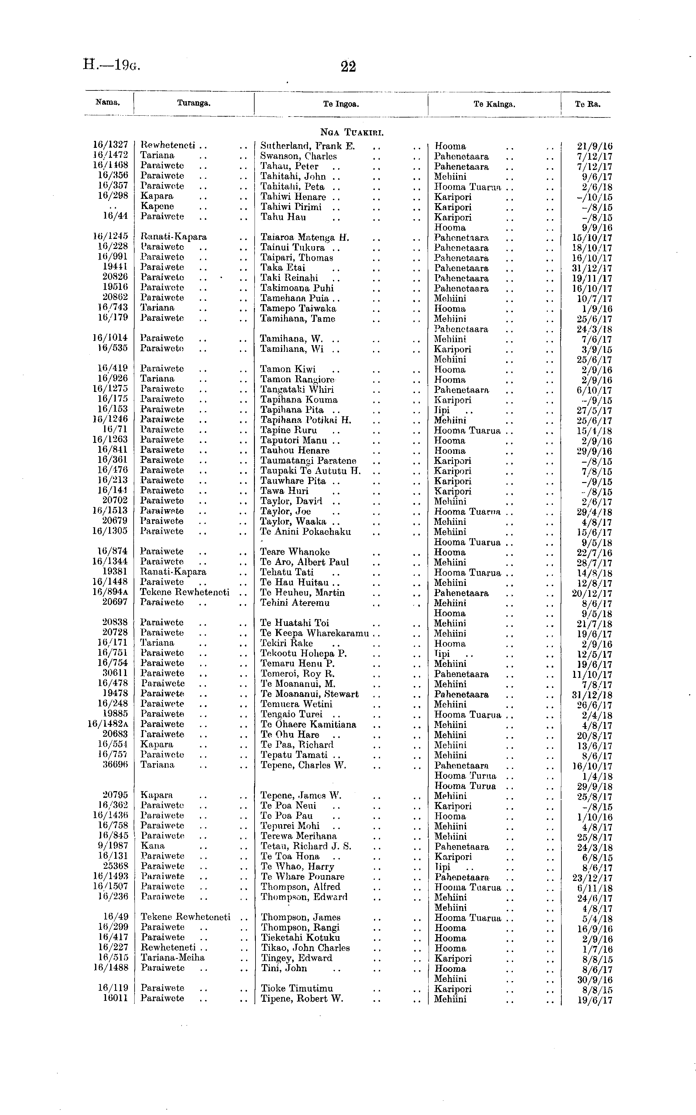 Nama. Turanga. Te Ingoa. Te Kainga. Te Ra. 10/1327 16/1472 16/1168 16/356 16/357 16/298 Rewheteneti Tariana Paraiwete Paraiwete Paraiwete Kapara Kapene Paraiwete Nga Tuakiri. Hooma Pahenetaara Pahenetaara Mehiini Hooma Tuarua .. Karipori Karipori Karipori Hooma Pahenetaara Pahenetaara Pahenetaara Pahenetaara Pahenetaara Pahenetaara Mehiini Hooma Mehiini Pahenetaara Mehiini Karipori Mehiini Hooma Hooma Pahenetaara Karipori Tipi Mehiini Hooma Tuarua . . Hooma Hooma Karipori Karipori Karipori Karipori Mehiini Hooma Tuarua .. Mehiini Mehiini Hooma Tuarua .. Hooma Mehiini Hooma Tuarua .. Mehiini Pahenetaara Mehiini Hooma Mehiini Mehiini Hooma Tipi Mehiini Pahenetaara Mehiini Pahenetaara Mehiini Hooma Tuarua . . Mehiini Mehiini Mehiini Mehiini Pahenetaara Hooma Ttirua .. Hooma Turua .. Mehiini Karipori Hooma Mehiini Mehiini Pahenetaara Karipori lipi Pahenetaara Hooma Tuarua .. Mehiini Mehiini Hooma Tuarua .. Hooma Hooma Hooma Karipori Hooma Mehiini Karipori Mehiini 21/9/16 7/12/17 7/12/17 9/6/17 2/6/18 -/10/15 -/8/15 -/8/15 9/9/16 15/10/17 18/10/17 16/10/17 31/12/17 19/11/17 16/10/17 10/7/17 1/9/16 25/6/17 24/3/18 7/6/17 3/9/15 25/6/17 2/9/16 2/9/16 6/10/17 -/9/15 27/5/17 25/6/17 15/4/18 2/9A6 29/9/16 -A/15 7/8/15 -A/15 -78/15 2/6/17 29/4/18 4/8/17 15/6/17 9/5/18 22/7/16 28/7/17 14/8/18 12/8/17 20/12/17 8/6/17 9/5/18 21/7/18 19/6/17 2/9/1.6 12/5/17 19/0/17 11/10/17 7/8/17 31/12/18 20/6/17 2/4/18 4/8/17 20/8/17 13/6/17 8/6/17 16/10/17 1/4/18 29/9/18 25/8/17 78/15 1/10/16 4/8/17 25/8/17 24/3/18 6/8/15 8/6/17 23/12/17 6/11/18 24/6/17 4/8/17 5/4/18 16/9/16 2/9/16 1/7/16 8/8/15 8/6/17 30/9/16 8/8/15 19/6/17 Sutherland, Frank E. Swanson, Charles Tahau, Peter Tahitahi, John Tahitahi, Peta Tahiwi Henare Tahiwi Pirimi Tahu Hau 16/44 16/1245 16/228 16/991 19441 20826 19516 20862 16/743 16/179 Ranati-Kapara Paraiwete Paraiwete Paraiwete Paraiwete Paraiwete Paraiwete 'Tariana Paraiwete Taiaroa Matenga H. Tainui Tukura Taipari, Thomas Taka Etai Taki Reinahi Takimoana Puhi Tamehana Puia Tamcpo Taiwaka Tamihana, Tame 16/1014 16/535 Paraiwete Paraiwete Tamihana, W. .. Tamihana, Wi 10/419 16/926 16/1275 16/175 16/153 16/1246 16/71 16/1263 16/811 16/361 1.6/470 16/213 16/141 20702 16/1513 20679 16/1305 Paraiwete Tariana Paraiwete Paraiwete Paraiwete Paraiwete Paraiwete Paraiwete Paraiwete Paraiwete Paraiwete Paraiwete Paraiwete Paraiwete Paraiwete Paraiwete Paraiwete Tamon Kiwi Tamon liangiore Tangataki Whiri Tapihana Kouma Tajiihana Pita Tapihana Potikai H. Tapine Ruru Taputori Mann Tauhou Henare Taumatangi Paratene Taupaki To oiututu H. Tauwhare Pita Tawa Huri Taylor, David Taylor, Joe Taylor, Waaka Te Anini Pokaehaku 16/874 16/1344 19381 16/1448 16/894A 20697 Paraiwete Paraiwete, lianati-.Kapara Paraiwete Tekene Rewheteneti .. Paraiweto Teare Whanoke Te Aro, Albert Paul Tehatu Tati Te Hau Huitau To Heuheii, Martin Tehini Ateremu 20838 20728 10/171 16/751 16/754 30011 16/478 19478 16/248 19885 16/1482A 20683 16/551 16/757 36696 Paraiwete Paraiwete 'Tariana Paraiwete Paraiweto Paraiwete Paraiwete Paraiwete Paraiwete Paraiwete Paraiwete Paraiwete Kapara Paraiwete Tariana Te H uatahi Toi Te Keepa Wharekaramu Tekiri Rake Tekootu Hohepa P. Temaru Henu P. Temeroi, Roy R. Te Moananui, M. Te Moananui, Stewart Temuera Wetini Tengaio Turei Te Ohaere Kamitiana Te Ohu Hare Te Paa, Richard Tepatu Tamati Tepene, Charles W. 20795 16/362 16/1436 16/758 16/845 9/1987 16/131 25368 16/1493 16/1507 16/236 Kapara Paraiwete Paraiwete Paraiwete Paraiwete Kana Paraiwete Paraiwete Paraiwete Paraiwete Paraiwete Tepene, James W. Te Poa Neui Te Poa Pau Tepurei Mohi Terewa Merihana Tetau, Richard J. S. Te Toa Hona Te Whao, Harry Te Whare Pounare Thompson, Alfred Thompson, Edward 16/49 16/299 16/417 16/227 16/515 16/1488 Tekene Rewheteneti .. Paraiwete Paraiwete Rewheteneti Tariana-Meiha Paraiwete Thompson, James Thompson, Rangi Tieketahi Kotuku Tikao, J ohn Charles Tingey, Edward Tini, John 16/119 16011 Paraiwete Paraiwete Tioke Timutimu Tipene, Robert W.