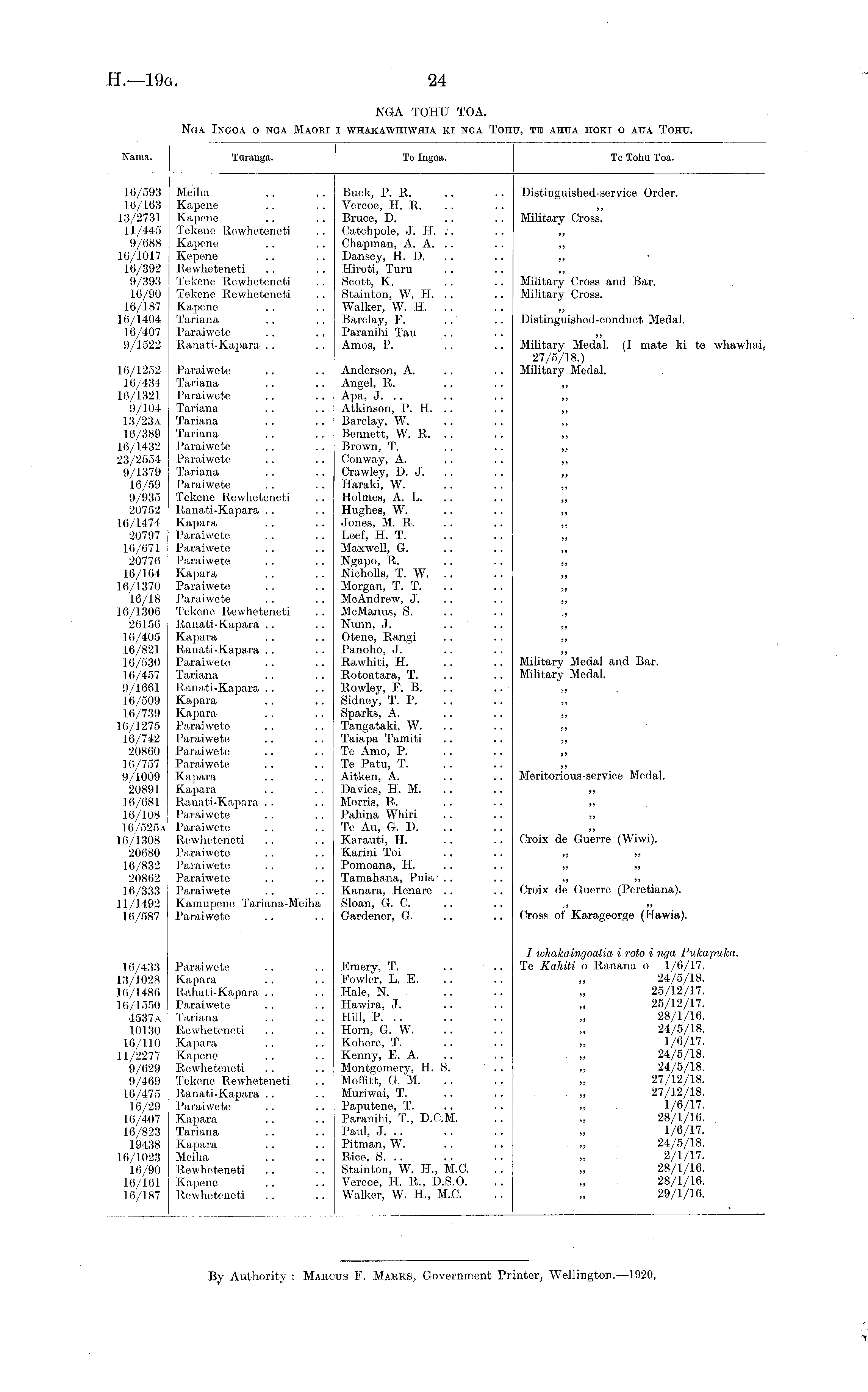Nama. Turauga. Te Ingoa. Te Tolm Toa. 16/593 16/163 13/2731 1.1/445 9/688 16/1017 10/392 9/393 16/90 16/187 16/1404 10/407 9/1522 Meiha Kapene Kapene Tekene Rewheteneti Kapene Kepene Rewheteneti Tekene Rewheteneti Tekene Rewheteneti Kapene Tariana Paraiwete Ranati-Kapara .. Buck, P. R. Vercoe, H. R. Bruce, D. Catch pole, J. H. .. Chapman, A. A. Dansey, II. D. Hiroti, Turu Scott, K. Stainton, W. H. .. Walker, W. H. .. Barclay, E. Paranihi Tan Amos, P. Distinguished-service Order. Military Cross. Military Cross and Bar. Military Cross. Distinguished-conduct Medal. Military Medal. (1 mate ki te whawhai, 27/5/18.) Military Medal. 16/1252 16/434 16/1321 9/104 13/23A 10/389 16/1432 23/2554 9/1379 16/59 9/935 20752 10/1474 20797 16/671 20770 16/164 16/1370 16/18 16/1300 26156 16/405 16/821 16/530 16/457 9/1661 16/509 16/739 16/1275 16/742 20800 16/757 9/1009 20891 10/681 16/108 16/525a 16/1308 20680 16/832 20862 16/333 11/1492 16/587 Paraiwete Tariana Paraiwete Tariana 'Tariana Tariana Paraiwete Paraiwete Tariana Paraiwete Tekene Rewheteneti Ranati-Kapara Kapara Paraiwete Paraiwete Paraiwete Kapara Paraiwete Paraiwete Tekene Rewheteneti Ranati-Kapara Kapara Ranati-Kapara Paraiwete Tariana Ranati-Kapara Kapara Kapara Paraiwete Paraiwete Paraiwete Paraiwete Kapara Kapara Ranati-Kapara Paraiwete Paraiwete Rewheteneti Paraiwete Paraiwete Paraiwete Paraiwete Kamupene Tariana-Meiha Paraiwete Anderson, A. Angel, R, Apa, J. .. Atkinson, P. H. .. Barclay, W. Bennett, W. R. Brown, T. Conway, A. Crawley, D. J. Haraki, W. Holmes, A. L. Hughes, W. Jones, M. R. Leef, H. T. Maxwell, G. Ngapo, R. Nicholls, T. W. .. Morgan, 'I. T. McAndrew, J. McManus, S. Nurm, J. Otene, Rangi Panoho, J. Rawhiti, H. Rotoatara, T. Rowley, F. B. Sidney, T. P. Sparks, A. Tangataki, W. Taiapa Tamiti To Amo, P. Te Patu, T. Aitken, A. Davies, H. M. Morris, R. Pahina Whiri Te Au, G. I). Karauti, 11. Karini Toi Pomoana, H. Tamahana, Puia .. Kanara, Henare .. Sloan, G. C. Gardener, GMilitary Medal and Bar-. Military Medal. 5. Meritorious-service Medal. Croix de Guerre (Wiwi). 5, >> Croix de Guerre (Peretiana). Cross of Karageorge (Hawia). 16/433 3/1028 6/1486 6/1550 4537a 10130 10/110 1/2277 9/629 9/469 1.6/475 16/29 16/407 16/823 19438 .6/1023 1.6/90 16/161 16/187 Paraiwete Kapara Ranati-Kapara Paraiwete Tariana Rewheteneti Kapara Kapene Rewheteneti Tekene Rewheteneti Ranati-Kapara Paraiwete Kapara Tariana Kapara Meiha Rewheteneti Kapene Rewheteneti Emery, T. Fowler, L. E. Hale, N. Hawira, J. Hill, P. .. Horn, G. W. Kohere, T. Kenny, E. A. Montgomery, H. S. Moffitt, G. 'M. Muriwai, T. Paputene, T. Paranihi, T., D.C.M. Paul, J. Pitman, W. Rice, S. .. Stainton, W. H., M.C. Vercoe, H. R., D.S.O. Walker, W. H., M.C. / whakaingoatia i roto i nga Pukapuka. Te Kahili o Ranana o 1/6/17. 24/5/18. 25/12/17. 25/12/17. 28/1/16. 24/5/18. 1/6/17. 24/5/18. 24/5/18, 27/12/18. 27/12/18. 1/6/17. 28/1/16. 1/6/17. 24/5/18. 2/1/17. 28/1/16. 28/1/16. 29/1/16.