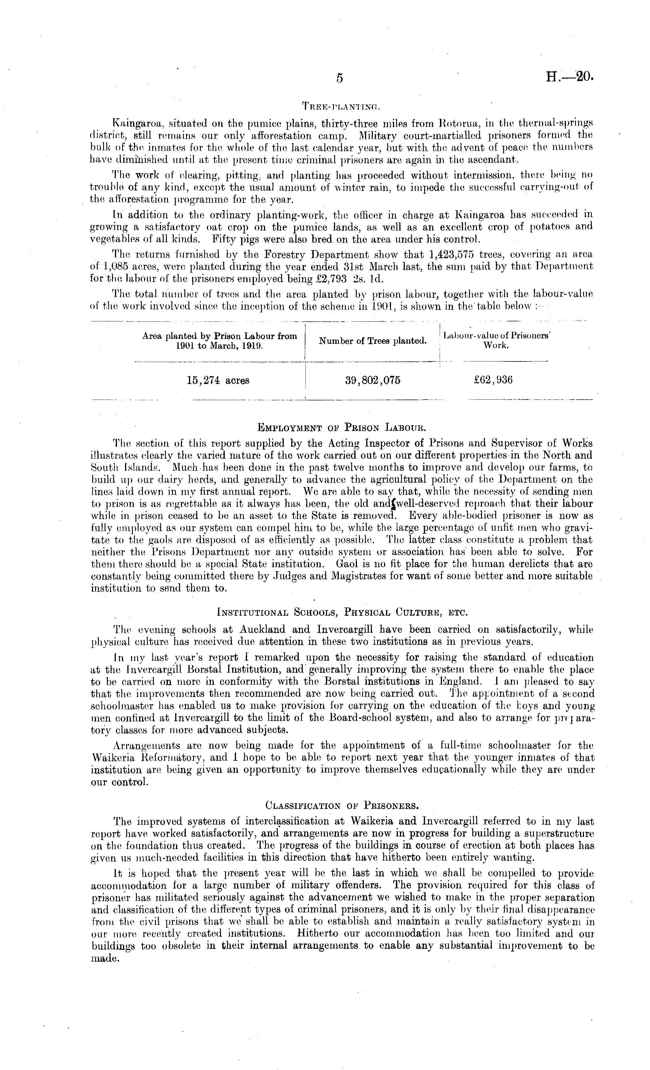 i Area planted by Prison Labour from AT , c * , , Labour-value oi Prisoners' 1901 to March, 1919. Number of Trees planted. WoT . k 15,274 acres 39,802,075 £62,936