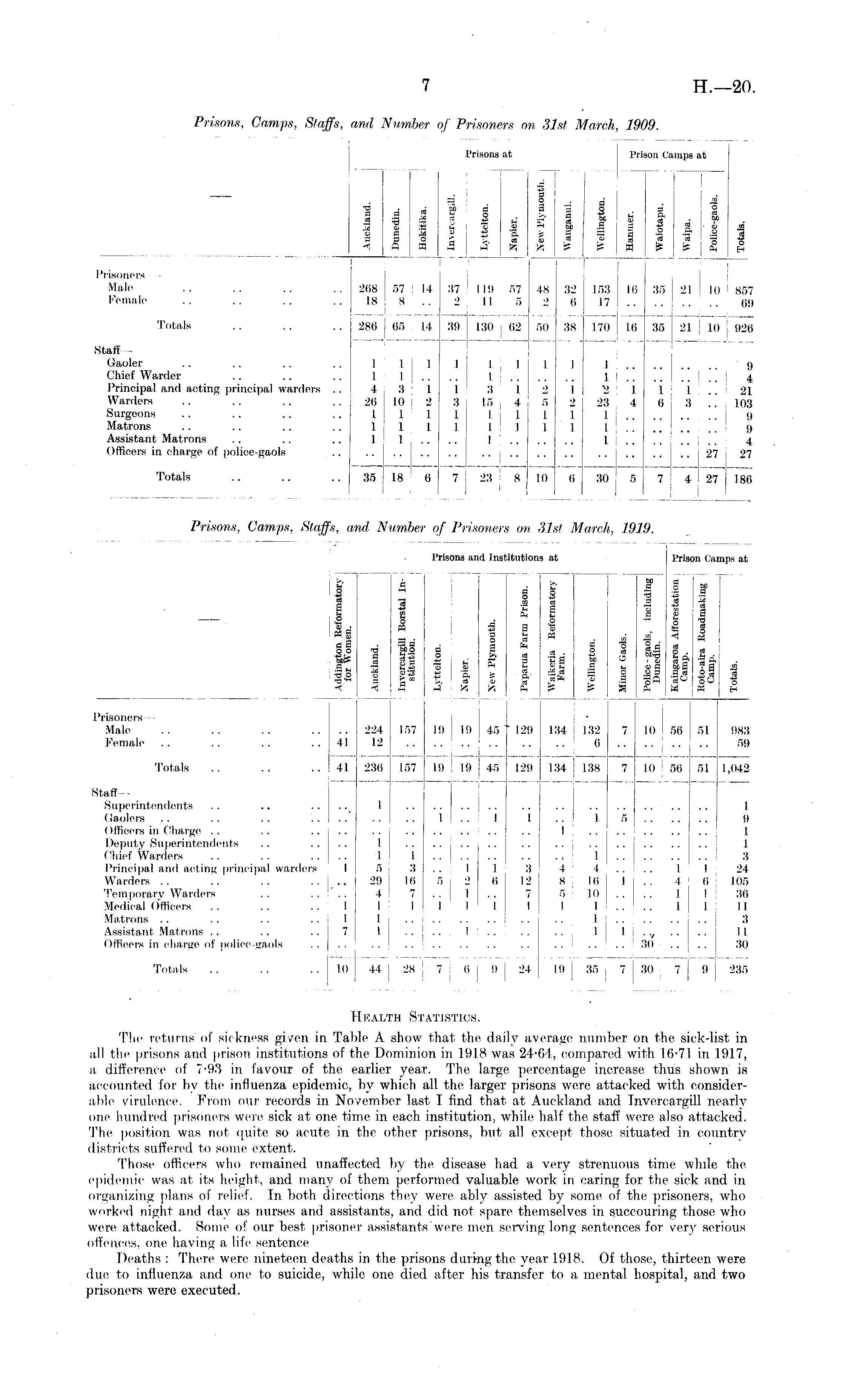 Health Statistics. The returns of sic 'kness given in Table A show that the daily average number on the sick-list in all the prisons and prison institutions of the Dominion in 1918 was 24-61, compared with 16-71 in 1917, a difference of 7-93 in favour of the earlier year. The large percentage increase thus shown is accounted for by the influenza epidemic, by which all the larger prisons were attacked with considerable virulence. From our records in November last I find that at Auckland and Invercargill nearly one hundred prisoners were sick at one time in each institution, while half the staff were also attacked. The position was not quite so acute in the other prisons, but all except those situated in, conntrv districts suffered to some extent. Those officers who remained unaffected by the disease had a very strenuous time while the epidemic was at its height, and many of them performed valuable work in caring for the sick and in organizing pla.ns of relief. In both directions they were ably assisted by some of the prisoners, who worked night and day as nurses and assistants, and did not spare themselves in succouring those who were attacked. Some of our best prisoner assistants were men serving long sentences for very serious offences, one having a life sentence Deaths : There were, nineteen deaths in the prisons during the year 1918. Of those, thirteen were due to influenza and one to suicide, while one died after his transfer to a mental hospital, and two prisoners were executed.