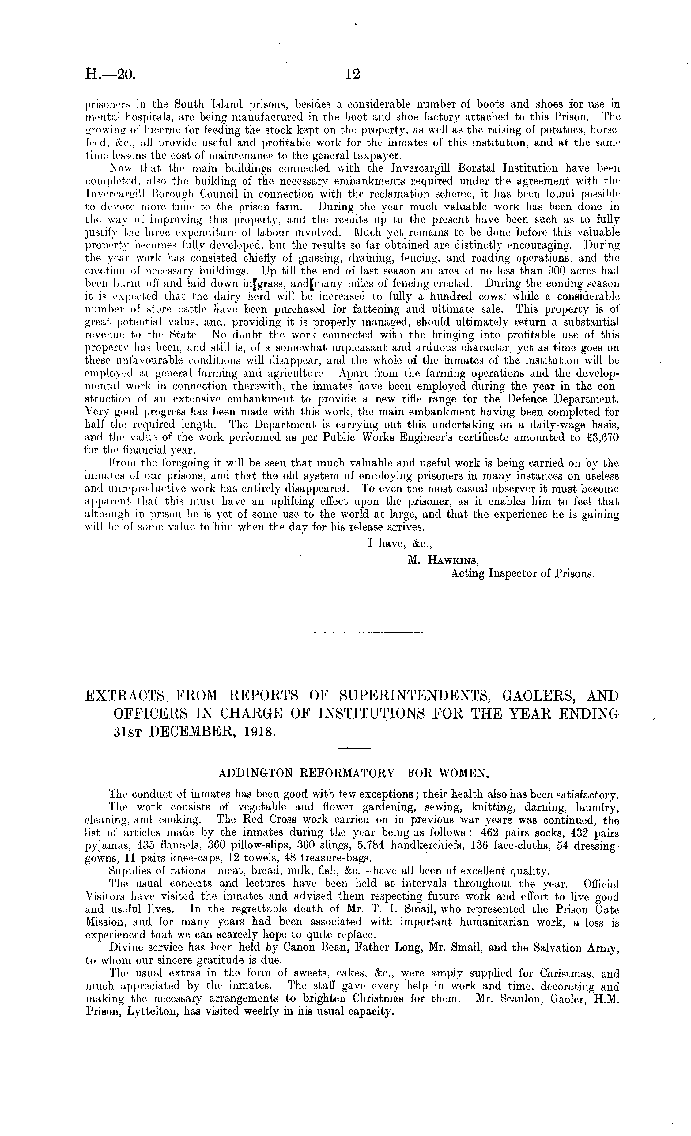 EXTRACTS FROM REPORTS OF SUPERINTENDENTS, GAOLERS, AND OFFICERS IN CHARGE OF INSTITUTIONS FOR THE YEAR ENDING 31st DECEMBER, 1918. ADDINGTON REFORMATORY FOR WOMEN. The conduct of inmates has been good with few exceptions ; their health also has been satisfactory. The work consists of vegetable and flower gardening, sewing, knitting, darning, laundry, cleaning, and cooking. The Red Cross work carried on in previous war years was continued, the list of articles made by the inmates during the year being as follows : 462 pairs socks, 432 pairs pyjamas, 435 flannels, 360 pillow-slips, 360 slings, 5,784 handkerchiefs, 136 face-cloths, 54 dressinggowns, 11 pairs knee-caps, 12 towels, 48 treasure-bags. Supplies of rations —meat, bread, milk, fish, &c. —have all been of excellent quality. The usual concerts and lectures have been held at intervals throughout the year. Official Visitors have visited the inmates and advised them respecting future work and effort to live good and useful lives. In the regrettable death of Mr. T. I. Smail, who represented the Prison Gate Mission, and for many years had been associated with important humanitarian work, a loss is experienced that we can scarcely hope to quite, replace. Divine service has been held by Canon Bean, Father Long, Mr. Smail, and the Salvation Army, to whom our sincere gratitude is due. The usual extras in the form of sweets, cakes, &c, were amply supplied for Christmas, and much appreciated by the inmates. The staff gave, every help in work and time, decorating and making the necessary arrangements to brighten Christmas for them. Mr. Scanlon, Gaoler, H.M. Prison, Lyttelton, has visited weekly in his usual capacity.