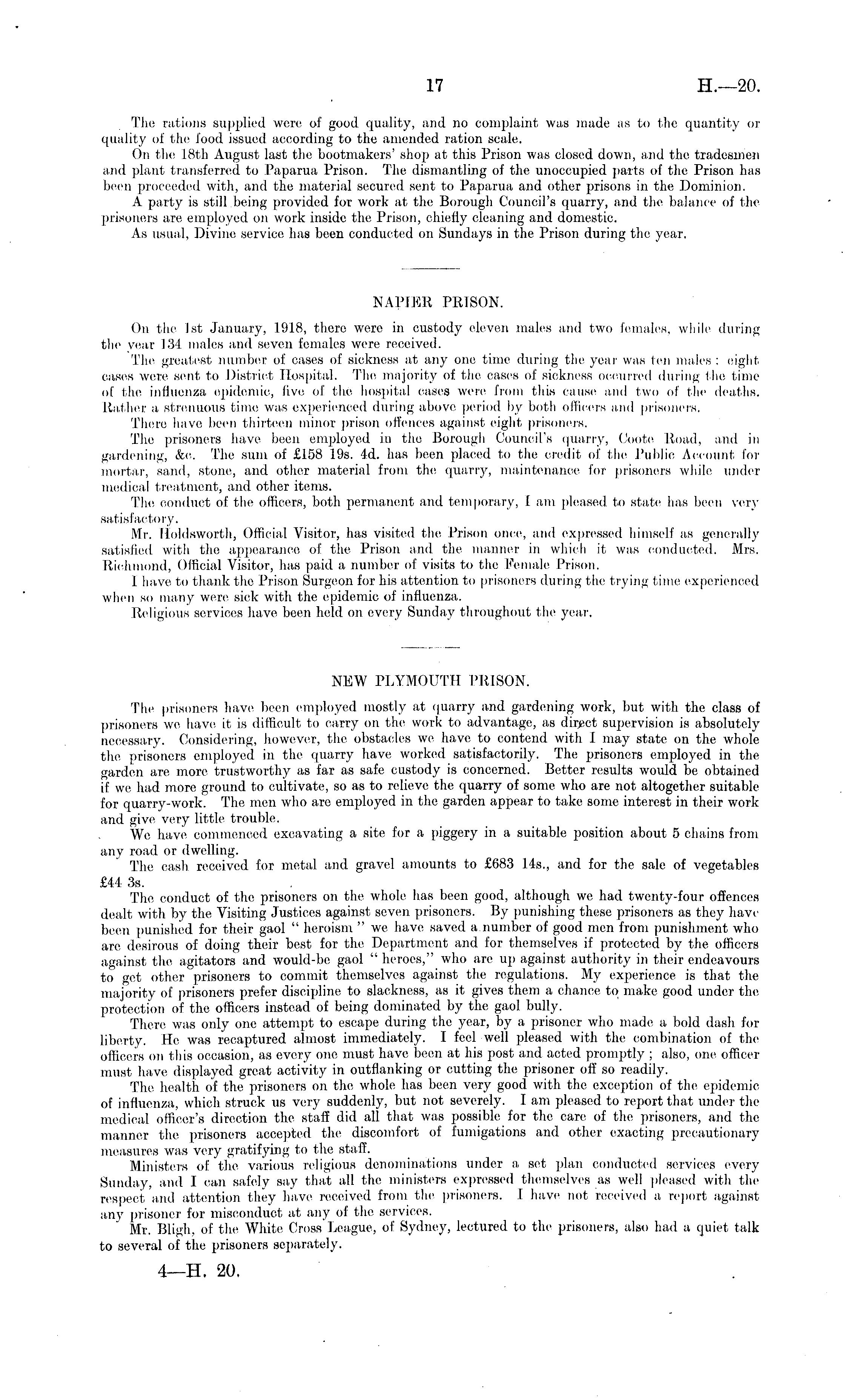 The rations supplied were of good quality, and no complaint was made as to the quantity or quality of the food issued according to the amended ration scale. On the I.Bth August last the bootmakers' shop at this Prison was closed down, and the tradesmen and plant transferred to Paparua Prison. The dismantling of the unoccupied parts of the Prison has been proceeded with, and the material secured sent to Paparua and other prisons in the Dominion. A party is still being provided for work at the Borough Council's quarry, and the balance of the prisoners are employed on work inside the, Prison, chiefly cleaning and domestic. As usual, Divine service has been conducted on Sundays in the Prison during the year. NAPIER PRISON. On the Ist January, 1918, there were in custody eleven males and two females, while (luring the year 134 males and seven females were received. The greatest number of cases of sickness at any one time during the year was ten males : eight, cases were, sent to District Hospital. The majority of the cases of sickness occurred (luring the time of the influenza, epidemic, iivt'. of the hospital Cases were from this cause and two of the deaths. Rather a strenuous time was experienced during above period by both officers and prisoners. There have been thirteen minor prison offences against eight prisoners. The prisoners have been employed in the Borough Council's quarry, Ooote Road, and in gardening, &c. The sum of £158 19s. 4d. litis been placed to the credit of the Public Account for mortar, sand, stone, and other material from the quarry, maintenance for prisoners while under medical treatment, and other items. The conduct of the officers, both permanent and temporary, 1 am pleased to state has been very satisfactory. Mr. Iloldsworth, Official Visitor, has visited the Prison once, and expressed himself as generally satisfied with the appearance of the Prison and. the manner in which it was conducted, Mrs. Richmond, Official Visitor, has paid a number of visits to the Female Prison. 1 have to thank the Prison Surgeon for his attention to prisoners during the trying time experienced when so many were sick with the epidemic of influenza. Religious services have been held on every Sunday throughout the year, NEW PLYMOUTH PRISON. The prisoners have, been employed mostly at quarry and gardening work, but with the class of prisoners we, have, it is difficult to carry on the work to advantage, as direct supervision is absolutely necessary. Considering, however, the obstacles we have to contend with 1 may state on the whole the prisoners employed in the quarry have worked satisfactorily. The prisoners employed in the garden are, more trustworthy as far as safe custody is concerned. Better results would be obtained if we had more ground to cultivate, so as to relieve the quarry of some who are not altogether suitable for quarry-work. The men who are employed in the, garden appear to take some interest in their work and give very little trouble. We have commenced excavating a site for a piggery in a, suitable position about 5 chains front any road or dwelling. The cash received for metal and gravel amounts to £683 145., and for the sale of vegetables £4-4 3s. The conduct of the prisoners on the whole has been good, although we, had twenty-four offences dealt with by the Visiting Justices against seven prisoners. By punishing these prisoners as they have been punished for their gaol " heroism " we have saved a.number of good men from punishment who are desirous of doing their best for the Department and for themselves if protected by the officers against tho agitators and would-be gaol " heroes," who are up against authority in their endeavours to get other prisoners to commit themselves against the regulations. My experience is that the majority of prisoners prefer discipline, to slackness, as it gives them a chance to make good under the, protection of the officers instead of being dominated by the gaol bully. There was only one attempt to escape during the year, by a prisoner who made a bold dash for liberty. He was recaptured almost immediately. I feel well pleased with the combination of the officers on this occasion, as every one must have, been at his post and acted promptly ; also, one officer must have displayed great activity in outflanking or cutting the prisoner off so readily. The health of the prisoners on the whole has been very good with the exception of the epidemic of influenza, which struck us very suddenly, but not severely. lam pleased to report that under the medical officer's direction the staff did all that was possible for the care of the prisoners, and the manner the prisoners accepted the discomfort of fumigations and other exacting precautionary measures was very gratifying to the staff. Ministers of the, various religious denominations under a set plan conducted services every Sunday, and I can safely say that all the ministers expressed themselves as well pleased with the respect and attention they have received from the prisoners. 1 have not received a report against any prisoner for misconduct at any of the services. Mr. Bligh, of the White Cross League, of Sydney, lectured to the prisoners, also had a quiet talk to several of the prisoners separately.