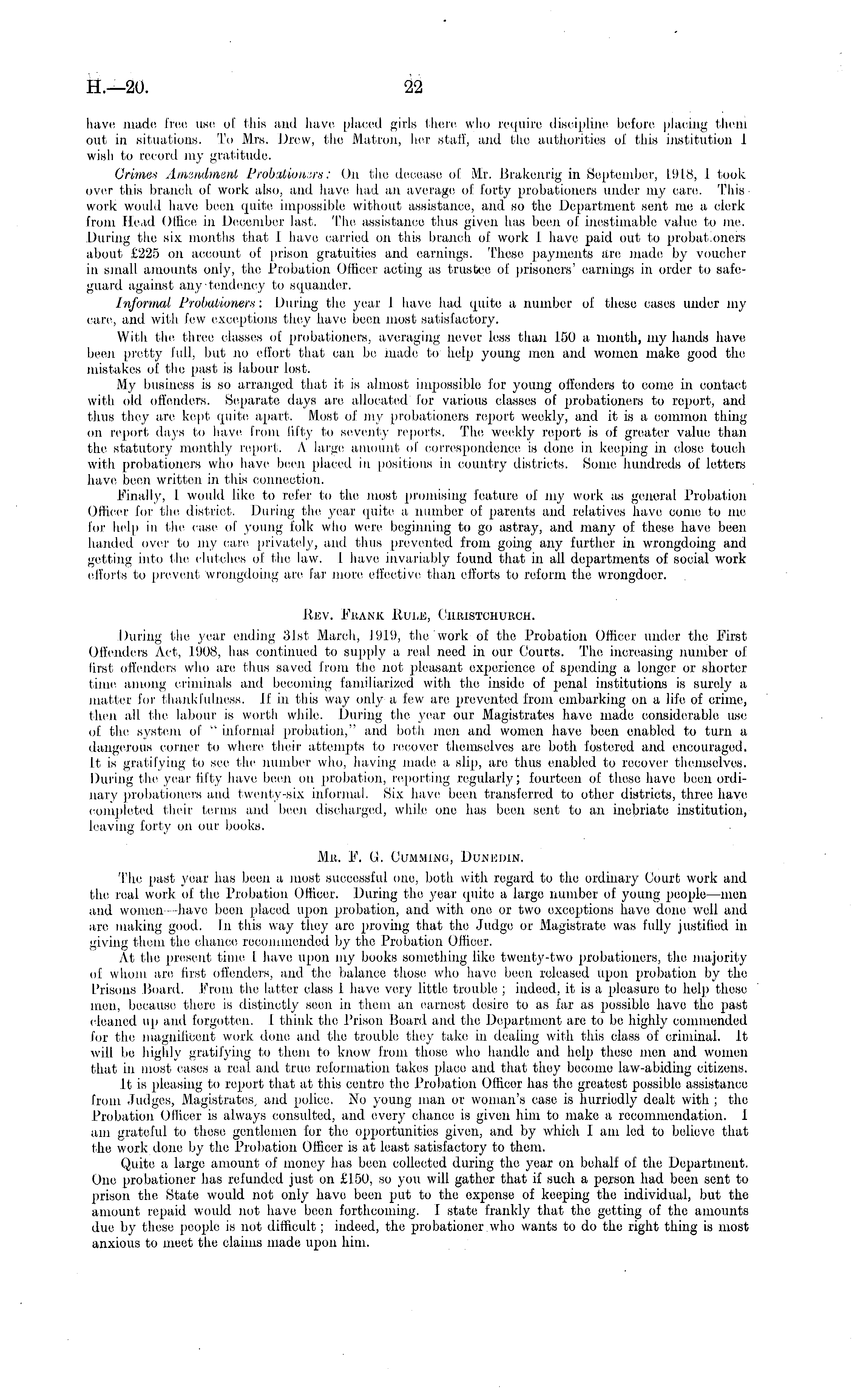 have made free, use of this and have placed girls there who require discipline before, placing them out in situations. To Mrs. Drew, the Matron, her staff, and the authorities of this institution 1 wish to record my gratitude. Crimes Amendment Probationers: On the deoease of Mr. Brakenrig in September, 1.918, 1 took over this branch of work also, and have had an average of forty probationers under my cart!. This work would have been quite impossible without assistance, and so the Department sent me a clerk from Head Office in December last. The assistance thus given has been of inestimable value to me. During the six months that I have carried on this branch of work I. have paid out to probationers about £225 on account of prison gratuities and earnings. These payments are made by voucher in small amounts only, the Probation Officer acting as trustee of prisoners' earnings in order to safeguard against any-tendency to squander. Informal Probationers: During the year I have had quite a number of these cases under my care, and with few exceptions they have been most satisfactory. With the three classes of probationers, averaging never less than 150 a month, my hands have, been pretty full, but no effort that can be made to help young men and women make good the mistakes of the past is labour lost. My business is so arranged that it is almost impossible for young offenders to come in contact with old offenders. Separate days are allocated for various classes of probationers to report, and thus they are kept quite apart. Most of my probationers report weekly, and it is a common thing on report days to have from fifty to seventy reports. The, weekly report is of greater value than the statutory monthly report. A large amount of correspondence is done, in keeping in close touch with probationers who have, been placed in positions in country districts. Some hundreds of letters have been written in this connection. Finally, I. would like to refer to the most promising feature of my work as general Probation Officer for the district, During the year quite a number of parents and relatives have come to me for help in the case of young folk who were beginning to go astray, and many of these have been handed over to my care privately, and thus prevented from going any further in wrongdoing and getting into the clutches of the law. I have invariably found that in all departments of social work efforts to prevent wrongdoing are far more effective than efforts to reform the wrongdoer. Rev. Frank Rule, Christchurch. During the year ending 31st March, 1919, the Work of the. Probation Officer tinder the First Offenders Act, 1908, has continued to supply a, real need in our Courts. The increasing number of first offenders who are thus saved front the not pleasant experience of spending a longer or shorter time among criminals and becoming familiarized with the inside of penal institutions is surely a matter for thankfulness, if in this way only a few are prevented from embarking on a life of crime, then all the labour is worth while. During the year our Magistrates have, made considerable, use of the system of " informal probation," and both men and women have been enabled to turn a dangerous corner to where their attempts to recover themselves are both fostered and encouraged. It is gratifying to see the number who, having made a, slip, are thus enabled to recover themselves. During the year fifty have been on probation, reporting regularly; fourteen of these have been ordinary probationers and twenty-six informal. Six have been transferred to other districts, three have completed their terms and been discharged, while one has been sent to an inebriate institution, leaving forty on our books. Mr. F. G. Cumming, Dunedin. The past year has been a most successful one, both with regard to the ordinary Court work and the real work of the Probation Officer. During the, year quite a large number of young people —men and women have been placed upon probation, and with one, or two exceptions have done well and are making good. In this way they arc proving that the Judge or Magistrate was fully justified in giving them tho chance recommended by the Probation Officer. At the present time I have upon my books something like twenty-two probationers, the majority of whom are first offenders, and. tho balance those who have been released upon probation by the Prisons Board. From the latter class 1 have very little trouble ; indeed, it is a pleasure to help these men, because there is distinctly seen in them an earnest desire to as far as possible have the past cleaned up and forgotten. I think the Prison Board and the Department are to bo highly commended for the magnificent work done and the trouble they take in dealing with this class of criminal. It will be highly gratifying to them to know from those who handle and help these men and women that in most cases a real and true reformation takes place and that they become law-abiding citizens. It is pleasing to report that at this centre the Probation Officer has the greatest possible assistance from Judges, Magistrates, and police. No young man or woman's case is hurriedly dealt with ; the Probation Officer is always consulted, and ever)- chance is given him to make a recommendation. I am grateful to these gentlemen for the opportunities given, and by which I am led to believe that the work done by the Probation Officer is at least satisfactory to them. Quite a large amount of money has been collected during the year on behalf of the Department. One probationer has refunded just on £150, so you will gather that if such a person had been sent to prison the State would not only have been put to the expense of keeping the individual, but the amount repaid would not have been forthcoming, f state frankly that the getting of the amounts due by these people is not difficult; indeed, the probationer.who wants to do the right thing is most anxious to meet the claims made u