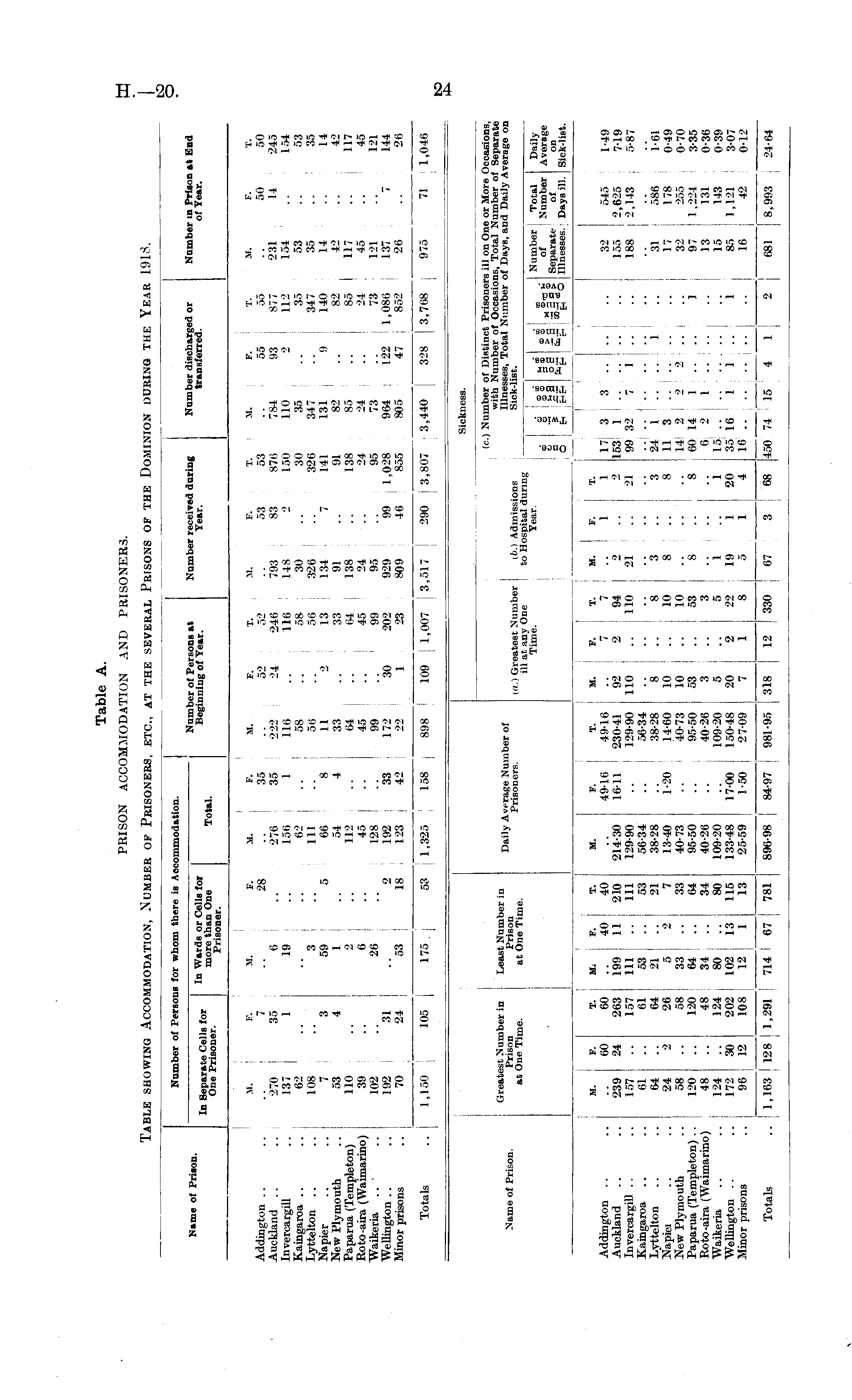 Table A. PRISON ACCOMMODATION AND PRISONERS. Table showing Accommodation, Number of Prisoners, etc., at the several Prisons of the Dominion during the Year 1918.