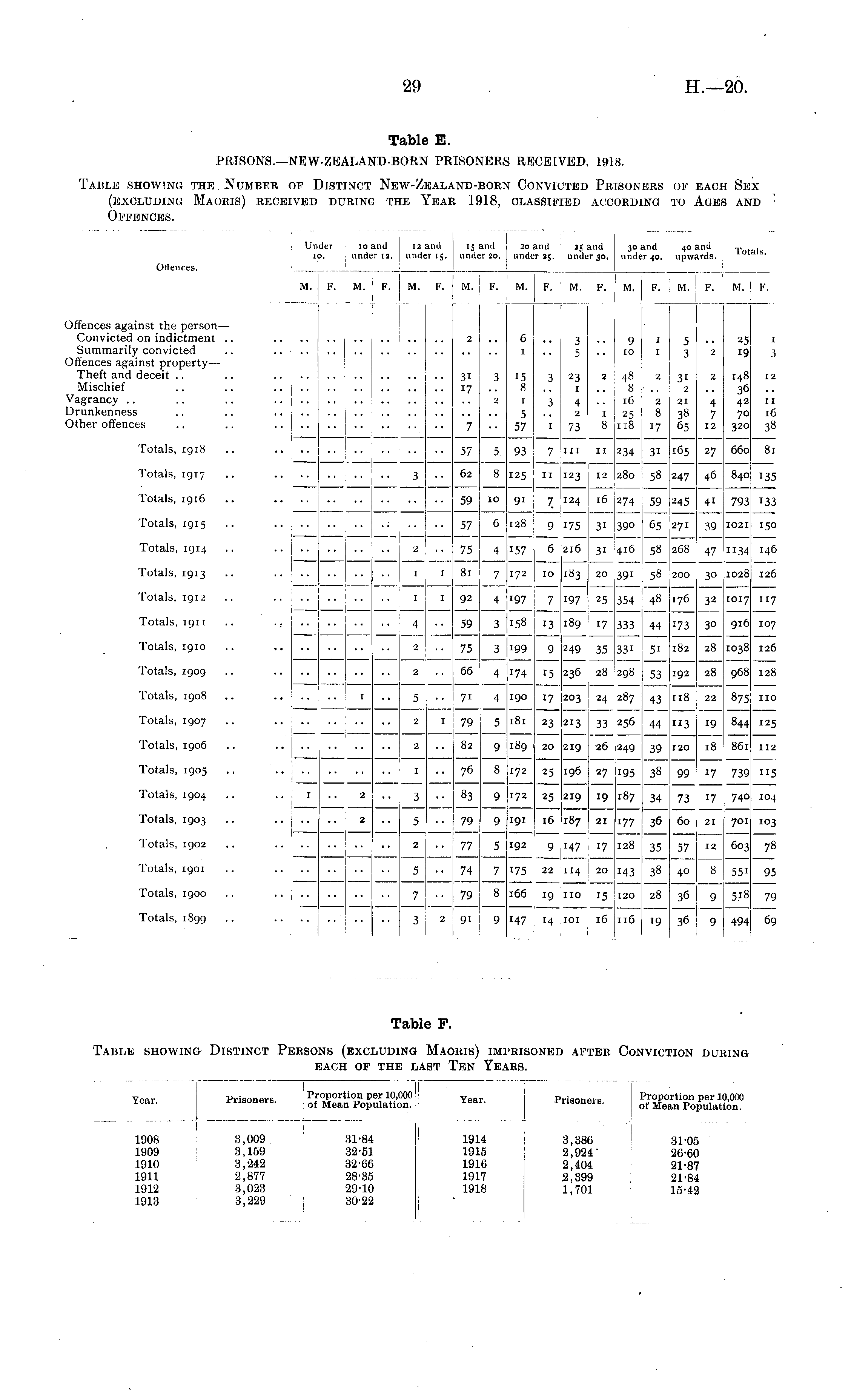 Table E. PRISONS.—NEW-ZEALAND-BORN PRISONERS RECEIVED, 1918. Table showing the Number of Distinct New-Zealand-born Convicted Prisoners of each Sex (excluding Maoris) received during the Year 1918, classified according to Ages and Offences.