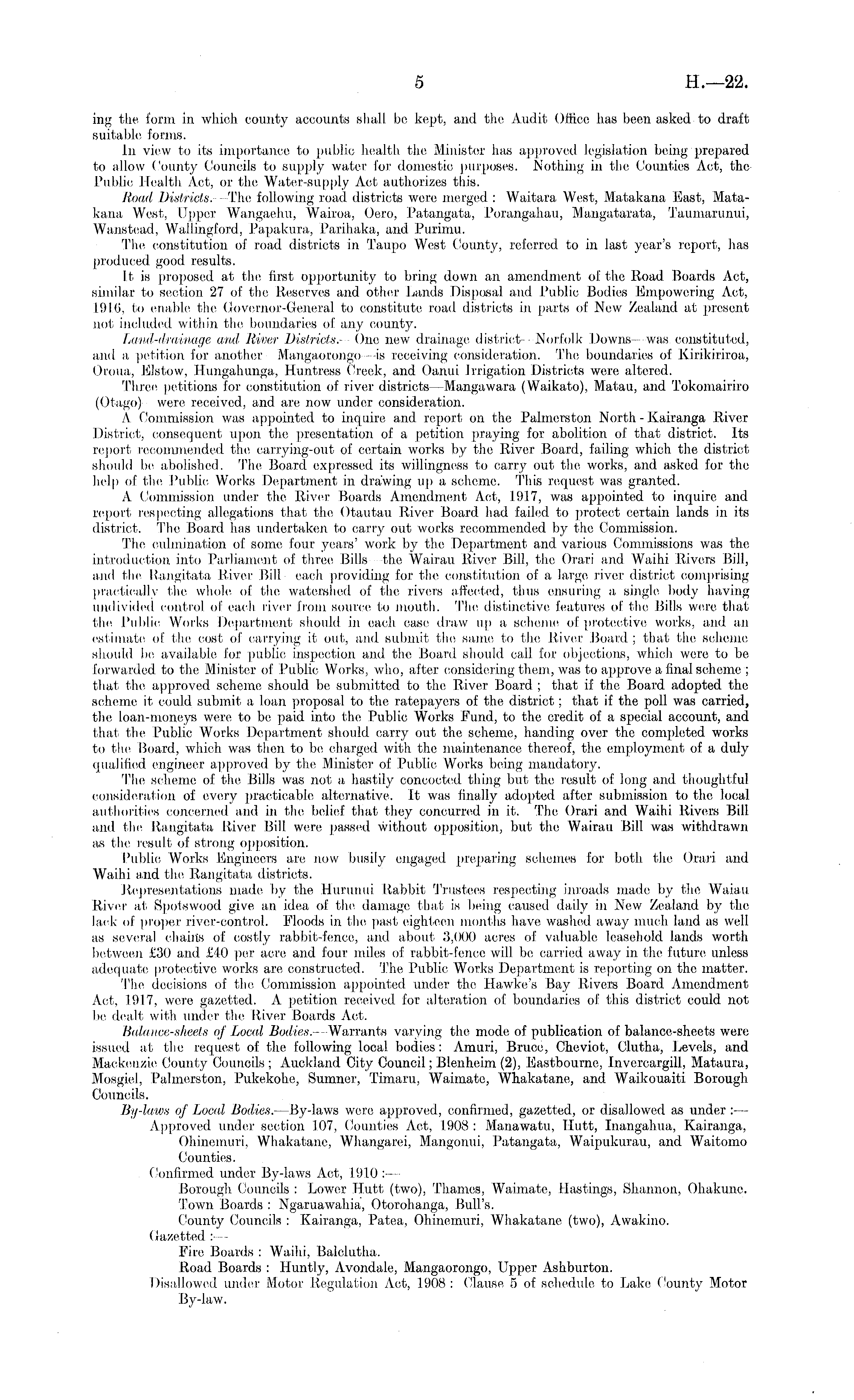 ing the form in which county accounts shall be kept, and the Audit Office has been asked to draft suitable forms. In view to its importance to public health the Minister has approved legislation being prepared to allow County Councils to supply water for domestic purposes. Nothing in the Counties Act, the Public Health Act, or the Water-supply Act authorizes this. Road Districts. -The following road districts were merged : Waitara West, Matakana East, Matakana West, Upper Wangaehu, Wairoa, Oero, Patangata, Porangahau, Mangatarata, Taumarunui, AVanstead, Wallingford, Papakura, Parihaka, and Purimu. The constitution of road districts in Taupo West County, referred to in last year's report, has produced good results. It is proposed at the first opportunity to bring down an amendment of the Road Boards Act, similar to section 27 of the Reserves and other Lands Disposal and Public Bodies Empowering Act, 1916, to enable the Governor-General to constitute road districts in parts of New Zealand at present not included within the boundaries of any county. Land-drainage and River Districts.- One new drainage district- Norfolk Downs- was constituted, and a petition for another Mangaorongo —is receiving consideration. The boundaries of Kirikiriroa, Oroua, Elstow, Hungahunga, Huntress Creek, and Oanui Irrigation Districts were altered. Three petitions for constitution of river districts —Mangawara (Waikato), Matau, and Tokomairiro (Otago) were received, and are now under consideration. A Commission was appointed to inquire and report on the Palmerston North - Kairanga River District, consequent upon the presentation of a petition praying for abolition of that district. Its report recommended the carrying-out of certain works by the River Board, failing which the district should be abolished. The Board expressed, its willingness to carry out the, works, and asked for the help of the Public Works Department in drawing up a scheme. This request was granted. A Commission under the River Boards Amendment Aot, 1917, was appointed to inquire and report respecting allegations that the Otautau River Board had failed to protect certain lands in its district. The Board has undertaken to carry out works recommended by the Commission. The culmination of some four years' work by the Department and. various Commissions was the introduction into Parliament of three Bills the Wairau River Bill, the Orari and Waihi Rivers Bill, and the Rangitata River Bill each providing for the constitution of a large river district comprising practically the whole of the watershed of the rivers affected, thus ensuring a single body having undivided control of each river from source to mouth. The distinctive features of the Bills were that the Public Works .Department should in each case draw up a scheme of protective works, and an estimate of the cost of carrying it out, and submit the same, to the River Board ; that the scheme should be available for public inspection and the Board should call for objections, which were to be forwarded to the Minister of Public Works, who, after considering them, was to approve a final scheme ; that the approved scheme should be submitted to the River Board ; that if the Board adopted the scheme it could submit a loan proposal to the ratepayers of the district; that if the poll was carried, the loan-moneys were to be paid into the Public Works Fund, to the credit of a special account, and that the Public Works Department should carry out the scheme, handing over the completed works to the Board, which was then to be charged with the maintenance thereof, the employment of a duly qualified engineer approved by the Minister of Public Works being mandatory. The scheme of the Bills was not a, hastily concocted, thing but the result of long and. thoughtful consideration of every practicable alternative. It was finally adopted after submission to the local authorities concerned and in the belief that they concurred in it. The Orari and Waihi Rivers Bill and the Rangitata River Bill were passed without opposition, but the Wairau Bill was withdrawn as the result of strong opposition. Public Works Engineers are now busily engaged, preparing schemes for' both the Orari and Waihi arid the, Rangitata districts. lie presentations made by the Hurunui Babbit Trustees respecting inroads made by the Wai.au River at Spotswood give an idea of the damage that is being caused daily in New Zealand by the lack of proper river-control. Floods in the. past eighteen months have washed away much land as well as several chains of costly rabbit-fence, and about 3,000 acres of valuable leasehold lands worth between £30 and £40 per acre and four miles of rabbit-fence will be carried away in the future unless adequate protective works are constructed. The Public Works Department is reporting on the matter. The decisions of the, Commission appointed under the Hawke's Bay Rivers Board Amendment Act, 1917, were gazetted. A petition received for alteration of boundaries of this district could, not be dealt with under the River Boards Act. Balance-sheets of Local Bodies. —Warrants varying the mode of publication of balance-sheets were issued at tin; request of the following local bodies : Amuri, Bruce, Cheviot, Clutha, Levels, and Mackenzie County Councils ; Auckland City Council; Blenheim (2), Eastbourne, Invereargill, Mataura, Mosgiel, Palmerston, Pukekohe, Sumner, Timaru, Waimate, Whakatane,, and Waikouaiti Borough Councils. By-laws of Local Bodies. —By-laws were approved, confirmed, gazetted, or disallowed as under : — Approved under section 107, Counties Act, 1.908: Manawatu, Hutt, Inangahua, Kairanga, Ohinemuri, Whakatane, Whangarei, Mangonui, Patangata, Waipukurau, and Waitomo Counties. Confirmed under By-laws Act, 1910 :— Borough. Councils : Lower Hutt (two), Thames, Waimate, Hastings, Shannon, Oh.aku.no. Town Boards : Ngaruawahia, Otorohanga, Bull's. County Councils : Kairanga, Patea, Ohinemuri, Whakatane (two), 