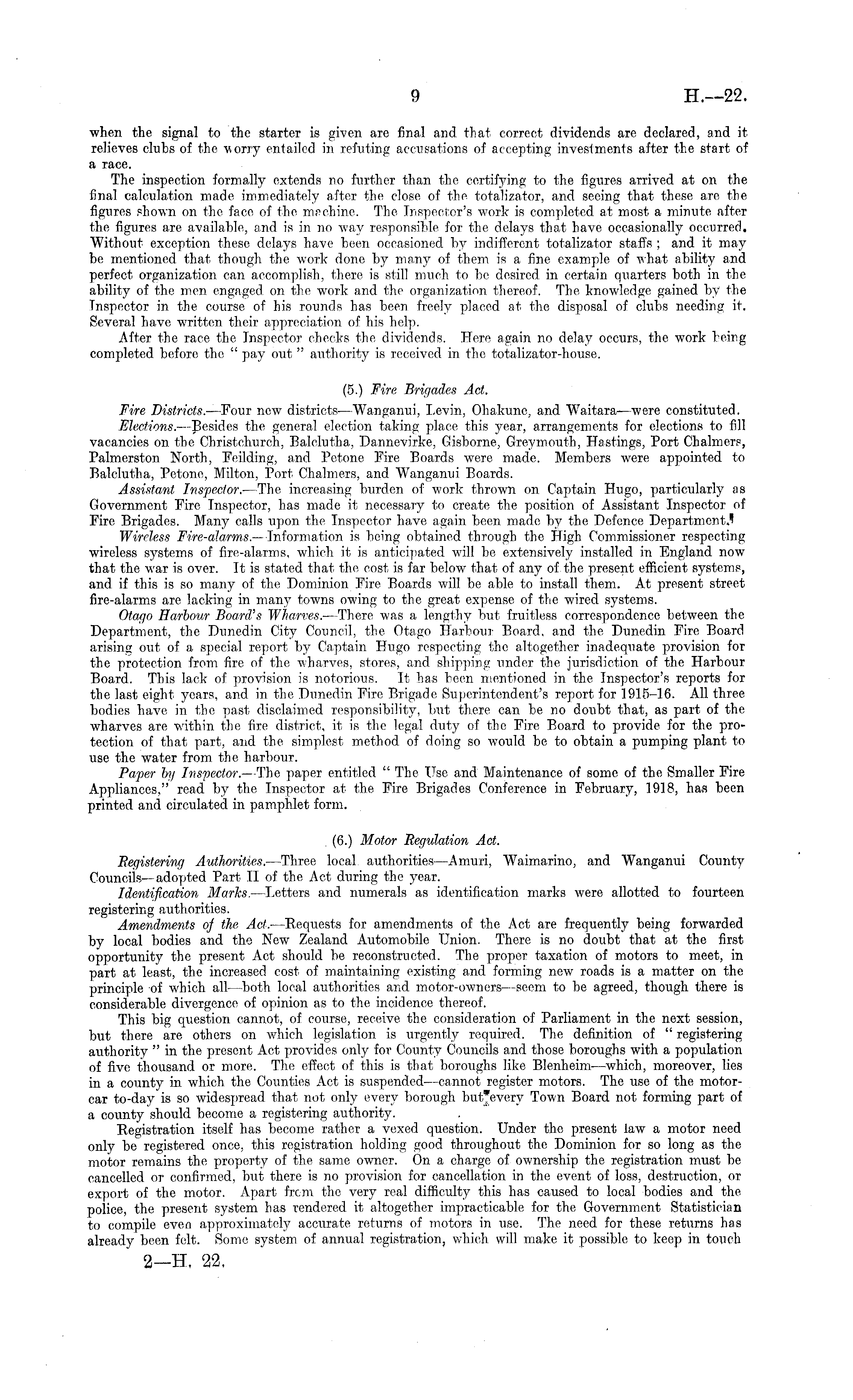when the signal to the starter is given are final and that correct dividends are declared, and it relieves clubs of the worry entailed in refuting accusations of accepting investments after the start of a race. The inspection formally extends no further than the certifying to the figures arrived at on the final calculation made immediately after the close of the totalizator, and seeing that these are the figures shown on the face of the mflchine, The Inspector's work is completed at most a minute after the figures are available, and is in no way responsible for the delays that have occasionally occurred. Without exception these delays have been occasioned by indifferent totalizator staffs ; and it may be mentioned that though the work done by many of them is a fine example of what ability and perfect organization can accomplish, there is still much to be desired, in certain quarters both in the ability of the men engaged on the work and the organization thereof. The knowledge gained by the Inspector in. the course of his rounds has been freely placed at the disposal of clubs needing it. Several have written their appreciation of his help. After the race the Inspector checks the dividends. Here again no delay occurs, the work being completed before tho " pay out " authority is received in tho totalizator-house. (5.) Fire Brigades Act. Fire Districts.—Fom new districts—Wanganui, Levin, Ohakunc, and Waitara—were constituted. Elections. —Besides the general election taking place this year, arrangements for elections to fill vacancies on the Christchurch, Balclutha, Dannevirke, Gisborne, Greymouth, Hastings, Port Chalmers, Palmerston North, Feilding, and Pctone Fire Boards were made. Members were appointed to Balclutha, Petone, Milton, Port Chalmers, and. Wanganui Boards. Assistant Inspector. —The increasing burden of work thrown on Captain Hugo, particularly as Government Fire, Inspector, has made it necessary to create the position of Assistant Inspector of Fire Brigades. Many calls upon the Inspector have again been made by the Defence Department.'' Wireless Fire-alarms.— Information is being obtained through the High Commissioner respecting wireless systems of fire-alarms, which it is anticipated will be extensively installed in England now that the war is over. It is stated that the cost is far below that of any of the present efficient systems, and if this is so many of the Dominion Fire Boards will be able to install them. At present street fire-alarms are lacking in many towns owing to the great expense of the wired systems. Otago Harbour Board's Wharves. —There was a lengthy but fruitless correspondence between the Department, the Dunedin City Council, the Otago Harbour Board, and the Dunedin Fire Board arising out of a special report by Captain Hugo respecting the altogether inadequate provision for the protection from fire of the wharves, stores, and shipping under the jurisdiction of the Harbour Board. This lack of provision is notorious. It has been mentioned in the Inspector's reports for the last eight years, and in the Dunedin Fire Brigade Superintendent's report for 1915-16. All three bodies have in the past disclaimed responsibility, but there can be no doubt that, as part of the wharves are within the fire district, it is the legal duty of the Fire Board to provide for the protection of that part, and the simplest method, of doing so would be to obtain a pumping plant to use the water from the harbour. Paper by Inspector. —The paper entitled " The Use and Maintenance of some of the Smaller Fire Appliances," read by the Inspector at the Fire Brigades Conference in February, 1918, has been printed and circulated in pamphlet form. . (6.) Motor Regulation Act. Registering Authorities. —Three local authorities—Amuri, Waimarino, and Wanganui County Councils—adopted Part II of the Act during the year. Identification Marks. —Letters and numerals as identification marks were allotted to fourteen registering authorities. Amendments of the Act. —Requests for amendments of the Act are frequently being forwarded by local bodies and the New Zealand Automobile Union. There is no doubt that at the first opportunity the present Act should be reconstructed. The proper taxation of motors to meet, in part at least, the increased cost of maintaining existing and forming new roads is a matter on the principle of which all—both local authorities and motor-owners —seem to be agreed, though there is considerable divergence of opinion as to the incidence thereof. This big question cannot, of course, receive the consideration of Parliament in the next session, but there are others on which legislation is urgently required. The definition of " registering authority " in the present Act provides only for County Councils and those boroughs with a population of five thousand or more. The effect of this is that boroughs like Blenheim—which, moreover, lies in a county in which the Counties Act is suspended—cannot register motors. The use of the motorcar to-day is so widespread that not only every borough but'every Town Board not forming part of a county should become a registering authority. Registration itself has become rather a vexed question. Under tho present law a motor need only be registered once, this registration holding good throughout the Dominion for so long as the motor remains the property of the same owner. On a charge of ownership the registration must be cancelled or confirmed, but there is no provision for cancellation in the event of loss, destruction, or export of the motor. Apart from the very real difficulty this has caused to local bodies and the police, the present system has rendered it altogether impracticable for the Government Statistician to compile even approximately accurate returns of motors in use. The need for these returns has already been felt. Some system of annual registration, which will make it possible to keep in touch