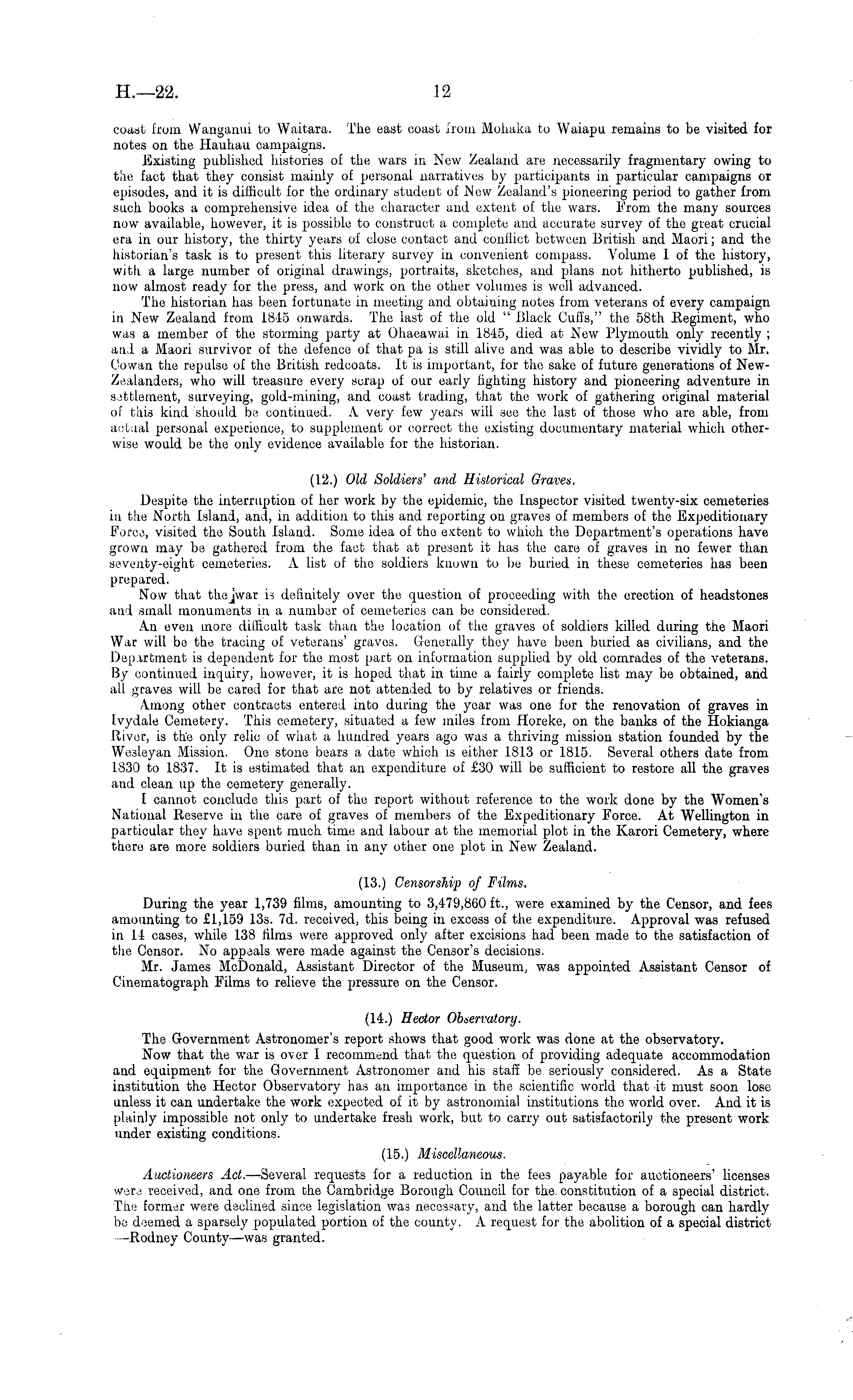 coast from Wanganui to Waitara. The east coast from Mohaka to Waiapu remains to be visited for notes on the Hauhau campaigns. Existing published histories of the wars in New Zealand are necessarily fragmentary owing to the fact that they consist mainly of personal narratives by participants in particular campaigns or episodes, and it is difficult for the ordinary student of New Zealand's pioneering period to gather from such books a comprehensive idea of the character and extent of the wars. From the many sources now available, however, it is possible to construct a complete and accurate survey of the great crucial era in our history, the thirty years of close contact and conflict between British and Maori; and the historian's task is to present this literary survey in convenient, compass. Volume lof the history, with a large number of original drawings, portraits, sketches, and plans not hitherto published, is now almost ready for the press, and work on the other volumes is well advanced. Tho historian has been fortunate in meeting and obtaining notes from veterans of every campaign in New Zealand from 1845 onwards. The last of the old " Black Cuffs," the 58th Regiment, who was a member of the storming party at Ohaeawai in 1.845, died at New Plymouth only recently ; and a Maori survivor of the defence of that pa is still alive and was able to describe vividly to Mr, Cowan the repulse of the British redcoats. It is important, for the sake of future generations of NewZealanders, who will treasure every scrap of our early fighting history and pioneering adventure in settlement, surveying, gold-mining, and coast trading, that the work of gathering original material of tins kind should be continued. A very few years will see the last of those who are able, from actual personal experience, to supplement or correct the existing documentary material which otherwise would be the only evidence available for the historian. (12.) Old Soldiers' and Historical Graves. Despite the interruption of her work by the epidemic, the Inspector visited twenty-six cemeteries in the North Island, and, in addition to this and reporting on graves of members of the Expeditionary Force, visited the South Island. Some idea of tho extent to which the Department's operations have grown may be gathered from the fact that at present it has the care of graves in no fewer than seventy-eight cemeteries. A list of the soldiers known to be buried in these cemeteries has been prepared. Now that thejwar is definitely over the question of proceeding with the erection of headstones and small monuments in a number of cemeteries can be considered. An even more difficult task than the location of the graves of soldiers killed during the Maori War will bo the tracing of veterans' graves. Generally they have been buried as civilians, and the Department is dependent for tho most part on information supplied by old comrades of the veterans. By continued inquiry, however, it is hoped that in time a fairly complete list may be obtained, and all graves will be cared for that are not attended to by relatives or friends. Among other contracts entered into during the year was one for the renovation of graves in Ivydale Cemetery. This cemetery, situated a few miles from Horeke, on the banks of the Hokianga River, is the only relic of what a hundred years ago was a thriving mission station founded by the Wesleyan Mission. One stone bears a date which is either 1813 or 1815. Several others date from 1.830 to 1837. It is estimated that an expenditure of £30 will be sufficient to restore all the graves and clean up the cemetery generally. I cannot conclude this part of the report without reference to the work done by the Women's National Reserve in the care of graves of members of the Expeditionary Force. At Wellington in particular they have spent much time and labour at the memorial plot in the Karori Cemetery, where there are more soldiers buried than in any other one plot in New Zealand. (13.) Censorship of Films. During the year 1,739 films, amounting to 3,479,860 ft., were examined by the Censor, and fees amounting to £1,159 13s. 7d. received, this being in excess of the expenditure. Approval was refused in 14 cases, while 138 films were approved only after excisions had been made to the satisfaction of the Censor. No appeals were made against the Censor's decisions. Mr. James McDonald, Assistant Director of the Museum, was appointed Assistant Censor of Cinematograph Films to relieve the pressure on the Censor. (14.) Hector Observatory. The Government Astronomer's report shows that good work was done at the observatory. Now that the war is over I recommend that the question of providing adequate accommodation and equipment for the Government Astronomer and his staff be seriously considered. As a State institution the Hector Observatory has an importance in the scientific world that it must soon lose unless it can undertake the work expected of it by astronomial institutions the world over. And it is plainly impossible not only to undertake fresh work, but to carry out satisfactorily the present work under existing conditions. (15.) Miscellaneous. Auctioneers Act. —'Several requests for a reduction in the fees payable for auctioneers' licenses were received, and one from the Cambridge Borough Council for the. constitution of a special district. The former were declined since legislation was necessary, and the latter because a borough can hardly be deemed a sparsely populated portion of the county. A request for the abolition of a special district —Rodney County—was granted.