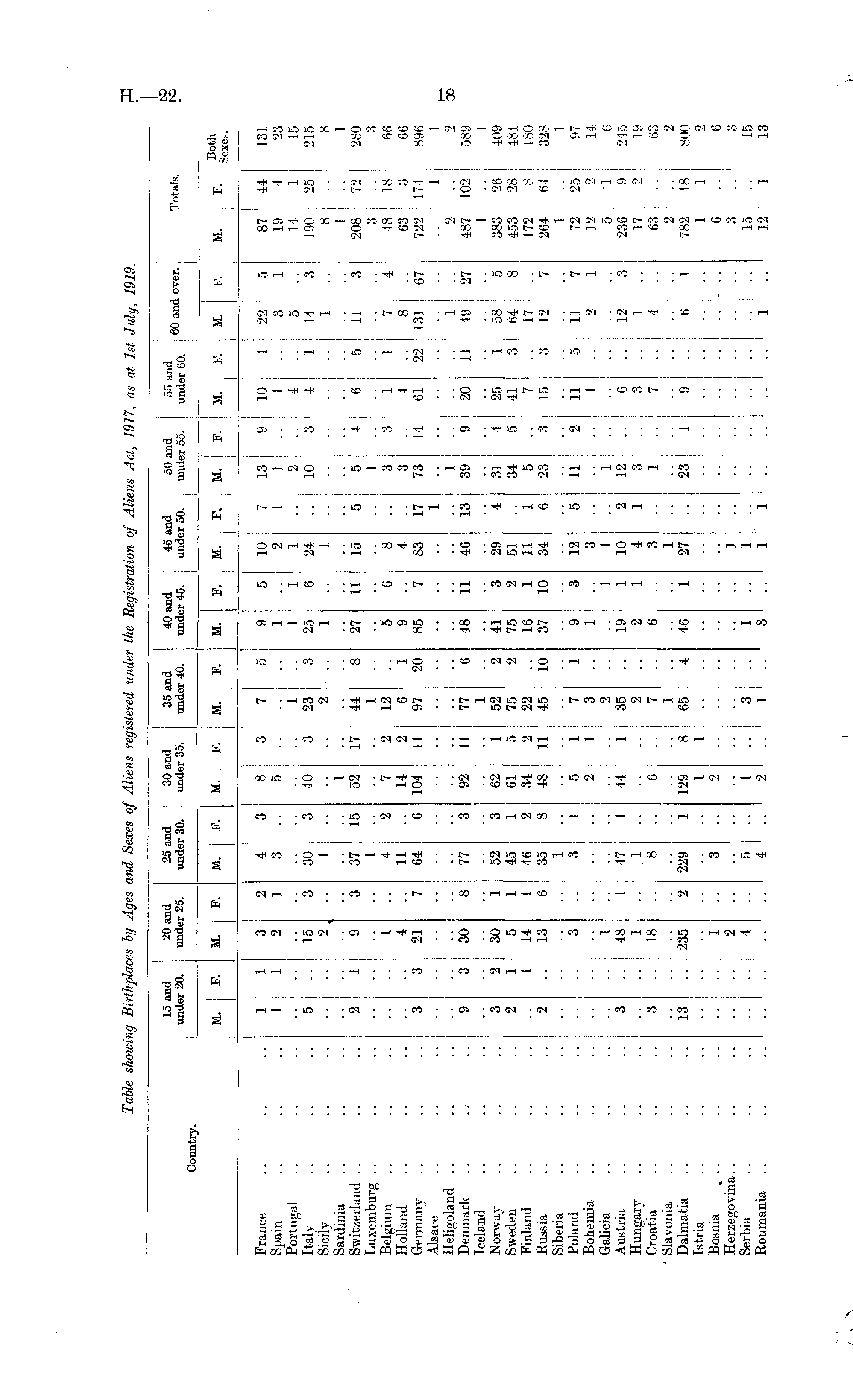 Table showing Birthplaces by Ages and Sexes of Aliens registered under the Registration of Aliens Act, 1917, as at 1st July, 1919.