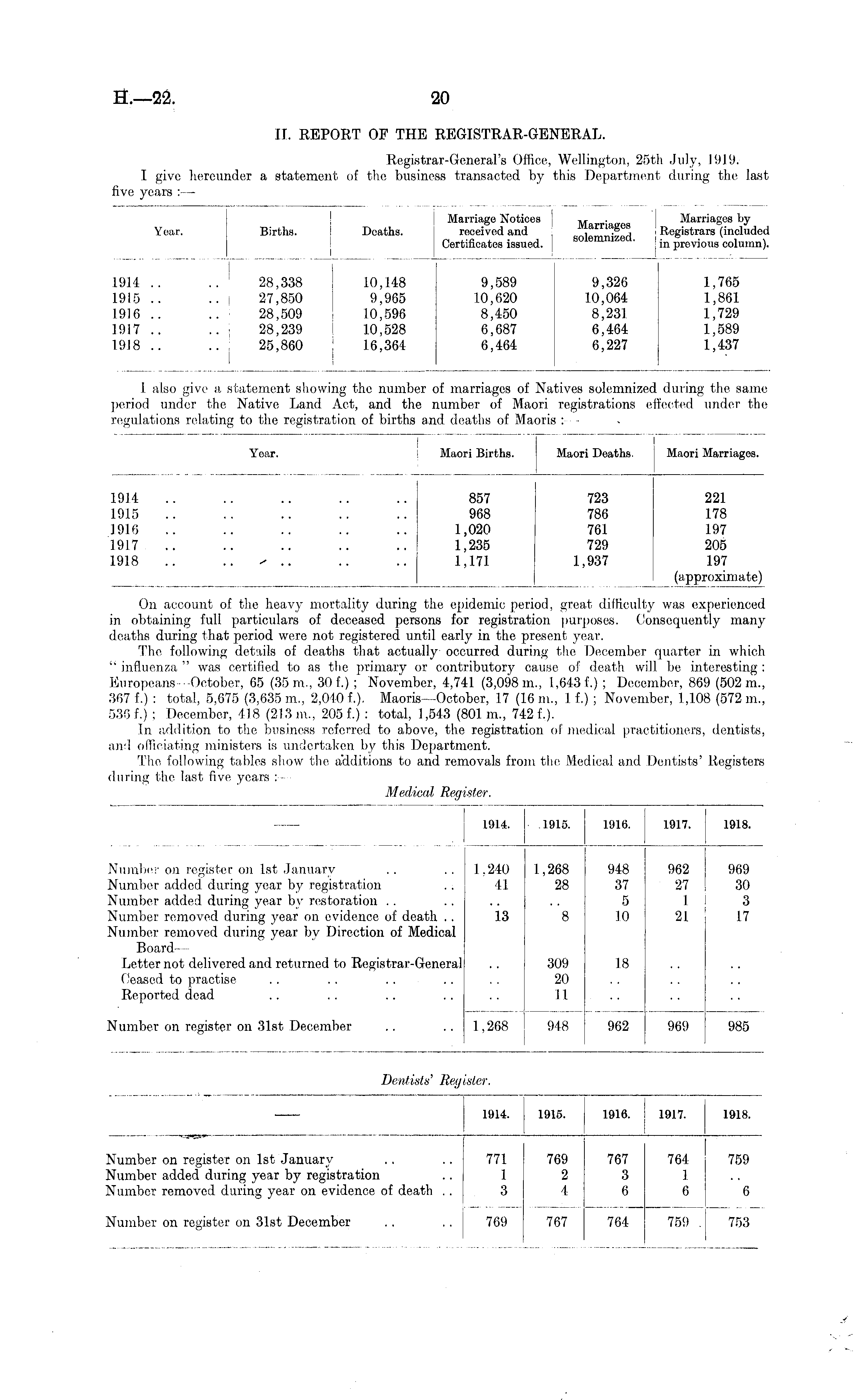11. REPORT OP THE REGISTRAR-GENERAL. Registrar-General's Office, Wellington, 25th July, 1919. I give hereunder a statement of the business transacted by this Department during the last five years : —