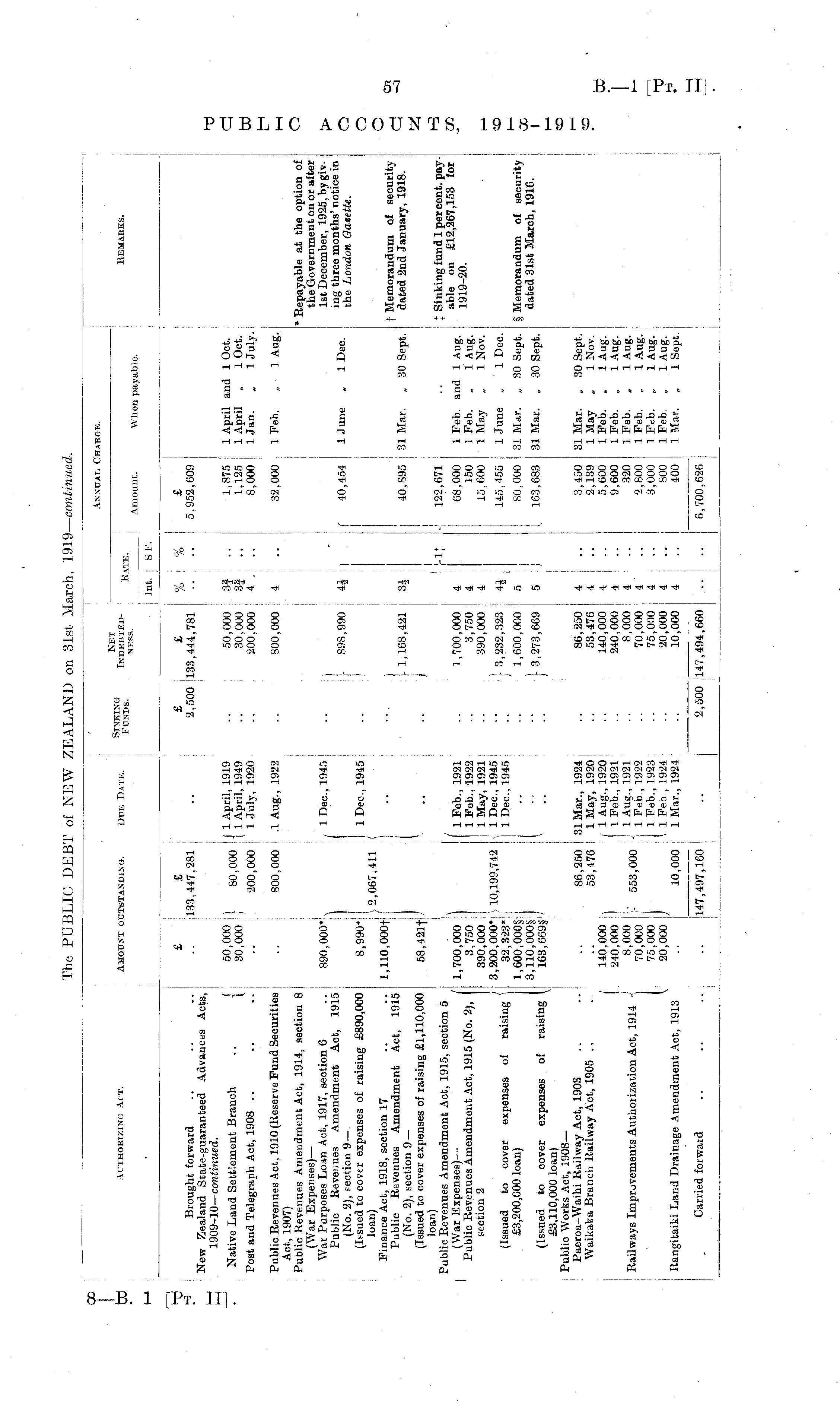 Annual Charge. Authorizing Act. Amount outstanding. Due Date. Sinking Funds. Net Indebtedness. : Kate. ■I Eemarks. Amount. When payable. Int. | S F. Brought forward New Zealand State-guaranteed Advances Acts, 1909-10 — continued. Native Land Settlement Branch .. | Post and Telegraph Act, 1908 Public Revenues Act, 1910 (Reserve Fund Securities Act, 1907) Public Revenues Amendment Act, 1914, section 8 (War Expenses) — War Purposes Loan Act, 1917, section 6 Public Revenues Amendment Act, 1915 (No. 2), fection 9—. (Issued to covtr expenses of raising £890,000 loan) Finance Act, 1918, section 17 Public Revenues Amendment Act, 1915 (No. 2), section 9 — (Issued to cover expenses of raising £1,110,000 loan) Public Revenues Amendment Act, 1915, section 5 (War Expenses) — /! Public Revenues Amendment Act, 1915 (No. 2), I section 2 J (Issued to cover expenses of raising "l £3,200,000 loan) (Issued to cover expenses of raising \ £3,110,000 loan) Public Works Act, 1908— Paeroa- Waihi Railway Act, 1903 .. .. 1 Waikaka. Branch Railway Act, 1905 ., ... I Railwavs Improvements Authorization Act, 1914 Rangitaiki Land Drainage Amendment Act, 1913 Carried forward .. .. .. £ £ £ £ [ o/ oi |l33,447,281 .. 2,500 133,444,781 j .. ! .. 50,000 11 mmn jl April, 1919 .. 50,000 3| 30,000 [ &u > uuu | 1 April, 1949 .. 30,000 3| 200,000 1 July, 1920 .. 200,000; 4 . .. 800,000: .1 Aug., 1922 .. 800,000 4 890,000* * , 1 Dec, 1945 .. i 11 898,990 44 I 8,990' 1 Dec, 1945 \ 2,067,411 i,no,ooot \ 1,168,421 ! 34 58,421+i/ .. -. j 1,700,000 \ (-1 Feb., 1921 .. 1,700,000 j 4 3,750 M 1 Feb., 1922 .. 3,750 ! 4 390,000,, IMay, 1921 .. 390,000: 4 3,200,000*' .10,199,742 , 1 Dec, 1945 .. 1 „ „, ™ ., 32,323': I 1 Dec. 1945 .. f d,AW,3** 4 2 1,600,000§ , .. .. 1,600,000 5 3,110,000i 1 .. .. I o om eco k ! 163;669§' V ... .. [3,273,669 5 j 86,250 31Mar., 1924 .. 86,250 4 53,476 1 May, 1920 : ..' 53,476! 4 140,000 i ,- 1 Aug., 1920 .. 140,000: 4 240,000 I 1 Feb., 1921 .. 240,000 ! 4 8,000 : i. n ! 1 Aug., 1921 .. 8,000 4 | .. 70,000 " 00d ' uuu 1 1 Feb., 1922 .. 70,000 4 75,000 i j 1 Feb., 1923 .. 75,000 4 20,000 J \1 Feb., 1924 .. 20,000 1 4 I .. 10,000; 1 Mar., 1924 .. 10,000 j 4 I .. 147,497,160 1 .. 2,500 147,494,660 j .. .. £ i 5,952,609 1,875 1 April and 1 Oct. 1,125 1 April „ 1 Oct. 8,000 Uan. „ Uuly. 32,000 1 Feb. „ 1 Aug. f 40,454 1 June „ 1 Dec. 40,895 31 Mar. „ 30 Sept. -j 122,671 j 68.000 1 Feb. and 1 Aug. 150 1 Feb. „ 1 Aug. 15,600 1 May „ 1 Nov. 145,455 1 June „ 1 Dec. 80,000 31 Mar. „ 30 Sept. !. 163,683 | 31 Mar. „ 30 Sept. 1 Repayable at the option of the Government on or after 1st December, 1925, by giving three months' notice in the London Gazette. f Memorandum of security dated 2nd January, 1918. J Sinking fundi per cent, payable on £12,267,153 for 1919-20. § Memorandum of security dated 31st March, 1916. 3,450 31 Mar. „ 30 Sept. 2,139 1 May „ 1 Nov. 5,600 1 Feb. „ 1 Aug. 9,600 1 Feb. „ 1 Aug. 320 1 Feb. . 1 Aug. 2,800 1 Feb. . 1 Aug. 3,000 1 Feb. „ 1 Aug. S00 1 Feb. „ 1 Aug. 400 1 Mar. „ 1 Sept. 6,700,626