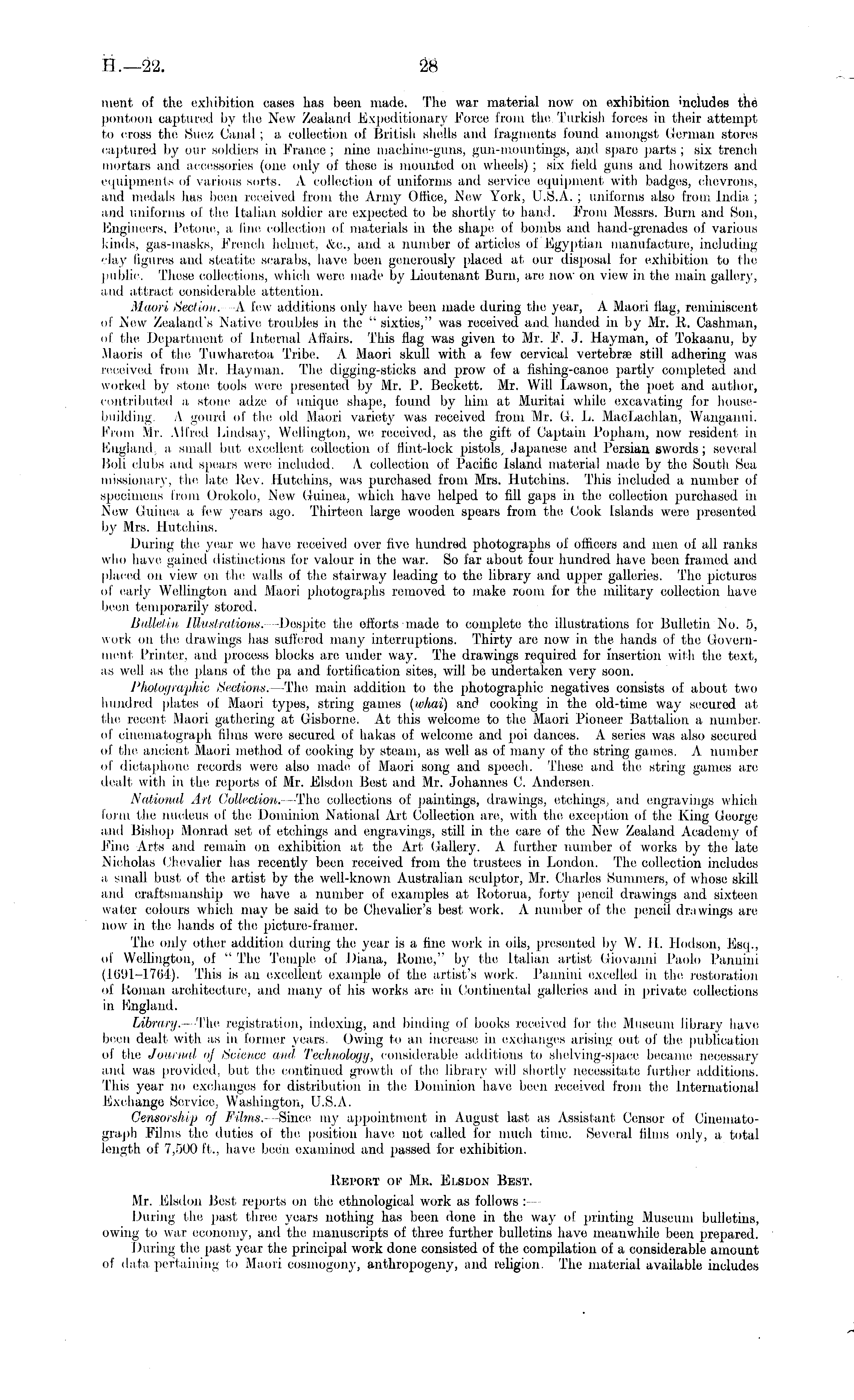 ment of the exhibition cases has been made. The war material now on exhibition includes the pontoon captured by the New Zealand Expeditionary Force from the Turkish forces in their attempt to cross the Suez Canal; a collection of British shells and fragments found amongst German stores captured by our soldiers in France ; nine machine-guns, gun-mountings, and spare parts ; six trench mortars and accessories (one only of these is mounted on wheels) ; six field guns and howitzers and equipments of various sorts. A collection of uniforms and service equipment with badges, chevrons, and medals has been received from the Army Office, New York, US.A. ; uniforms also from India ; and uniforms of the Italian soldier are expected to be shortly to hand. From Messrs. Burn and Son, Engineers, Petone, a line collection of materials in the shape of bombs and hand-grenades of various kinds, gas-masks, French helmet, &o, and. a number of articles of Egyptian manufacture, including clay figures and steatite scarabs, have been generously placed at our disposal for exhibition to the public. These collections, which were made by Lieutenant Burn, are now on view in the main gallery, and attract considerable attention. Maori Section. A few additions only have been made during the year, A Maori flag, reminiscent of New Zealand's Native troubles in the " sixties," was received and handed in by Mr. R. Cashman, of the Department of Internal Affairs. This flag was given to Mr. F. J. Hayman, of Tokaanu, by Maoris of the Tuwharetoa Tribe. A Maori skull with a few cervical vertebra? still adhering was received from Mr. Hayman. The digging-sticks and prow of a fishing-canoe partly completed and worked by stone tools were presented by Mr. P. Beckett. Mr. Will Lawson, the poet and author, contributed a stone adze of unique shape, found by him at Muritai while excavating for housebuilding. A gourd of the old Maori variety was received from Mr. G. L. MacLachlan, Wanganui. From Mr. Alfred Lindsay, Wellington, we received, as the gift of Captain Popham, now resident in England, a, small but excellent collection of flint-look pistols, Japanese and Persian swords; several Boli clubs and spears were included. A collection of Pacific Island material made by the South. Sea missionary, the late Rev. Hutchins, was purchased from Mrs. Hutchins. This included a number of specimens from Orokolo, New Guinea, which have helped to fill gaps in the collection purchased in New Guinea a few years ago. Thirteen large wooden spears from the Cook Islands were presented by Mrs. Hutchins. During the year we have received over five hundred photographs of officers and men of all ranks who have gained distinctions for valour in the war. So far about four hundred have been framed and placed on view on the walls of the stairway leading to the library and upper galleries. The pictures of early Wellington and Maori photographs removed to make room for the military collection have been temporarily stored. Bulletin Illustrations. —Despite the efforts made to complete the illustrations for Bulletin No. 5, work on the drawings has suffered many interruptions. Thirty are now in the hands of the Government Printer, and process blocks are under way. The drawings required for insertion with the text, as well as the plans of the pa and fortification sites, will be undertaken very soon. Photographic Sections. —The main addition to the photographic negatives consists of about two hundred plates of Maori types, string games (w/iai) and cooking in the old-time way secured at the recent Maori gathering at Gisborne. At this welcome to the Maori Pioneer Battalion a number, of cinematograph films were secured of hakas of welcome and poi dances. A series was also secured of the ancient Maori method of cooking by steam, as well as of many of the string games. A. number of dictaphone records were also made, of Maori song and speech. These and the string games are dealt with in the reports of Mr. Elsdon Best and Mr. Johannes C. Andersen. National Art Collection. —The collections of paintings, drawings, etchings, and engravings which form the nucleus of the Dominion National Art Collection are, with the exception of the King George and Bishop Monrad set of etchings and engravings, still in the care of the New Zealand Academy of Fine Arts and remain on exhibition at the Art Gallery. A further number of works by the late Nicholas Chevalier has recently been received from the trustees in London. The collection includes a small bust of the artist by the well-known Australian sculptor, Mr. Charles Summers, of whose skill and craftsmanship wo have a number of examples at Rotorua, forty pencil drawings and sixteen water colours which, may be said to be Chevalier's best work. A number of the pencil drawings are now in the hands of the picture-fraiuer. The only other addition during the year is a fine work in oils, presented by W. 11. Hudson, Esq, of Wellington, of "The Temple of Diana, Rome," by (lie, Italian artist Giovanni Paolo Panuini (1691-1764). This is an excellent example of tho artist's work. Pauniui excelled in the restoration of Roman architecture, and many of his works are in Continental galleries and in private collections in England. Library- ! V\w registration, indexing, and binding of books received for the Museum library have, been dealt with as in former years. Owing to an increase, in exchanges arising out of the publication of the Journal of Science and Technology, considerable additions to shelving-space became necessary and was provided, but the continued growth of the library will shortly necessitate further additions. This year no exchanges for distribution in the Dominion have been received from the. International Exchange Service, Washington, U.S.A. Censorship of Films. —Since my appointment in August last as Assistant Censor of Cinematograph Films the duties of the. position have not called for much time. Several films only, a total length of 7,5