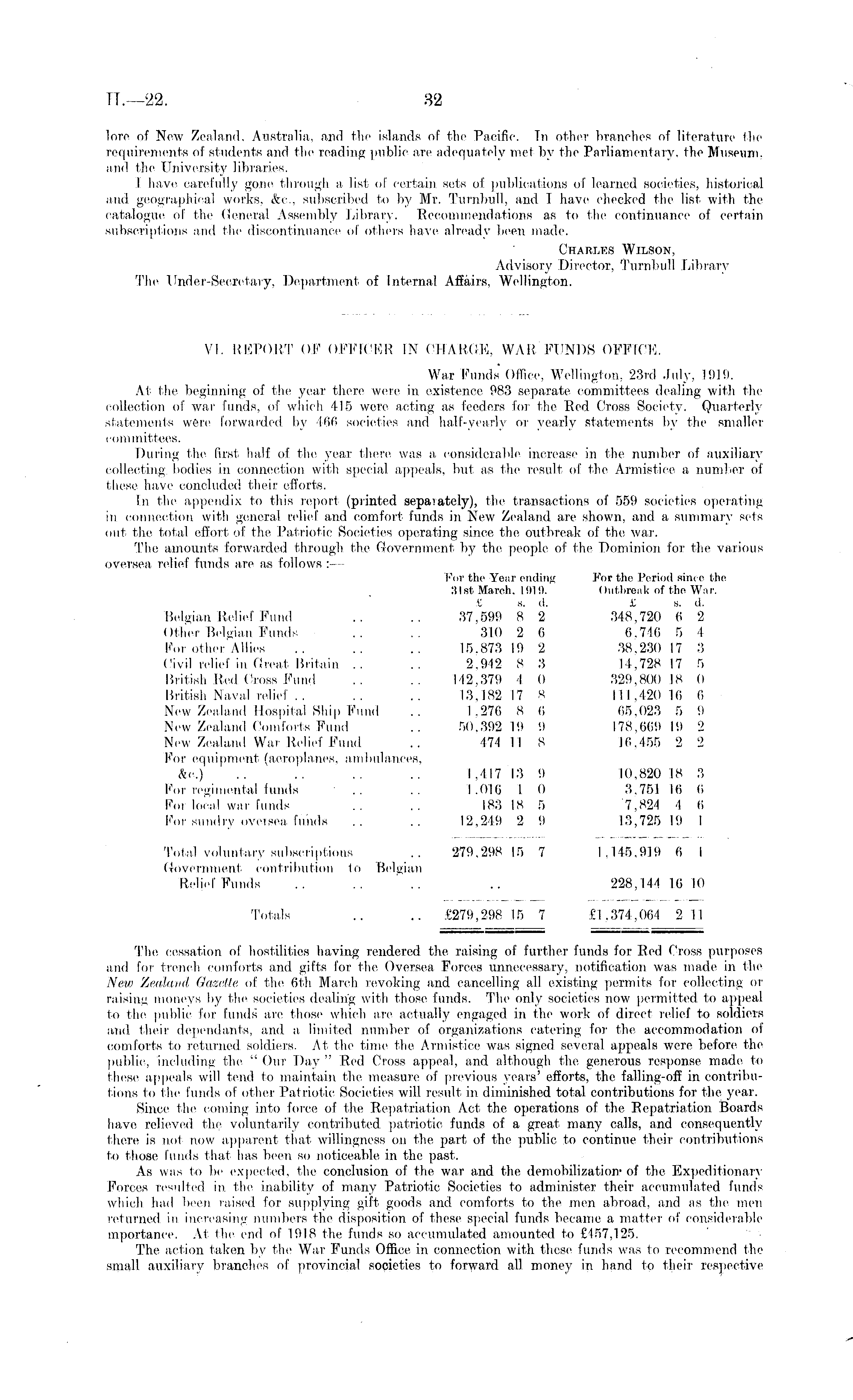 lore of New Zealand, Australia, and the islands of the Pacific. Tn other branches of literature the requirements of students and the reading public are adequately met by the Parliamentary, the Museum, and the University libraries. I have carefully gone through a list, of certain sets of publications of learned societies, historical and geographical works, &c, subscribed to by Mr. Turnbull, and I have checked the list with the catalogue of the General Assembly Library, Recommendations as to the continuance of certain subscriptions and the discontinuance of others have already been made. Charles Wilson, Advisory Director, Turnbull Library The Under-Secretary, Department of Internal Affairs, Wellington. VI. REPORT OF OFFICER IN CHARGE, WAR FUNDS OFFICE, War Funds Office, Wellington, 23rd duly, 1919. At the beginning of the year there were in. existence 983 separate committees dealing with the collection of war funds, of which 415 were acting as feeders for the Red. Cross Society. Quarterly statements were forwarded by 466 societies and half-yearly or yearly statements by the smaller committees. During the first half of the year there, was a, considerable increase in the number of auxiliary collecting, bodies in connection with, special, appeals, but as the result of the Armistice a number of these- have concluded their efforts. In the appendix to this report (printed sepaiatcly), the transactions of 559 societies operating in connection with general relief and comfort funds in New Zealand are shown, and a summary sets out the total effort of the Patriotic Societies operating since the outbreak of the war. The amounts forwarded through the Government by the people of the Dominion for the various oversea relief funds are as follows :— For tlie Year ending For the Period since the :i I st March. 1 (119. Outbreak nf the War. .1 s. <l. £ B. d. Belgian Relief Fund .. .. 37,599 8 2 348,720 (i 2 Other Belgian Funds .. .. 310 2 (i 6.74-6 5 4 For other Allies .. .. .. 15.873 19 2 38.230 17 3 Civil relief in Great Britain .. .. 2,912 8 3 14.728 17 5 British Red Cross Fund .. .. 142,379 I () 329.800 18 0 British Naval relief . . .. .. 13,182 17 8 111,420 16 6 New Zealand Hospital Ship Fund .. 1,276 8 6 (',5.023 5 9 New Zealand Comforts Fund .. 50,392 19 9 178,669 19 2 New Zealand War Relief Fund .. 474 11 8 10.455 2 2 For equipment (aeroplanes, ambulances, &o.) .. .. .. .. 1,417 13 9 10,820 18 3 For regimental funds .. .. 1,016 I 0 3,751 Iti (i Foi local war funds .. .. 183 18 5 7,824 4 ti Por sundry oversea funds .. .. 12,249 2 9 13.725 19 I Total voluntary subscriptions .. 279,298 15 7 1,145.919 (i I Government contribution to Belgian Relief Funds .. .. .. .. 228,144 l(i 10 Totals .. .. £279,298 15 7 £1,374,064 211 The cessation of hostilities having rendered the raising of further funds for Red Cross purposes and for trench comforts and gifts for the Oversea Forces unnecessary, notification was made in the New Zealand Gazette of the 6th March revoking and cancelling all existing permits for collecting or raising moneys by the societies dealing with those funds. The only societies now permitted to appeal to the public for funds are those which are actually engaged in the work of direct relief to soldiers and their dependants, and a limited number of organizations catering for the accommodation ol comforts to returned soldiers. At the time the Armistice was signed several appeals were before the public, including the. " Our Day " Red Cross appeal, and although the generous response made to these appeals will tend to maintain the measure of previous years' efforts, the falling-off in contributions to the funds of other Patriotic Societies will result in diminished total contributions for the year. Since the coming into force of the Repatriation Act the operations of the Repatriation Boards have relieved the voluntarily contributed, patriotic funds of a great many calls, and consequently there is not now apparent that willingness on the part of the public to continue their contributions to those funds that has been so noticeable in the past. As was to be expected, the conclusion of the war and the demobilization 1 of the Expeditionary Forces resulted in. the inability of many Patriotic Societies to administer their accumulated funds which had been raised for supplying gift goods and comforts to the men abroad, and as the men returned in increasing numbers the disposition of these special funds became a matter of considerable mportance. At the end of 1918 the funds so accumulated amounted to £157,125. The action taken by the War Funds Office in connection with these funds was to recommend the small auxiliary branches of provincial, societies to forward all money in hand to their respective