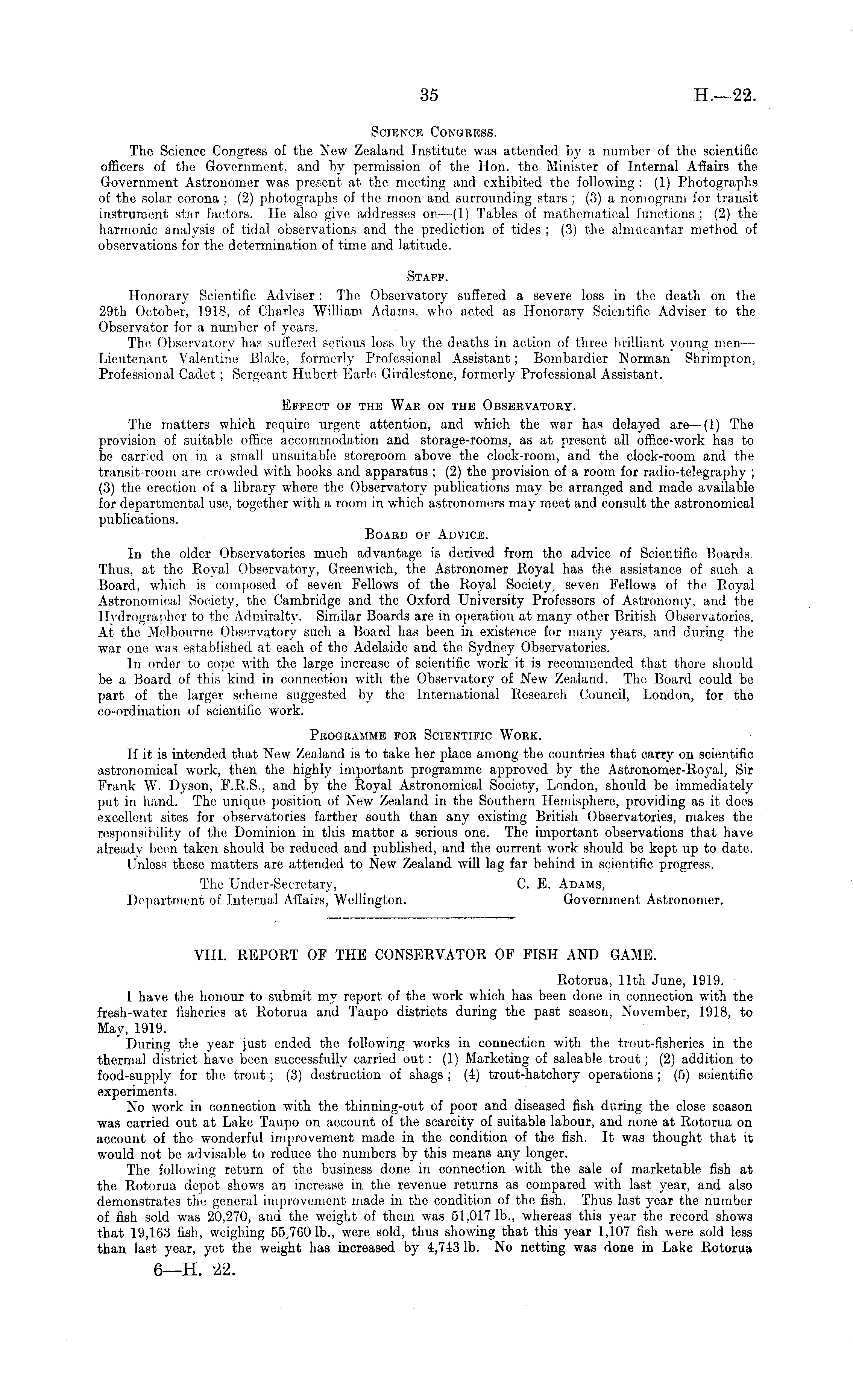 Science Congress. The Science Congress of the New Zealand Institute was attended by a number of the scientific officers of the Government, and by permission of the Hon. the. Minister of Internal Affairs the Government Astronomer was present at the meeting and exhibited the following : (1) Photographs of the solar corona ; (2) photographs of the moon and surrounding stars ; (3) a nomogram for transit instrument star factors. He also give addresses on. —(1) Tables of mathematical functions ; (2) the harmonic analysis of tidal observations and the prediction of tides ; (3) the almucantar method of observations for the determination of time and latitude. Staff. Honorary Scientific Adviser: The Observatory suffered a severe loss in the death on the 29th October, 1918, of Charles William Adams, who acted as Honorary Scientific Adviser to the Observator for a number of years. The Observatory has suffered serious loss by the deaths in action of three brilliant young men— Lieutenant Valentine Blake, formerly Professional Assistant; Bombardier Norman Shrimpton, Professional Cadet; Sergeant Hubert Earle Girdlestone, formerly Professional Assistant. Effect of the War on the Observatory. The matters which require urgent attention, and which the war has delayed are—(l) The provision of suitable office accommodation and storage-rooms, as at present all office-work has to be carried on in a small unsuitable storeroom above the clock-room, and the clock-room and the transit-room are crowded with books and apparatus ; (2) the provision of a room for radio-telegraphy ; (3) the erection of a library where the Observatory publications may be arranged and made available for departmental use, together with a room in which astronomers may meet and consult the astronomical publications. Board of Advice. In the older Observatories much advantage is derived from the advice of Scientific Boards. Thus, at the Royal Observatory, Greenwich, the Astronomer Royal has the assistance of such a Board, which is composed of seven Fellows of the Royal Society, seven Fellows of the Royal Astronomical Society, the Cambridge and the Oxford University Professors of Astronomy, and the Hvdrographer to the Admiralty. Similar Boards are in operation at many other British Observatories. At the Melbourne Observatory such a Board has been in existence for many years, and during the war one was established at each of the Adelaide and the Sydney Observatories. In order to cope with, the large increase of scientific work it is recommended that there should be a Board of this kind in connection with the Observatory of New Zealand. The Board could be part of the larger scheme suggested by the International Research Council, London, for the co-ordination of scientific work. Programme for Scientific Work. If it is intended that New Zealand is to take her place among the countries that carry on scientific astronomical work, then the highly important programme approved by the Astronomer-Royal, Sir Frank W. Dyson, F.R.S, and by the Royal Astronomical Society, London, should be immediately put in hand. The unique position of New Zealand in the Southern Hemisphere, providing as it does excellent sites for observatories farther south than any existing British Observatories, makes the responsibility of the Dominion in this matter a serious one. The important observations that have already been taken should be reduced and published, and the current work should be kept up to date. Unless these matters are attended to New Zealand will lag far behind in scientific progress. The Under-Secretary, C. E. Adams, Department of Internal Affairs, Wellington. Government Astronomer.