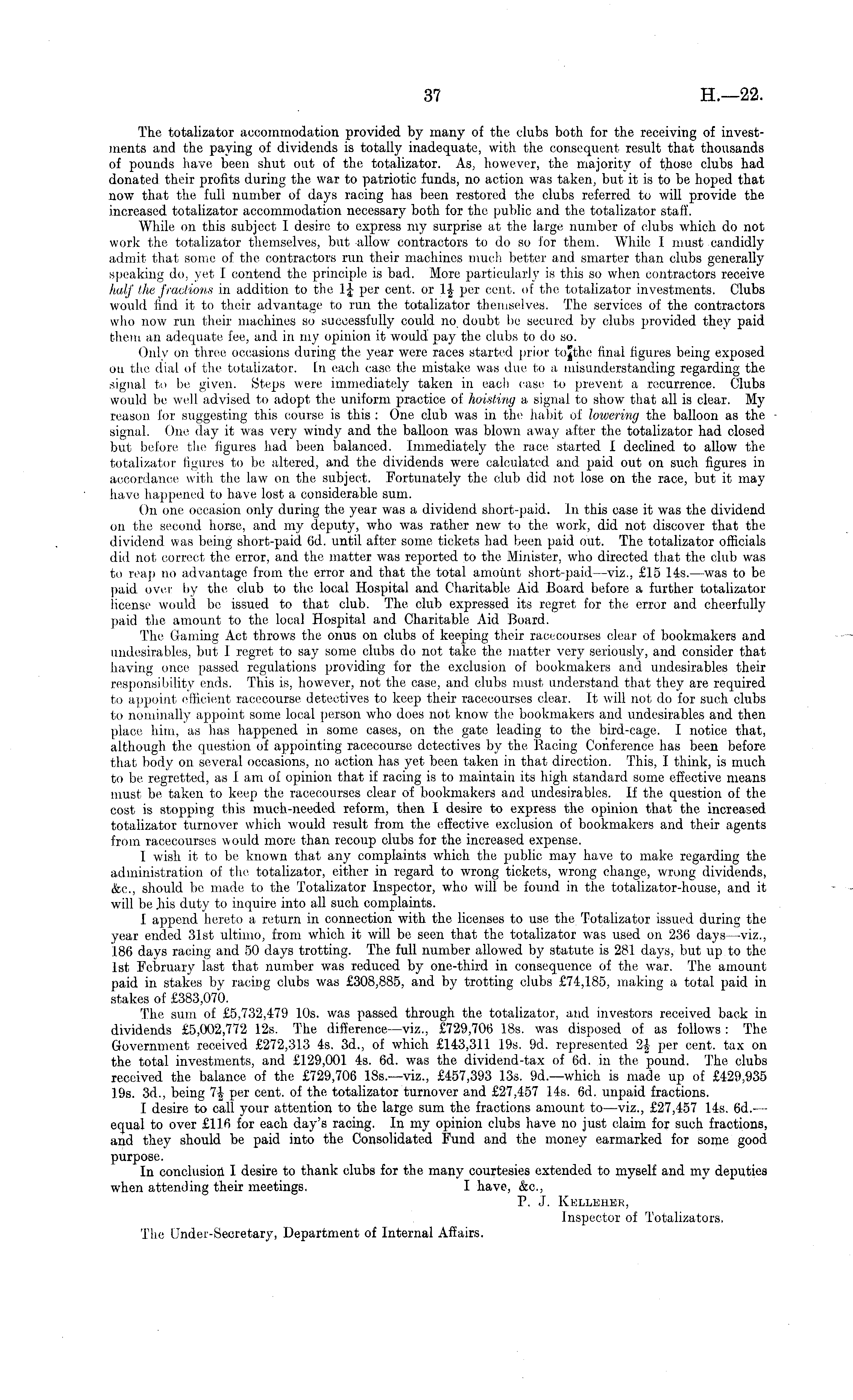 The totalizator accommodation provided by many of the clubs both for the receiving of investments and the paying of dividends is totally inadequate, with the consequent result that thousands of pounds have been shut out of the totalizator. As, however, the majority of those clubs had donated their profits during the war to patriotic funds, no action was taken, but it is to be hoped that now that the full number of days racing has been restored the clubs referred to will provide the increased totalizator accommodation necessary both for the public and the totalizator staff. While on this subject I desire to express my surprise at the large number of clubs which do not work the totalizator themselves, but allow contractors to do so for them. While I must candidly admit that some of the contractors run their machines much better and smarter than clubs generally speaking do, yet I contend the principle is bad. More particularly is this so when contractors receive half the fractions in addition to the l-\ per cent, or 1|- per cent, of the totalizator investments. Clubs would find it to their advantage to run the totalizator themselves. The services of the contractors who now run their machines so successfully could no doubt be secured by clubs provided they paid them an adequate fee, and in my opinion it would pay the clubs to do so. Only on three occasions during the year were races started prior tojthe final figures being exposed on the dial of the totalizator. In each case the mistake was due to a misunderstanding regarding the signal to be given. Steps were immediately taken in each case to prevent a recurrence. Clubs would be well advised to adopt the uniform practice of hoisting a signal to show that all is clear. My reason for suggesting this course is this : One club was in the habit of lowering the balloon as the signal. One day it was very windy and the balloon was blown away after the totalizator had closed but before the figures had been balanced. Immediately the race started I declined, to allow the totalizator figures to be altered, and the dividends were calculated and. paid out on such figures in accordance with the law on the subject. Fortunately the club did not lose on the race, but it may have happened to have lost a considerable sum. On one occasion only during the year was a dividend short-paid. In this case it was the dividend on the second horse, and my deputy, who was rather new to the work, did not discover that the dividend was being short-paid 6d. until after some tickets had been paid out. The totalizator officials did not correct the error, and the matter was reported to the Minister, who directed that the club was to reap no advantage from the error and that the total amount short-paid—viz, £15 14s.—was to be paid over by the club to the local Hospital and Charitable Aid Board before a further totalizator license would be issued to that club. The club expressed its regret for the error and cheerfully paid the amount to the local Hospital and Charitable Aid Board. The Gaming Act throws the onus on clubs of keeping their racecourses clear of bookmakers and undesirables, but 1 regret to say some clubs do not take the matter very seriously, and consider that having once passed regulations providing for the exclusion of bookmakers and undesirables their responsibility ends. This is, however, not the case, and clubs must understand, that they are required to appoint efficient racecourse detectives to keep their racecourses clear. It will not do for such clubs to nominally appoint some local person who does not know the bookmakers and undesirables and then place him, as has happened in some cases, on the gate leading to the bird-cage. I notice that, although the question of appointing racecourse detectives by the Racing Conference has been before that body on several occasions, no action has yet been taken in that direction. This, I think, is much to be regretted, as I am of opinion that if racing is to maintain its high standard some effective means must be taken to keep the racecourses clear of bookmakers and undesirables. If the question of the cost is stopping this much-needed reform, then I desire to express the opinion that the increased totalizator turnover which would result from the effective exclusion of bookmakers and their agents from racecourses would more than recoup clubs for the increased expense. I wish it to be known that any complaints which the public may have to make regarding the administration of the totalizator, either in regard to wrong tickets, wrong change, wrong dividends, &c, should be made to the Totalizator Inspector, who will, be found in the totalizator-house, and it will be his duty to inquire into all such complaints. I append hereto a return in connection with the licenses to use the Totalizator issued during the year ended 31st ultimo, from which it will be seen that the totalizator was used on 236 days—viz, 186 days racing and 50 days trotting. The full number allowed by statute is 281 days, but up to the Ist February last that number was reduced by one-third in consequence of the war. The amount paid in stakes by racing clubs was £308,885, and by trotting clubs £74,185, making a total paid in stakes of £383,070. The sum of £5,732,479 10s. was passed through the totalizator, and investors received back in dividends £5,002,772 12s. The difference—viz, £729,706 18s. was disposed of as follows : The Government received £272,313 4s. 3d, of which £143,311 19s. 9d. represented 2| per cent, tax on the total investments, and £129,001 4s. 6d. was the dividend-tax of 6d. in the pound. The clubs received the balance of the £729,706 18s.—viz, £457,393 13s. 9d.—which is made up of £429,935 19s. 3d, being 7| per cent, of the totalizator turnover and £27,457 14s. 6d. unpaid fractions. I desire to call your attention to the large sum the fractions amount to —viz, £27,457 14s. 6d. — equal to over £116 for each day's 