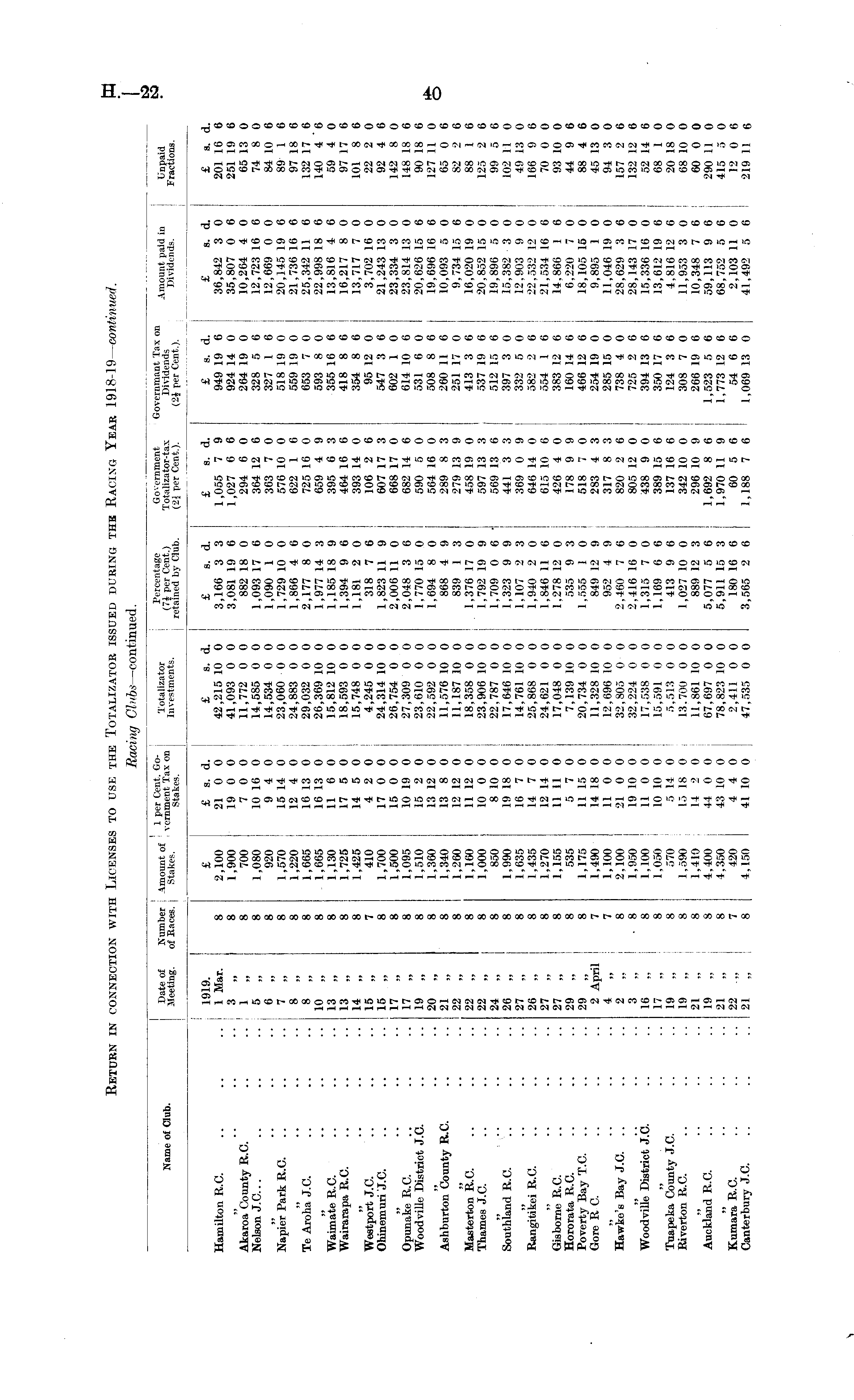 Return in connection with Licenses to use the Totalizator issued during the Racing Year 1918-19— continued. Racing Clubs — continued.