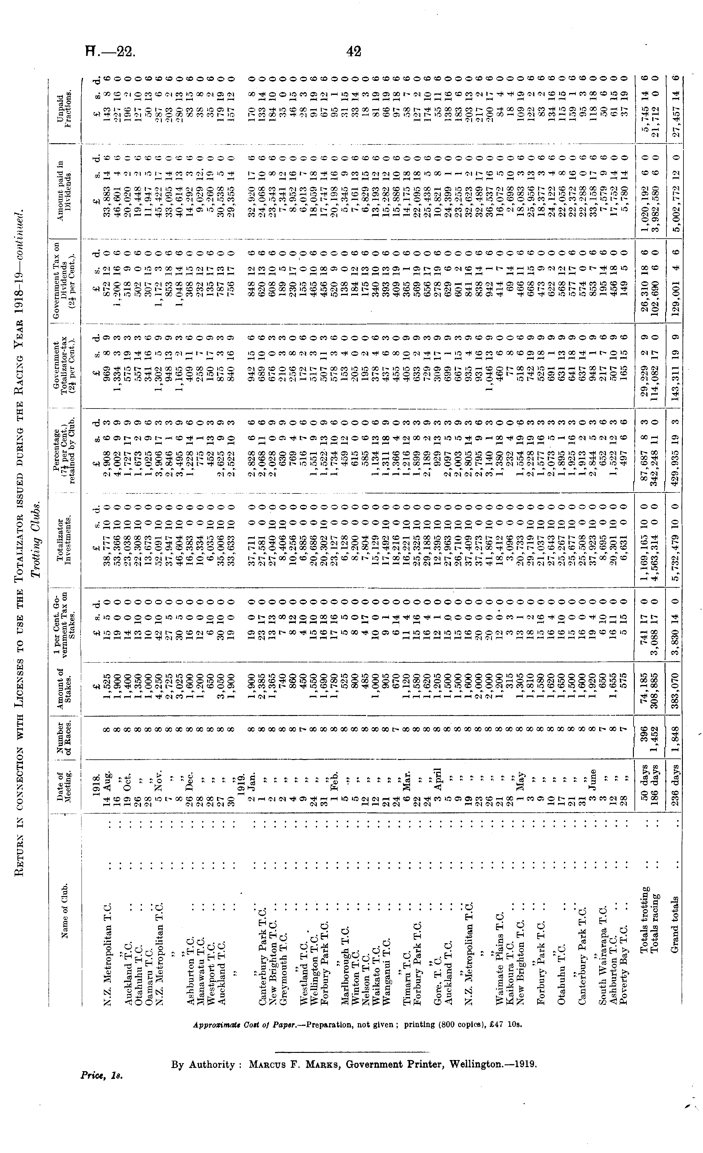Name of Club. Date of Meeting. Number of Races. Amount of I P er C f *• Go " afotio vernment Tax on Stakes. Stakes. Totalizator Investments. Percentage (71 per Cent.) retained by Club. Government Totalizator-tax (21 per Cent.). I Government Tax on Dividends (U per Cent.). Amount paid in Dividends Unpaid Fractions. N.Z. Metropolitan T.C. Auckland T.C. Otahuhu T.C. Oamaru T.C. N.Z. Metropolitan T.C. 1918. 14 Aug. 16 „ 19 Oct, 26 „ 28 „ 5 Nov. 7 ., 8 „ 26 Dec. 28 „ 28 „ 27 „ 30 „ 1919. 2 Jan. 1 „ 4 „ 9 „ 24 „ 31 „ 1 Feb. 5 „ 5 ,. 12 „ 12 ., 21 „ 24 „ 6 Mar. 22 „ 24 „ 3 April 5 „ 9 „ 19 „ 23 „ 26 ,. 21 „ 28 „ 1 May 3 „ 9 „ 10 „ 17 „ 21 „ 31 „ 3 June 3 „ 12 „ 28 „ 8 8 8 8 8 8 8 8 8 8 8 8 8 £ 1,525 1,900 1,400 1,350 1,000 4,250 2,725 3,025 1,600 1,200 650 3,050 1,900 £ s. d. 15 5 0 19 0 0 14 0 0 13 10 0 10 0 0 42 10 0 27 5 0 30 5 0 16 0 0 12 0 0 6 10 0 30 10 0 19 0 0 £ s. d. 38,777 10 0 i 53,366 10 0 ! 23,038 10 0 : 22,308 10 0 ' 13,673 0 0 ! 52,091 10 0 ! 37,947 10 0 I 46,604 10 0 16,383 0 0 : 10,334 0 0 6,035 10 0 35.006 10 0 ! 33,633 10 0 £ s. d. 2,908 6 3 4,002 9 9 1,727 17 9 1,673 2 9 1,025 9 6 3,906 17 3 2,846 1 3 3,495 6 9 1,228 14 6 775 1 0 452 13 3 2,625 9 9 2,522 10 3 £ s. d. 969 8 9 1,334 3 3 575 19 3 657 14 3 341 16 6 1,302 5 9 948 13 9 1,165 2 3 409 11 6 258 7 0 150 17 9 875 3 3 840 16 9 £ s. d. 872 12 0 1,200 16 6 518 9 0 502 0 6 307 15 0 1,172 3 0 853 18 6 1,048 14 6 368 15 0 232 12 0 135 17 6 787 13 0 756 17 0 £ s. d. ! 33,883 14 6 46,601 4 6 20,020 2 0 19,448 2 6 11,947 5 6 45,422 17 6 33,095 14 0 40.614 13 6 14,292 3 6 9,029 12. 0 5,260 19 0 30,538 5 0 29,355 14 0 £ s. d. 143 8 6 227 16 0 196 2 0 127 10 0 50 13 6 287 6 6 203 2 6 280 13 0 83 15 6 38 8 0 35 2 6 179 19 0 157 12 0 Ashburton T.C. Manawatu T.C. Wcstport T.C. Auckland T.C. Canterbury Park T.C. New Brighton T.C. .. Greymouth T.C. Westland T.C. Wellington T.C. Forbury Park T.C. .. Marlborough T.C. Winton T.C. Nelson T.C. Waikato T.C. Wanganui T.C. TimaruT.C. ! '. Forbury Park T.C. .. Gore. T. C. ! '. Auckland T.C. 8 8 8 8 8 7 8 8 8 8 8 8 8 8 7 8 8 8 8 8 8 8 8 8 8 8 8 8 8 8 8 8 8 8 7 8 7 1,900 2,385 1,365 740 860 450 1,550 1,690 1,780 525 800 485 1,000 905 670 1,120 1,580 1,620 1,205 1,500 1,500 1,600 2,000 2,000 1,200 315 1,305 1,810 1,580 1,620 1,650 1,500 1,600 1,920 650 1,655 575 19 0 0 23 17 0 13 13 0 7 8 0 8 12 0 4 10 0 15 10 0 16 18 0 17 16 0 5 5 0 8 0 0 4 17 0 10 0 0 9 1 0 6 14 0 11 4 0 15 16 0 16 4 0 12 1 0 15 0 0 15 0 0 16 0 0 20 0 0 20 0 0 12 0-0 3 3 0 13 1 0 18 2 0 15 16 0 16 4 0 16 10 0 15 0 0 16 0 0 19 4 0 6 10 0 16 11 0 5 15 0 37,711 0 0 27,581 0 0 I 27,040 10 0 8,406 10 0 i 10,256 0 0 j 6,885 0 0 : 20,686 0 0 I 20,302 10 0 23,127 0 0 6,128 0 0 8,200 0 0 7.804 0 0 j 15,129 0 0 i 17,492 10 0 ! 18,216 0 0 16,221 10 0 25,325 10 0 29,188 10 0 12,395 10 0 27.963 10 0 26,710 10 0 37,409 10 0 37,273 0 0 41,867 10 0 18,412 0 0 3,096 0 0 20,733 0 0 29,719 10 0 21,037 10 0 27,643 10 0 25,267 10 0 25,677 10 0 25,508 0 0 37,923 10 0 8,695 0 0 20.301 10 0 6,631 0 0 2,828 6 6 2,068 11 6 2,028 0 9 630 9 9 769 4 0 516 7 6 1,551 9 0 1,522 13 9 1,734 10 6 459 12 0 615 0 0 585 6 0 1.134 13 6 1,311 18 9 1,366 4 0 1,216 12 3 1,899 8 3 2,189 2 9 929 13 3 2,097 5 3 2,003 5 9 2,805 14 3 2,795 9 6 3,140 1 3 1,380 18 0 232 4 0 1,554 19 6 2,228 19 3 1,577 16 3 2,073 5 3 1,895 1 3 1,925 16 3 1,913 2 0 2,844 5 3 652 2 6 1,522 12 3 497 6 6 942 15 6 689 10 6 676 0 3 210 3 3 256 8 0 172 2 6 517 3 0 507 11 3 578 3 6 153 4 0 205 0 0 195 2 0 378 4 6 437 6 3 455 8 0 405 10 9 633 2 9 729 14 3 309 17 9 699 1 9 667 15 3 935 4 9 931 16 6 1,046 13 9 460 6 0 77 8 0 518 6 6 742 19 9 525 18 9 691 1 9 631 13 9 641 18 9 637 14 0 948 1 9 217 7 6 507 10 9 165 15 6 848 12 6 620 13 6 608 10 6 189 5 0 230 17 0 155 0 0 465 10 6 456 18 0 520 9 0 138 0 0 184 12 6 175 13 6 340 10 0 393 13 6 ! 409 19 0 365 1 6 569 19 0 656 17 0 278 19 6 629 6 0 601 2 0 841 16 0 i 838 14 6 942 1 6 414 7 0 69 14 0 466 11 6 668 15 6 473 9 0 622 2 0 568 12 0 577 17 6 574 0 0 853 7 6 195 14 6 456 18 0 149 5 0 32.920 17 6 24,068 10 6 23,543 8 6 7,341 12 0 8,952 16 0 6,013 7 0 ; 18,059 18 0 17,747 14 6 20,198 16 0 ' 5.345 9 0 7,161 13 6 6,829 15 6 ; 13,193 12 6 15,282 12 0 15,886 10 6 l 14,175 18 0 22,095 18 0 25,438 5 6 10,821 8 0 24,399 1 0 23,255 1 0 32,623 2 0 32,489 17 0 36,537 16 0 16,072 5 0 2,698 10 0 18,083 3 6 25,956 13 0 18,377 3 6 24,122 4 6 22,056 8 0 22,372 16 0 22,288 0 6 33,158 17 6 7,579 9 6 17,752 14 0 5,780 14 0 170 8 0 133 14 0 184 10 0 35 0 0 46 15 0 28 3 0 91 19 6 67 12 6 95 1 0 31 15 0 33 14 0 18 3 0 81 19 6 66 19 6 97 18 6 58 7 6 127 2 0 174 10 6 55 11 6 138 16 0 183 6 0 203 13 0 217 2 6 200 17 6 84 4 C 18 4 0 109 19 0 122 2 t 83 2 6 134 16 e 115 15 0 159 1 £ 95 3 t 118 18 C 50 6 C 61 15 C 37 19 0 N.Z. .Metropolitan T.C. Waimate Plains T.C. Kaikoura T.C. New Brighton T.C. .. Forbury Park T.C. .. Otahuhu T.C. Canterbury Park T.C. South Wairarapa T.C. Ashburton T.C. Poverty Bay T.C. .. Totals trotting Totals racing 50 davs 186 days 236 days 396 1,452 74,185 308,885 741 17 0 3,088 17 0 1,169,165 10 0 4,563,314 0 0 87,687 8 3 342,248 11 0 29,229 2 9 114,082 17 0 26,310 18 6 102,690 6 0 1,020,192 6 0 3,982,580 6 0 5,745 14 21,712 0 Grand totals 1,848 383,070 3,830 14 0 5,732,479 10 0 429,935 19 3 143,311 19 9 129,001 4 12,772 12 27,4i 7 14