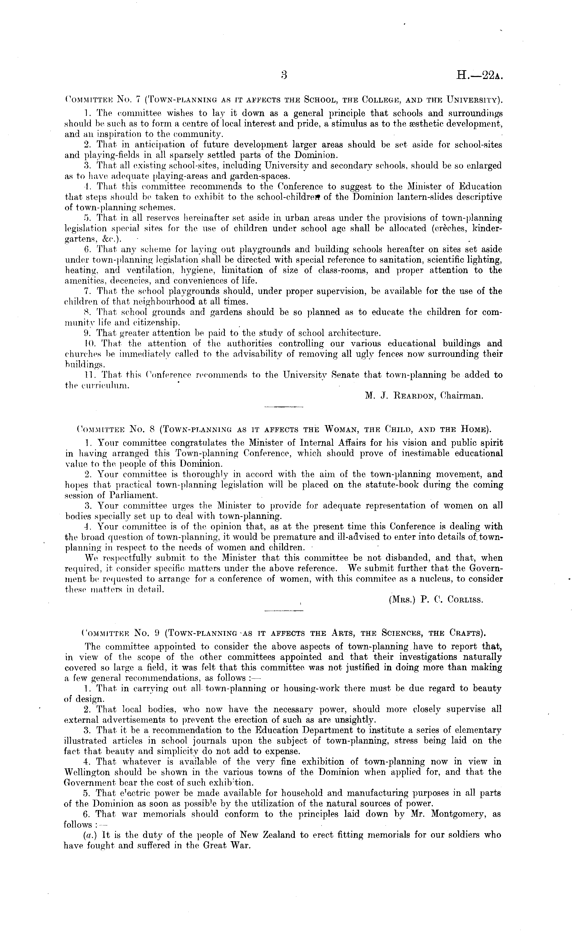 Committee No. 7 (Town-planning as it affects the School, the College, and the University). 1. The committee wishes to lay it down as a general principle that schools and surroundings should be such as to form a centre of local interest and pride, a stimulus as to the aesthetic development, and an inspiration to the community. 2. That in anticipation of future development larger areas should be set aside for school-sites and playing-fields in all sparsely settled parts of the Dominion. 3. That all existing school-sites, including University and secondary schools, should be so enlarged as to have adequate playing-areas and garden-spaces. I. That this committee recommends to the Conference, to suggest to the Minister of Education that steps should be taken to exhibit to the school-childreit of the Dominion lantern-slides descriptive of town-planning schemes. 5. That in all reserves hereinafter set aside in urban areas under the provisions of town-planning legislation special sites for the use of children under school age shall be allocated (creches, kindergartens, &c). 6. That any scheme for laying out playgrounds and building schools hereafter on sites set aside under town-planning legislation shall be directed with special reference to sanitation, scientific lighting, heating, and ventilation, hygiene, limitation of size of class-rooms, and proper attention to the amenities, decencies, and conveniences of life. 7. That the school playgrounds should, under proper supervision, be available for the use of the children of that neighbourhood at all times. 8. That school grounds and gardens should be so planned as to educate the children for community life and citizenship. 9. That greater attention be paid to the study of school architecture. 10. That the attention of the authorities controlling our various educational buildings and churches be immediately called to the advisability of removing all ugly fences now surrounding their buildings. 11. That this Conference recommends to the University Senate that town-planning be added to the curriculum. M. J. Reardon, Chairman. Committee No. 8 (Town-planning as it affects the Woman, the Child, and the Home). 1. Your committee congratulates the Minister of Internal Affairs for his vision and. public spirit in having arranged this Town-planning Conference, which should prove of inestimable educational value to the people of this Dominion. 2. Your committee is thoroughly in accord with the aim of the town-planning movement, and hopes that practical town-planning legislation will be placed on the statute-book during the coming session of Parliament. 3. Your committee urges the Minister to provide for adequate representation of women on all bodies specially set up to deal with town-planning. 1. Your committee is of the opinion that, as at the present time this Conference is dealing with the broad question of town-planning, it would be premature and ill-advised to enter into details of.townplanning in respect to the needs of women and children. We respectfully submit to the Minister that this committee be not disbanded, and that, when required, if consider specific matters under the above reference. We submit further that the Government be requested to arrange for a conference of women, with this commitee as a nucleus, to consider these matters in detail. (Mrs.) P. C. Corliss. Committee No. 9 (Town-planning-as it affects the Arts, the Sciences, the Crafts). The committee appointed to consider the above aspects of town-planning have to report that, in view of the scope of the other committees appointed and that their investigations naturally covered so large a field, it was felt that this committee was not justified in doing more than making a few general recommendations, as follows : — 1. That in carrying out all town-planning or housing-work there must be due regard to beauty of design. 2. That local bodies, who now have the necessary power, should, more closely supervise all external advertisements to prevent the erection of such as are. unsightly. 3. That it be a recommendation to the Education Department to institute a series of elementary illustrated articles in school journals upon the subject of town-planning, stress being laid on the fact that beauty and simplicity do not add to expense. 4. That whatever is available of the very fine exhibition of town-planning now in view in Wellington should be shown in the various towns of the Dominion when applied for, and that the Government bear the cost of such exhilrtion. 5. That e'ectric power be made available for household and manufacturing purposes in all parts of the Dominion as soon as possible by the utilization of the natural sources of power. 6. That war memorials should conform to the principles laid, down by Mr. Montgomery, as follows :— (a.) It is the duty of the people of New Zealand to erect fitting memorials for our soldiers who have fought and suffered in the Great War.