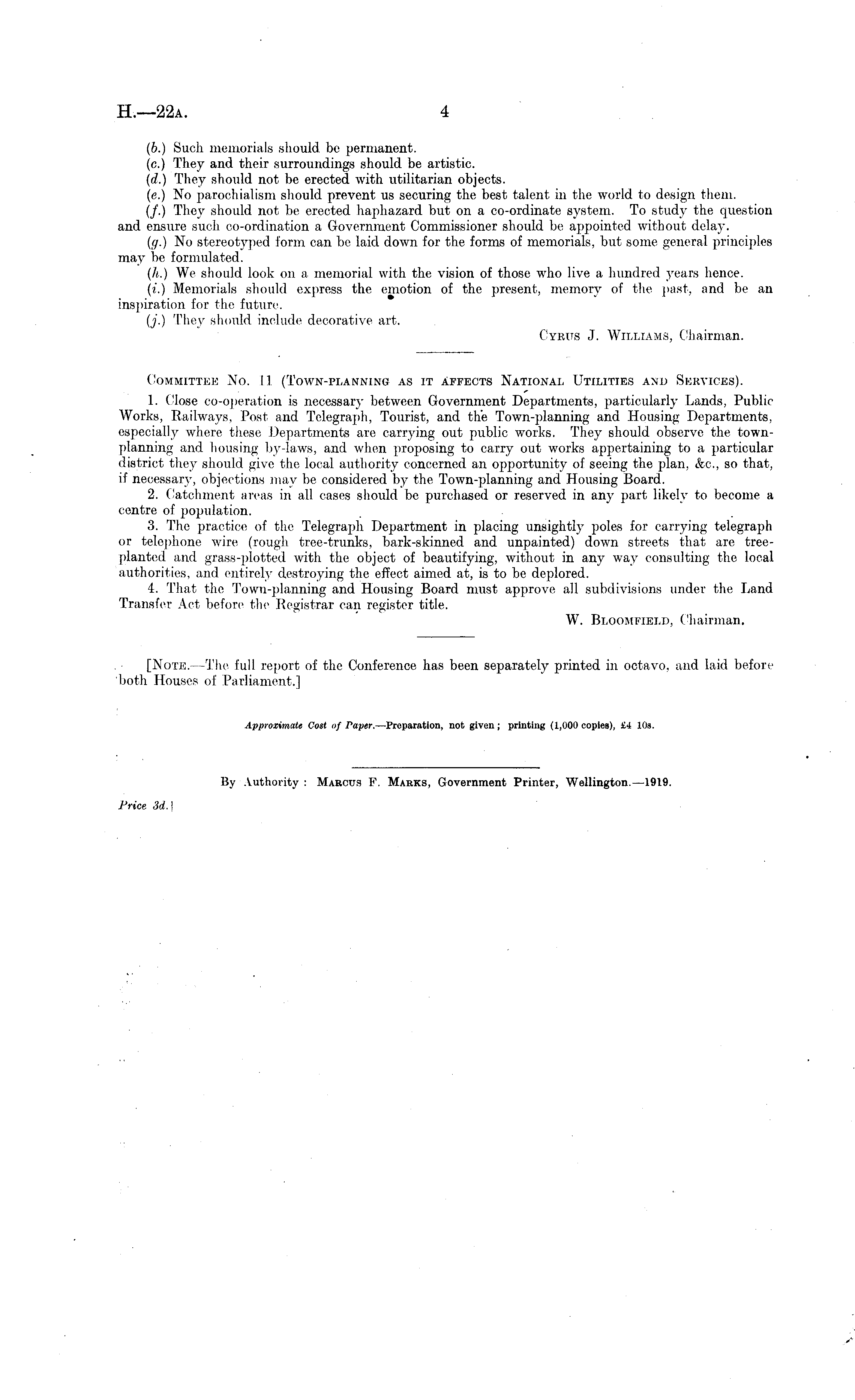 (b.) Such memorials should, be permanent. (c.) They and their surroundings should be artistic. (d.) They should not be erected with utilitarian objects. (c.) No parochialism should prevent us securing the best talent in the world to design them. (/.) They should not be erected haphazard but on a co-ordinate system. To study the question and ensure such co-ordination a Government Commissioner should be appointed without delay. (a.) No stereotyped form can be laid down for the forms of memorials, but some general principles may be formulated. (h.) We should look on a memorial with the vision of those who live a hundred years hence. («.) Memorials should express the emotion of the present, memory of the past, and be an inspiration for the future. (j.) They should include decorative art. Cyrus J. Williams, Chairman. Committee No. II (Town-planning as it Affects National Utilities and Services). 1. Close co-operation is necessary between Government Departments, particularly Lands, Public Works, Railways, Post and Telegraph, Tourist, and the Town-planning and Housing Departments, especially where these Departments are carrying out public works. They should observe the townplanning and housing by-laws, and when proposing to carry out works appertaining to a particular district they should give the local authority concerned an opportunity of seeing the plan, &c, so that, if necessary, objections may be considered by the Town-planning and Housing Board. 2. Catchment areas in all cases should be purchased or reserved in any part likely to become a centre of population. 3. The practice of the Telegraph Department in placing unsightly poles for carrying telegraph or telephone wire (rough tree-trunks, bark-skinned and unpainted) down streets that are treeplanted and grass-plotted with the object of beautifying, without in any way consulting the local authorities, and entirely destroying the effect aimed at, is to be deplored. 4. That the Town-planning and Housing Board must approve all subdivisions under the Land Transfer Act before the Registrar can register title. W. Bloomfield, Chairman. [Note.- The full report of the Conference has been separately printed in octavo, and laid before both Houses of Parliament.]