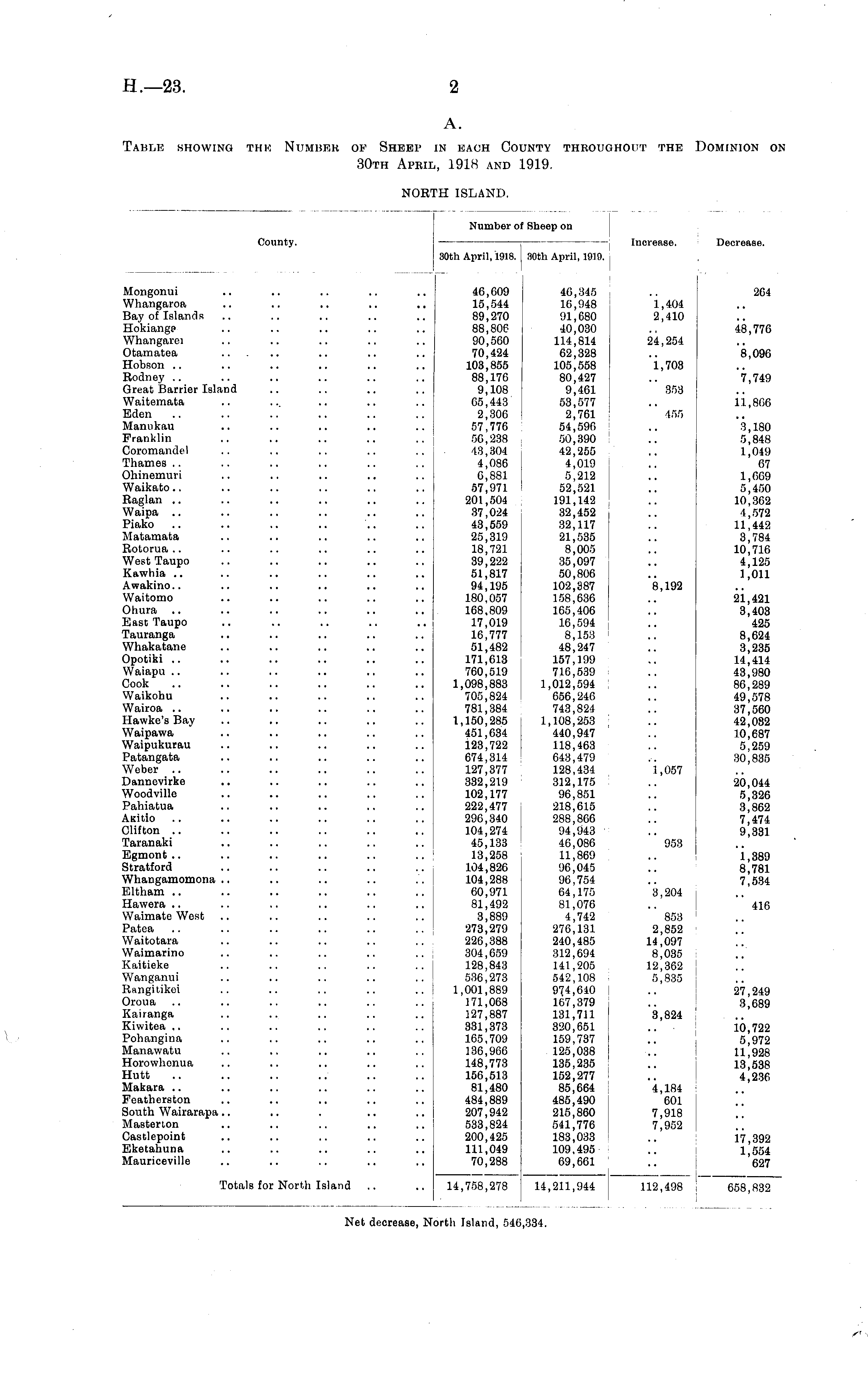 A. Table showing the Number of Sheep in each County throughout the Dominion on 30th April, 1918 and 1919. NORTH ISLAND.