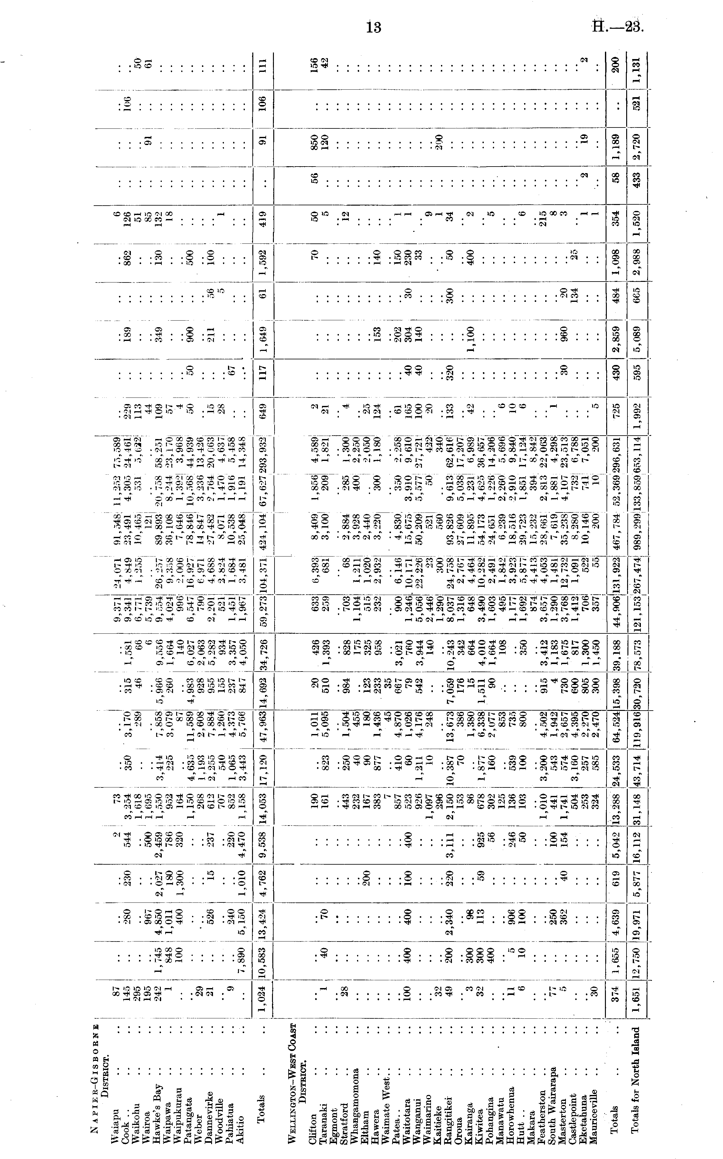 N A P I E R-G i s b o r n e District. Waiapu .. .. 87 .. .. .. 2 ! 73 9,371 if 1,071 91,548j 11,252 75,589] .. .. .. .. 6 .. .. .. ! Cook.. .. .. 145 .. 280 230 544 3,254 350 '3,170 315 1,581 9,341 4,849 23,491 4,305 24,461 229 .. 189 .. 862 126 .. .. 106! Waikohu .. .. 295 .. .. .. .. : 1,618 .. , 289| 46 | 66 6,771 1,255 10,465 : 531 5,622] 113 .. .. .. .. I 51 .. .. .. I 50 Wairoa .. .. 195 .. 967 .. 500 1 1,695 .. .. ..J 6 5,739 .. 121 ..!..] 44 .. .. .. .. 85 .. 91 .. 61 Hawke's Bay .. .. 242 1,745 4,850 2,027 2,459 1,550 3,414 7,858! 5,966 ! 9,566 9,554 26,257 89,893 ! 20,758' 58,251 109 .. 349 .. 130 ' 132 .. .. Waipawa .. .. 1 848 1,011 180 786 952 225 3,079 260 1,664 4,024 9,358 36,108 8,244 23, 170j 57 j .. .. .. 18 .. j Waipukurau .. .. .. 100 400 1,300 320 164 .. 87 140 996 2,006 7,646, 1,392 3,968! 4 .. .. .. .. ; .. .. Patangata .. .. .. .. .. .. .. 1,150 4,635! 11,589 4,983 ! 6,027 6,547 16,927 78,846 ! 10,568! 44,939 1 50 1 50 900 .. 500 Weber .. .. 29 .. ... .. .. 268 1.193 2,608 928 1 2,063 790 6,971 14,847! 3,236 13,426 .. .. .. | ' I Dannevirke .. .. 21 .. 526 15 237 612 7,884 955 i 5,282 2,201 4,688 27,482 2,764 20,063! 15 j 211 56 100 !.. Woodville .. .. .. ... .. j .. .. 707 540 ; 1,260 155 ! 934 521 8,071 1,470 4,637 28 I .. j 5 .. | 1 Pahiatua .. .. 9 .. 240 .. 220 852 1,065 4,373 237 3,357 1,451 1.684 10,538 1,916 5,458 .. 67 Akitio .. .. .. 7,890 5,150 1,010 4,470 1,158 3,443 5,766 847 4,050 1,967 3,481 25,048 1,191 14,348 .. ... L Totals .. .. 1,024 10,583 13,424 4,762 9,538 14,053 17,120 47,96314,692 34,726 59,273 104, 371i 424, 104 67,627 293, 932 | 649 117 1,649 61 1,592 419 .. 91 106 111 . j | _ _ - Wellington-West Coast District. Clifton .. .. .. .. .. .. .. 190 .. 1,011 20 426 633 6,393; 8,409] 1,856 4,589 2 .. .. 70 50 56 850 156 Taranaki .. .. 1 40 70 .. 161 823 5,095 510 1,393 259 681 3,100 209 1,821 21 .. .. .. .. 5 .. 120 .. 42 Egmont Stratford .. .. 28 .. .. .. .. 443 250 1,504 984 828 703 68 2,884 285 1,300 4 .. .. .. .. \2 Whangamomona .. .. .. .. .. .. 232 40 455 175 1,104 1,211 3,928 400 2,250 ; Eltham .. .. .. .. .. 200 .. 167 90 180 123 325 515 1,020 2,440 .. : 2,050 25 Hawera .. .. .. .. .. .. .. 383 877 1,436 233 958 232 2,932 3,220 300 1,180 124 .. 153 .. 140 Waimate West.. .. .. .. .. .. .. 7 .. 45 35 .. .. .. .. Patea.. .. .. .. .. .. .. .. 857 iio 4,870 667 3,021 900 6J46 4,830 350 2,258 61 .. 202 .. 150 1 Waitotara .. .. 100 400 400 100 400 523 60 1,026 79 760 1,246.10,171 15,675 3,910 9,610 165 40 304 30 230 1 Wanganui .. .. .. .. .. .. .. 926 1,211 4,176 542 3,944 5,056 22,226 50,209 5,577 27,721 100 40 140 .. 33 Waimarino .. .. .. .. .. .. .. 1,097 10 248 .. 140 2,446 23 521 50 422 20 .. .. .. .. 9 Kaitieke .. .. 32 .. .. .. .. 296 .. .. .. .. 1,290 300 560 340 .. .. .. '.. 1 .. 200 Rangitikei .. .. 49 200 2,340 220 3,111 2,150 10,387 13,673 7,059 10,243 8,037 24,758 93,826 9,613 62,616 133 320 .. 300 50 34 Oroua .. .. .. .. .. .. .. 153 70 386 176 342 1,316 2,767 27,609 5,038 17,207 Kairanga .. .. 3 300 98 .. .. 86 .. 1,380 15 664 648 4,464 11,895 1,231 6,989 42 .. 1,100 .. 400 2 Kiwitea .. .. 32 300 113 59 925 678 1,877 6,338 1,511 4,010 3,490 10,282 54,173 4,625 36,657 Pohangina .. .. .. 400 .. .. 56 302 160 2,077 90 1,664 1,603 2,491 24,651 1,226 14,206 .. .. .. .. .. 5 Manawatu .. ' .. .. .. .. .. .. 125 .. 853 .. 108 495 1,842 6,239 2,260 5,696 6 Horowhenua .. .. 11 5 906 .. 246 136 539 735 .. .. 1,177 3,923 18,516 2,910 9,840 10 Hutt.. .. .. 6 10 100 .. 50 103 100 800 .. 350 1,692 5,877 29,723 1,851 17,124 6 .. .. .. .. 6 Makara .. .. .. .. .. .. .. .. .. .. .. .. 87 4 4,413 15,232 394 8,842 Featherston .. .. .. .. .. .. .. 1,010 3,200 4,502 915 3,412 3,657 4,053 28,661 2,813 22,063 .. .. .. .. .. 215 South Wairarapa .. 77 .. 250 .. 100 441 543 1,942 4 1,183 1,290 1,481 7,619, 1,881 4,298 1 .. .. .. .. 8 Masterton .. .. 5 .. 362: 40 154 1,741 574 2,657 730 1,675 3,768 12,732 35,238! 4,107 23,513 .. 30 960 20 .. 3 Castlepoint .. .. .. .. .. .. .. 504 3,160 I 4,395 600 817 1,412 1,091 8,280! 732 6,788 .. .. .. 134 25 Eketahuna .. .. .. .. .. .. .. 253 257 I 2,270 805 1,300 706 522 10,146] 741 7,051 .. .. .. .. .. 1 2 19 2 Mauriceville .. .. 30 .. .. | .. .. 324 585 2,470 300 1,450 357 ] 55 200 10 200 5 .. .. .. .. 1 Totals .. .. 374 1,655 4,639 619 5,042 13,288 24,533 64,52415,398 39,188 44,006 131,922 467,784 52,369 296,631 725 430 2,859 484 1,098 354 58 1,189 .. 200 Totals for North Island 1,651 12,750 19,971 5,877 16,112 31,148 43,714 119,916 30,720 78,573 121, 153267,474 989,299 133,859 653, 114 1,992 595 5,089 665 2,988 1,520 433 2,720 521 1,131