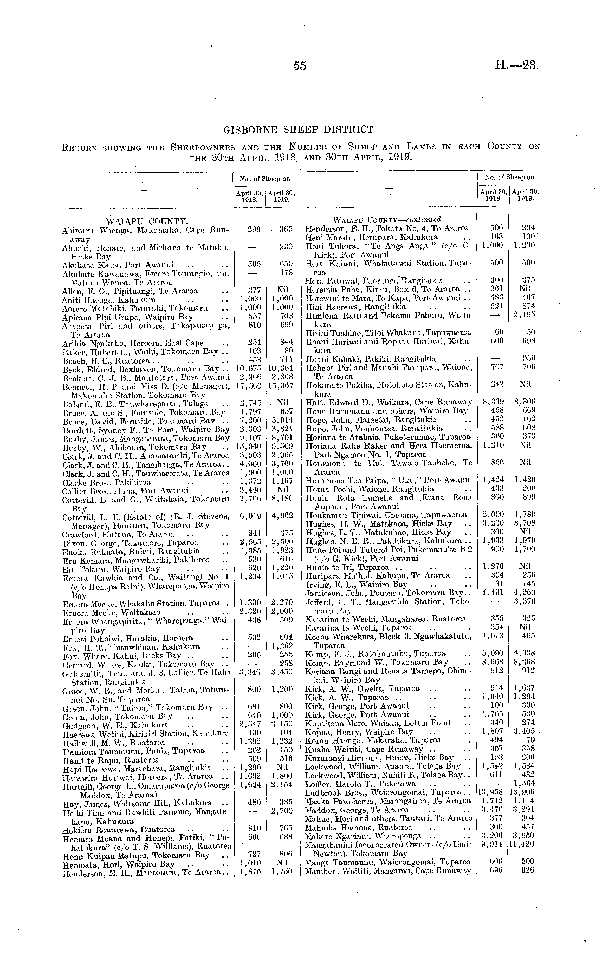 GISBORNE SHEEP DISTRICT Return showing the Sheepowners and the Number of Sheep and Lambs in each County on the 30th April, 1918, and 30th April, 1919.