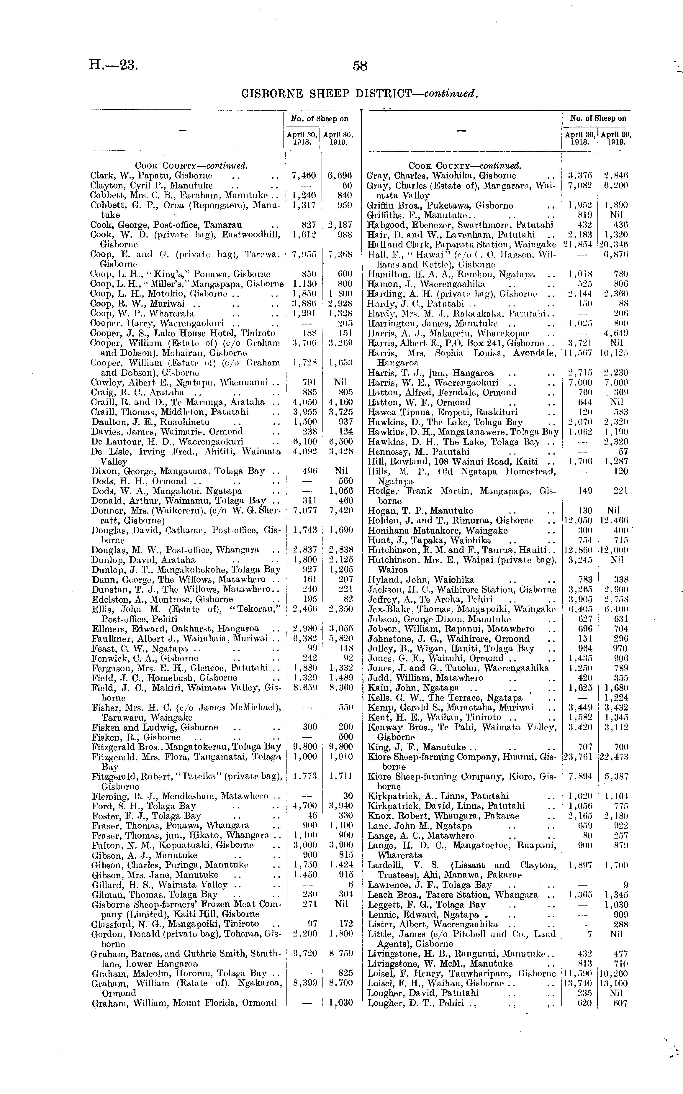 No. of Sheep on April 30,1 April 31 1918, 1919. April 30. 1019. April 30, April 30, 1918. 1919. No. of Sheep on Cook County— continued. Clark, W„ Papatu, Gisborno .. .. 7,460 6,69( Clayton, Cyril P., Manutuke .. .. 6( Cobbett, Mrs. C. B., Farnham, Manutuke .. ! 1,240 84( Cobbett, G. P., Oroa (Repongaore), Manu- : 1,317 95( tuke Cook, George, Post-office, Tamarau .. i 827 2,18' Cook, W. D. (private bag), Eastwoodhill, 1,612 98! Gisborne Coop, E. and G. (private bag), Tarewa, 7,955 7,26i Gisborne Coop, L. H„, "King's," Pouawa, Gisborne 850 60( Coop, L. H.," Miller's," .Mangapapa, Gisborne! 1,130 801 Coop, L. H., Motokio, Gisborne .. .. 1,850 I80( Coop, R. W., Muriwai .. .. .. 3,886 2,921 Coop, W. P., Wharerata .. .. 1,291 1,321 Cooper, Harry, Wacrengaokuri .. .. — 201 Cooper, J. S., Lake House Hotel, Tiniroto 188 15 Cooper, William (Estate of) (e/o Graham ' 3,706 3.261 and Dobson), Mohairau, Gisborne Cooper, William (Estate of) (c/o Graham ! 1,728 1,651 and Dobson), Gisborne Cowley, Albert E., Ngatapu, Whenuanui .. 791 Nil Craig, R. G, Arataha .. .. .. 885 80 Craill, R. and D„ Te Marunga, Arataha .. 4,050 4,I6l Craill, Thomas, Middleton, Patutahi .. 3,955 3,72i Daulton, J. E., Ruaohinetu .. .. 1,500 93' Davies, James, Waimarie, Ormond .. 238 I2< De Lautour, H. D., Wacrengaokuri .. 0, 100 6,501 De Lisle, Irving Fred., Ahititi, Waimata 4,092 3,42: Valley Dixon, George, Mangatuna, Tolaga Bay .. 496 Nil Dods, H. H, Ormond . . .. .. ' 56i Dods, W. A., Mangahoui, Ngatapa .. : — 1,05' Donald, Arthur, Waimamu, Tolaga Bay .. 311 46i Donner, Mrs. (Waikcreru), (c/o W. G. Sher- 7,077 7,42i ratt, Gisborne) Douglas, David, Cathame, Post-office, Gis- ! 1,743 1,8ft borne Douglas, M. W., Post-office, Whangara .,2,837 2,83 Dunlop, David, Arataha .. .. 1,800 2,12, Dunlop, J. T., Mangakohekohe, Tolaga Bay 927 1,26, Dunn, Georgo, The Willows, Matawhero .. 161 20' Dunstan, T. J., The Willows, Matawhero.. 240 22 Edelsten, A., Montrose, Gisborne .. 195 8: Ellis, John M. (Estate of), " Tekorau," 2,466 2,35i Post-offico, Pehiri EUmers, Edwaid, Oakhurst, Hangaroa .. 2,980- 3,05, Faulkner, Albert J., Wairahaia, Muriwai .. ' 6,382 5,82i Feast, C. W., Ngatapa .. .. .. j 99 14 Fenwick, C. A., Gisborne .. .. 242 9: Ferguson, Mrs. E. H., Glencoe, Patutahi .. : 1,880 1,33: Field, J. G, Homebush, Gisborno ..i 1,329 1,48 Field, J. G, Makiri, Waimata Valley, Gis- 8,059 8,36 borne Fisher, Mrs. H. C. (o/o James McMichael), 55< Tarawaru, Waingake Fisken and Ludwig, Gisborne .. .. 300 20' Fisken, R., Gisborne . . .. .. ! — 50i Fitzgerald Bros., Mangatokcrau, Tolaga Bay 9,800 il, 80i Fitzgerald, Mrs. Flora, Tangamatai, Tolaga j 1,000 1,0Ii Bay Fitzgerald,Itobert, "Pateika" (private bag), ', 1,773 1,71 Gisborne Fleming, It. J., Mendlesham, Matawhero .. — 31 Ford, S. H., Tolaga Bay .. .. 4,700 3,941 Foster, F. J., Tolaga Bay .. .. 45 33i Fraser, Thomas, Pouawa, Whangara .. 900 1,101 Fraser, Thomas, jun., Hikato, Whangara .. 1,100 9()i Fulton, N. M., Kopuatuaki, Gisborne .. 3,000 3,90i Gibson, A. J., Manutuke .. .. 900 81, Gibson, Charles, Puringa, Manutuke .. 1,750 1,4$ Gibson, Mrs. Jano, Manutuke .. .. 1,450 91. Gillard, H. S., Waimata Valley .. .. i Oilman, Thomas, Tolaga Bay .. .. 230 30 Gisborne Shocp-farmcrs' Frozen Meat Com- 271 Nil pany (Limited), Kaiti HiU, Gisborne Glassford, N G., Mangapoiki, Tiniroto .. 97 1.7: Gordon, Donald (privato bag), Toheraa, Gis- 2,200 I ,8()i borne Graham, Barnes, and Guthrie Smith, Strath- 9,720 8 75' lane, Lower Hangaroa Graham, Malcolm, Horomu, Tolaga Bay .. — 82i Graham, William (Estate of), Ngakaroa, 8,399 8,701 Ormond Graham, William, Mount Florida, Ormond — 1,031 6,696 60 840 950 2,187 988 7,268 600 800 I 800 2,928 1,328 205 151 3,269 1,653 Nil 805 4,160 3,725 937 124 6,500 3,428 Nil 560 1,050 460 7,420 1,690 2,838 2,125 1,265 207 221 82 2,350 Cook County— continued. Gray, Charles, Waiohika, Gisborne Gray, Charles (Estate of), Mangarara, Waimata Valley Griffin Bros., Puketawa, Gisborno Griffiths, P., Manutuke.. Habgood, Ebenezer, Swarthmore, Patutahi Hair, D. and W., Lavenham, Patutahi Hall and Clark, Paparatu Station, Waingake Hall, F., " llawai" (c/o (!. 0. Hansen, Williams and Kettle), Gisborne Hamilton, H. A. A., Rerehou, Ngatapa Hamon, J., Waerengaahika Harding, A. IL (private bug), Gisborne Hardy, J. G, Patutahi Hiirdy, Mrs. M. J., Rakaukakii, Patutahi.. Harrington, James, Manutuke Harris, A. J., Makaretu, Wharokopae Harris, Albert E., P.O. Box 241, Gisborne .. Harris, Mrs. Sophia Louisa, Avondale, Hangaroa Harris, T. J., jun., Hangaroa Harris, W. E., Wacrengaokuri .. Hatton, Alfred, Ferndale, Ormond Hatton, W. P., Ormond Hawea Tipuna, Erepeti, Ruakituri Hawkins, D., The Lake, Tolaga Bay Hawkins, D. H., Mangatanawere,Tolaga Bay Hawkins, D. H., The Lake, Tolaga Bay .. Hennessy, M., Patutahi Hill, Rowland, 108 Wainui Road, Kaiti .. Hills, M. P.. Old Ngatapa Homestead, Ngatapa Hodge, Frank Martin, Mangapapa, Gisborne Hogan, T. P., Manutuke Holden, J. and T., Rimuroa, Gisborne Honihana Matuakore, Waingake Hunt, J., Tapaka, Waiohika Hutchinson, E. M. and P., Taurua, Hauiti.. Hutchinson, Mrs. E., Waipai (private bag), Wairoa Hyland, John, Waiohika Jackson, H. C, Waihirere Station, Gisborne Jeffrey, A., Te Aroha, Pehiri Jcx-Blako, Thomas, Mangapoiki, Waingake Jobson, Georgo Dixon, Manutuke Jobson, William, Rapanui, Matawhero Johnstone, J. G., Waihirere, Ormond Jolley, B., Wigan, Hauiti, Tolaga Bay Jones, G. E., Waituhi, Ormond Jones, J. and G., Tutoku, Waerengaahika Judd, William, Matawhero Kain, John, Ngatapa Kells, G. W., The Terrace, Ngatapa Kemp, Gerald S., Maraetaha, Muriwai Kent, H. E., Waihau, Tiniroto Kenway Bros., Te Pahi, Waimata Valley, Gisborne King, J. P., Manutuke Kiore Sheep-farming Company, Huanui, Gisborne Kiore Sheep-farming Company, Kiore, Gisborne Kirkpatrick, A., Linns, Patutahi Kirkpatrick, David, Linns, Patutahi Knox, Robert, Whangara, Pakarae Lane, John M,, Ngatapa Lange, A. G, Matawhero Lange, H. D. G, Mangatoetoe, Ruapani, Wharerata LardeUi, V