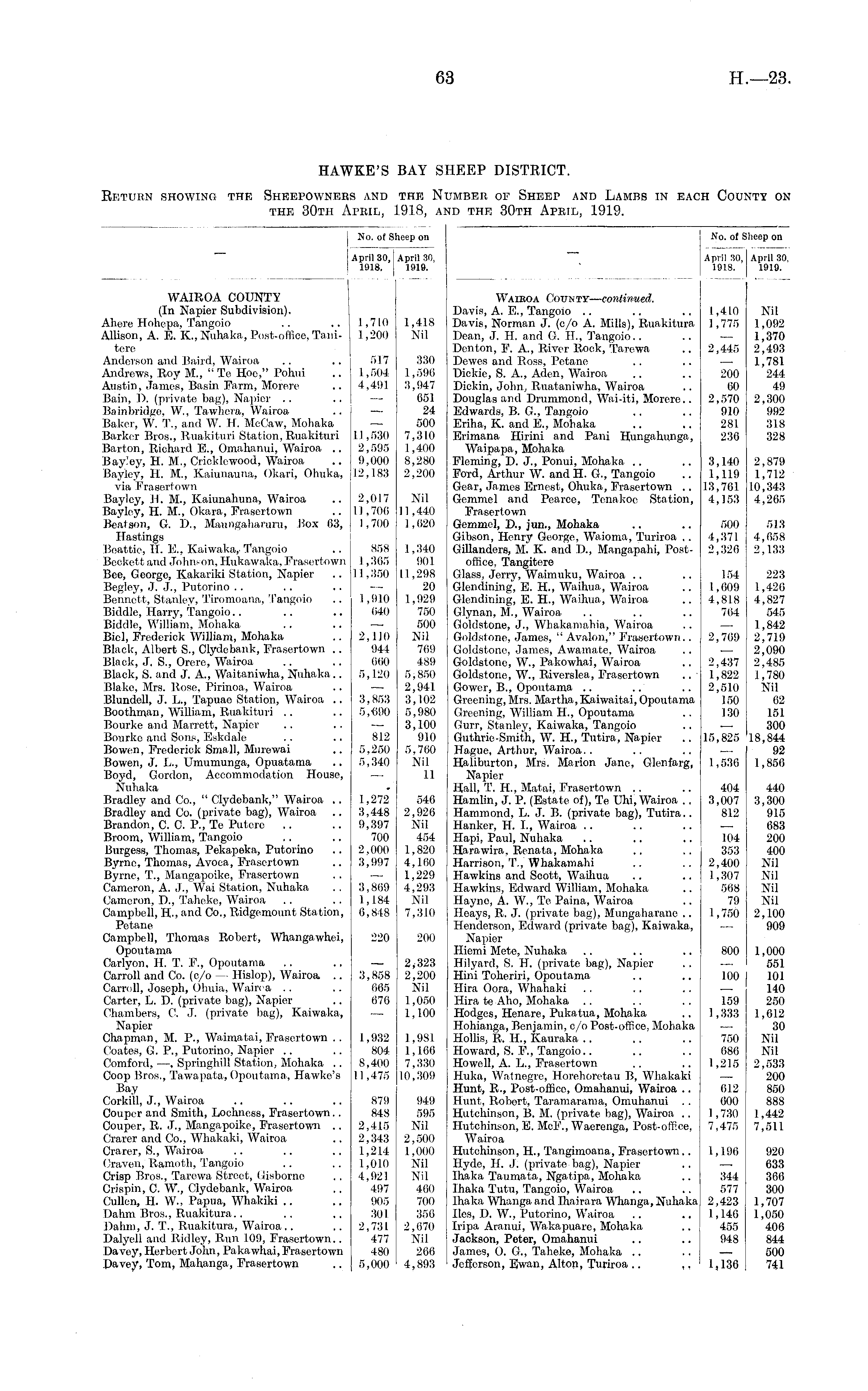 HAWKE'S BAY SHEEP DISTRICT. Return showing the Sheepowners and the Number of Sheep and Lambs in each County on the 30th April, 1918, and the 30th April, 1919.