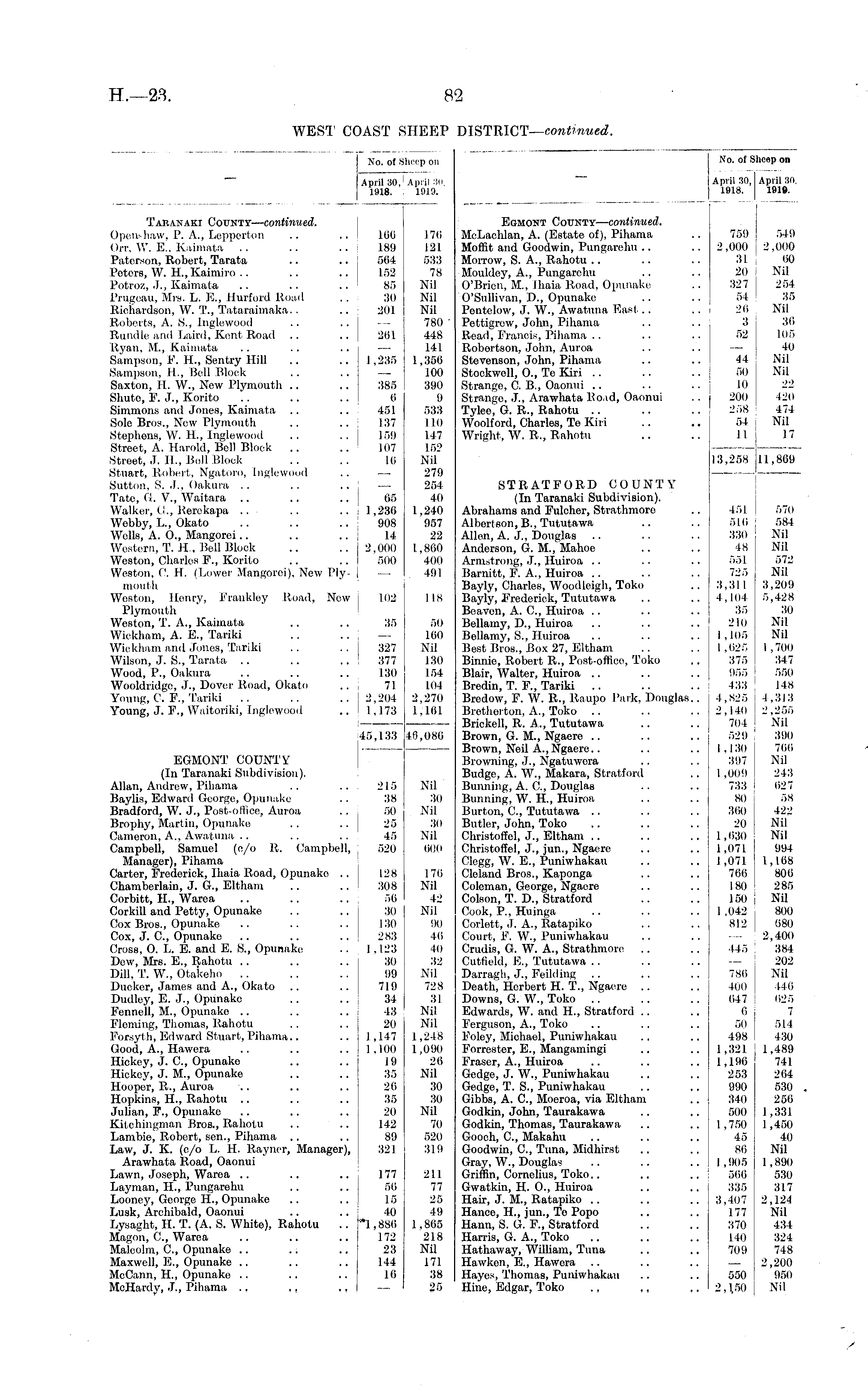 No. of S No. of 6 Iheep on April 30. . 1919. No. of SI heep on April 30, mis April 30, 1918. April 30, 1918. April 30. 1919. j 1918. Taeanaki County— continued. Opens haw, P. A., Lepperton .. .. 166 Orr, W. E„ Kaimata .. .. .. 189 Paterson, Robert, Tarata .. .. 564 Peters, W. H.Kaimiro .. .. .. 152 Potroz, J., Kaimata .. .. .. 85 Prugeau, Mrs. L. E., Hurford Road .. 30 Richardson, W. T., Tataraimaka.. .. 201 Roberts, A. S., Inglewood .. .. —. Rundle and Laird, Kent Road .. .. 261 Ryan, M., Kaimata .. .. .. — Sampson, F. H., Sentry HiU .. .. 1,235 Sampson, H., Bell Block .. .. — Saxton, II. W., New Plymouth .. .. 385 Shuto, F. J., Korito .. .. .. 6 Simmons and Jones, Kaimata .. .. 451 Sole Bros., New Plymouth .. .. 137 Stephens, W. H., Inglewood .. .. 159 Street, A. Harold, Bell Block .. .. 107 Street, J. IL, Bell Block .. .. 1.6 Stuart, Robert, Ngatoro, Inglewood .. —■ Sutton, S. J., Oakura .. .. .. — Tate, G. V., Waitara .. .. .. 65 Walker, (!., Rerekapa .. .. .. 1,236 Webby, L., Okato .. .. .. 908 Wells, A. O., Mangorei.. .. .. 14 Wostern, T. H, Bell Blook .. .. 2,000 Weston, Charles F., Korito .. .. • 500 Weston, C. H. (Lower Mangorei), New Ply- — mouth Weston, Henry, Frankley Road, Now j 102 Plymouth Weston, T. A., Kaimata .. .. 35 Wickham, A. E., Tariki .. .. — Wickham and Jones, Tariki .. .. 327 Wilson, J. S., Tarata .. .. .. 377 Wood, P., Oakura .. .. .. 130 Wooldridgo, J., Dover Road, Okato .. 71 Young, C. F., Tariki .. .. .. 2,204 Young, J. F., Waitoriki, Inglewood .. 1,173 176 J21 533 78 Nil Nil Nil 780 ' 448 141 1,356 100 390 9 533 110 1.47 152 Nil 279 254 40 1,240 957 22 1,860 400 491 Egmont County— continued. McLachlan, A. (Estate of), Pihama Moffit and Goodwin, Pungarehu Morrow, S. A., Rahotu Mouldey, A., Pungarehu O'Brien, M., Ihaia Road, Opunake O'Sullivan, D., Opunake Pentelow, J. W., Awatuna East Pettigrew, John, Pihama Read, Francis, Pihama Robertson, John, Auroa Stevenson, John, Pihama Stockwoll, 0., Te Kiri Strango, C. B., Oaonui .. Strange, J., Arawhata Road, Oaonui Tylee, G. R., Rahotu Woolford, Charles, Te Kiri Wright, W. R., Rahotu 759 2,000 31 20 327 54 26 3 52 549 2,000 60 Nil 254 35 Nil 36 105 40 Nil Nil 22 420 474 Nil 17 44 50 10 200 258 54 11 13,258 11,869 45,133 EGMONT COUNTY (In Taranaki Subdivision). Allan, Andrew, Pihama .. .. 215 Baylis, Edward George, Opunake .. 38 Bradford, W. J., Post-office, Auroa .. 50 Brophy, Martin, Opunake .. .. 25 Cameron, A., Awatuna .. .. .. 45 Campbell, Samuel (e/o It. Campbell, 520 Manager), Pihama Carter, Frederick, Ihaia Road, Opunake .. 128 Chamberlain, J. G., Eltham .. .. 308 Corbitt, H., Warea .. .. .. 56 Corkill and Petty, Opunake . . .. 30 Cox Bros., Opunake .. .. .. 130 Cox, J. C, Opunake .. .. .. 283 Cross, O. L. E. and E. S., Opunake .. I 1,123 Dew, Mrs. E., Rahotu .. .. .. 30 Dill, T. W., Otakeho .. .. .. 99 Ducker, James and A., Okato .. .. 719 Dudley, E. J., Opunake .. .. 34 Fennell, M., Opunake .. .. .. 43 Fleming, Thomas, Rahotu .. .. 20 Forsyth, Edward Stuart, Pihama.. .. 1,147 Good, A., Hawera .. .. .. 1,100 Hickey, J. G, Opunake .. .. 19 Hickey, J. M., Opunake .. .. 35 Hooper, R., Auroa .. .. .. 26 Hopkins, H., Rahotu .. .. .. 35 Julian, F., Opunake .. .. .. 20 Kitchingman Bros., Rahotu .. .. 142 Lambie, Robort, sen., Pihama .. .. 89 Law, J. K. (c/o L. H. Rayner, Manager), 321 Arawhata Road, Oaonui Lawn, Joseph, Warea .. .. .. 177 Layman, H., Pungarehu .. .. 56 Looney, George H., Opunake .. .. 15 Lusk, Archibald, Oaonui .. .. 40 Lysaght, H. T. (A. S. White), Rahotu .. _,886 Magon, C., Warea .. .. .. 172 Malcolm, G, Opunake .. .: .. 23 Maxwell, E., Opunake .. .. .. 144 McCann, H, Opunake .. .. .. 16 McHardy, J., Pihama ., ,, ., — 118 50 160 Nil 130 154 104 2,270 1,161 40,086 Nil 30 Nil 30 Nil 60(i 170 Nil 42 Nil 90 46 40 32 Nil 728 31 Nil Nil 1,248 1,090 26 Nil 30 30 Nil 70 520 319 STRATFORD COUNTY (In Taranaki Subdivision). Abrahams and Fulcher, Strathmore Albertson, B., Tututawa Allen, A. J., Douglas Anderson, G. M., Mahoe Armstrong, J., Huiroa Barnitt, F. A., Huiroa Bayly, Charles, Woodleigh, Toko Bayly, Frederick, Tututawa Beaven, A. G, Huiroa Bellamy, D., Huiroa Bellamy, S., Huiroa Best Bros., Box 27, Eltham Binnio, Robert It., Post-office, Toko Blair, Walter, Huiroa Bredin, T. P., Tariki Bredow, F. W. It., Raupo Park, Douglas.. Bretherton, A., Toko Brickell, R. A., Tututawa Brown, G. M., Ngaere Brown, Neil A., Ngaere.. Browning, J., Ngatuwera Budge, A. W., Makara, Stratford Bunning, A. G, Douglas Bunning, W. H, Huiroa Burton, G, Tututawa Butler, John, Toko Christoffel, J., Eltham Christoffel, J., jun., Ngaere Clegg, W. E., Puniwhakau Clcland Bros., Kaponga Coleman, George, Ngaere Colson, T. D., Stratford Cook, P., Huinga Corlett, J. A., Ratapiko Court, F. W., Puniwhakau Orudis, G. W. A., Strathmore Cutfield, E., Tututawa Darragh, J., Feilding Death, Herbert H. T., Ngaere Downs, G. W., Toko Edwards, W. and H., Stratford Ferguson, A., Toko Foley, Michael, Puniwhakau Forrester, E., Mangamingi Fraser, A., Huiroa Gedge, J. W., Puniwhakau Gedge, T. S., Puniwhakau Gibbs, A. C, Moeroa, via Eltham Godkin, John, Taurakawa Godkin, Thomas, Taurakawa Gooch, G, Makahu Goodwin, G, Tuna, Midhirst Gray, W., Douglas Griffin, Cornelius, Toko.. Gwatkin, H. 0., Huiroa Hair, J. M., Ratapiko Hance, H, jun., Te Popo Hann, S. G. P., Stratford Harris, G. A., Toko Hathaway, William, Tuna Hawken, E., Hawera Hayes, Thomas, Puniwhakau Hine, Edgar, Toko ., ,, ,, 451 510 330 48 551 725 3,311 4,104 35 210 1,105 1.025 375 955 433 4,825 2,140 704 529 I , 130 397 1 ,009 733 80 360 20 1,630 : 1,071 ! 1,071 j 766 180 150 1 ,042 812 570 584 Nil Nil 572 Nil 3,209 5,428 30 Nil Nil 1,700 347 550 148 4,313 2,255 Nil 390 766 Nil 243 627 58 422 Nil Nil 994 1,168 806 285 Nil 800 080 2,400 384 202 Nil 440 625 7 514 430 1,489 741 264 530 256 1,331 1,450 40 Nil 1,890 530 317 2,124 Nil 434 324 748 2,200 950 Nil 445 786 100 647 6 50 498 1,321 | 1,196 253 990 340 500 1,750 45 86 1,905 566 335 3,407 177 370 140 709 211 77 25 49