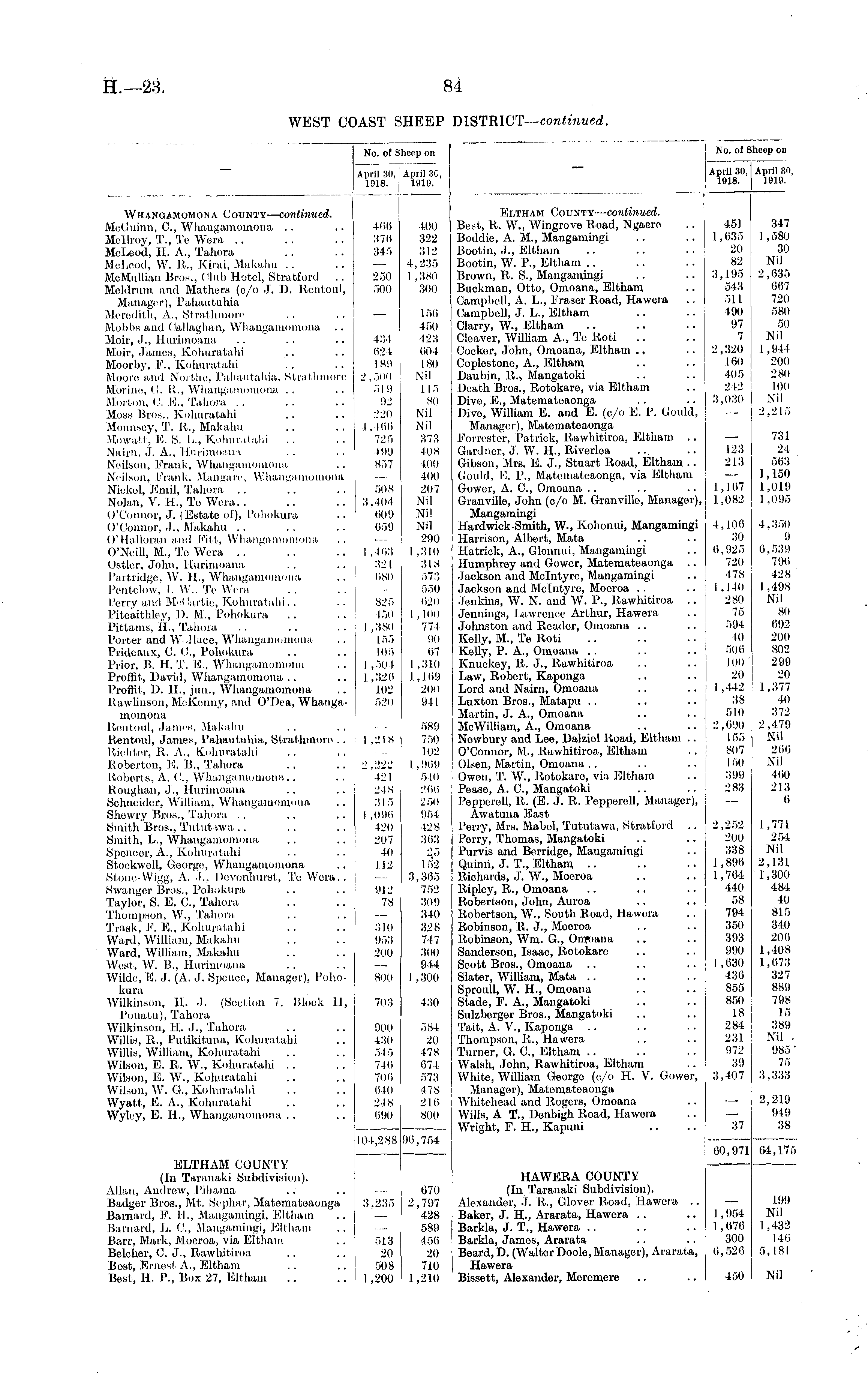 No. of S April 3(1, 1918. | Iheep on April 3C, 1919. No. of Sheep on April 30, April 3d, 1918. 1919. Whangamomona County— continued. MoGuinn, C, Whangamomona .. Mcllroy, T., Te Wera McLeod, H. A., Tahora MoLeod, W. It., Kirai, Makahu McMulliau Bros., Club Hotel, Stratford Meldrum and Mathers (c/o J. D. Rentoul, Manager), Pahautuhia Meredith, A., Strathmore Mobbs and Callaghan, Whangamomona .. Moir, J., Hurimoana Moir, James, Kohuratahi Moorby, P., Kohuratahi Moore and Northe, Pahautahia, Strathmore Murine, G. R., Whangamomona Morton, C. E., Tahora .. Moss Bros., Kohuratahi Mounsoy, T. It., Makahu Mowatt, E. S. 1.., Kohuratahi Nairn, J. A., Hurimoan i Neilson, Frank, Whangamomona Neilson, Prank, Manga re. Wlianganiomona Nickel, Emil, Tahora Nolan, V. H., Te Wera.. O'Connor, J. (Estato of), Pohokura O'Connor, J., Makahu .. O'Halloran and Pitt, VVIianganioniona O'Neill, M., Te Wera Ostler, John, Hurimoana Partridge, W. H., Whangamomona Pcntclow, I. W., Te Wera Perry and McCartie, Kohuratahi. . Pitcaithley, D. M., Pohokura Pittams, II., Tahora Porter and Wallace, Whangamomona Pridoaux, C. C, Pohokura Prior, B. H. T. E., Whangamomona Proffit, David, Whangamomona Proftif, D. IL, jun., Whangamomona Rawlinson, Me Kenny, and O'Dea, Whangamomona Rentoul, James, Makahu Rentoul, James, Pahautuhia, Strathmore .. 1 .it-liter. It. A., Kohuratahi Roborton, E. B., Tahora Roberts, A. G. Whangamomona,. Roughan, J., Hurimoana Schneider, William, Whangamomona Shewry Bros., Tahora Smith Bros., Tututawa Smith, L., Whangamomona Sponccr, A., Kohuratahi Stockwcll, George, Whangamomona Stone-Wigg, A. J., Dcvonhurst, Te Wera.. Swanger Bros., Pohokura Taylor, S. E. C, Tahora Thompson, W., Tahora Trask, F. E., Kohuratahi Ward, William, Makahu Ward, William, Makahu West, W. B., Hurimoana Wildo, E. J. (A. J. Spence, Manager), Pohokura Wilkinson, H. J. (Section 7, Block II, Pouatu), Tahora Wilkinson, H. J., Tahora Willis, It., Putikituna, Kohuratahi Willis, William, Kohuratahi Wilson, E. R. W., Kohuratahi Wilson, E. W., Kohuratahi Wilson, W. G., Kohuratahi Wyatt, E. A., Kohuratahi Wyley, E. IL, Whangamomona 466 370 345 250 500 431 621 18!) 2,500 519 92 -.'20 I, 100 725 199 857 508 3,101 609 659 I ,103 321 080 825 150 1,380 155 105 1,504 1,320 102 520 400 322 312 4,235 I , 380 300 156 450 423 004 180 Nil 115 80 Nil Nil 373 ■108 400 400 207 Nil Nil Nil 290 1,210 318 573 550 620 I .10(1 774 90 07 I ,310 I . I 0!) 200 941 Eltham County— continued. Best, It. W., Wingrove Road, Ngaere Boddie, A. M., Mangamingi Bootin, J., Eltham Bootin, W. P., Eltham Brown, It. S., Mangamingi Buckman, Otto, Omoana, Eltham Campbell, A. L., Fraser Road, Hawera Campbell, J. L., Eltham Clarry, W., Eltham Cleaver, William A., Te Roti Cocker, John, Omoana, Eltham Coplestone, A., Eltham Daubin, It., Mangatoki Death Bros., Rotokaro, via Eltham Dive, E., Matematoaonga Dive, William E. and E. (c/o E. P. Gould, Managei). Matemateaonga Forrester, Patrick, Rawhitiroa, Eltham .. Gardner, J. W. H-, Riverlea Gibson, Mrs. E. J., Stuart Road, Eltham .. Gould, E. P., Matemateaonga, via Eltham Gower, A. G, Omoana Granville, John (c/o M. Granville, Manager), Mangamingi Hardwick-Smith, W., Kohonui, Mangamingi Harrison, Albert, Mata Hatriek, A., Glennui, Mangamingi Humphrey and Gower, Matemateaonga .. Jackson and Mclntyre, Mangamingi Jackson and Mclntyre, Moeroa Jenkins, W. N. and W. P., Rawhitiroa .. Jennings, Lawrence Arthur, Hawera Johnston and Reader, Omoana Kelly, M., Te Roti KeUy, P. A., Omoana Knuckoy, It. J., Rawhitiroa Law, Itobert, Kaponga Lord and Nairn, Omoana Luxton Bros., Matapu Martin, J. A., Omoana McWilliam, A., Omoana Nowbury and Lee, Dalziel Road, Eltham .. O'Connor, M., Rawhitiroa, Eltliam Olson, Martin, Omoana Owen, T. W., Rotokaro, via Eltham Pease, A. G, Mangatoki Popperell, R. (E. J. It. Popperell, Manager), Awatuna East Perry, Mrs. Mabel, Tututawa, Stratford .. Perry, Thomas, Mangatoki Purvis and Bcrridge, Mangamingi Quinii, J- T., Eltham Richards, J. W., Moeroa Ripley, R., Omoana Robertson, John, Auroa Robertson, W., South Road, Hawora Robinson, It. J., Moeroa Robinson, Win. G., Onroana Sanderson, Isaac, Rotokaro Scott Bros., Omoana Slater, WiUiam, Mata Sproull, W. H., Omoana Stade, P. A., Mangatoki Sulzberger Bros., Mangatoki Tait, A. V., Kaponga Thompson, R., Hawera Turner, G. C, Eltham Walsh, John, Rawhitiroa, Eltham White, WilUam George (e/o II. V. Gower, Manager), Matemateaonga Whitehead and Rogers, Omoana Wills, A T., Denbigh Road, Hawera Wright, F. H., Kapuni 451 1,035 20 82 3,195 543 511 490 97 7 2,320 160 105 2 12 3,030 123 213 1,107 I ,082 4,100 30 6,925 720 478 I .1 10 280 75 .',!) I 10 506 100 20 I ,112 38 510 2,090 I 55 807 150 399 283 347 I ,580 30 Nil 2,035 667 720 580 50 Nil 1,944 200 280 100 Nil 2,215 731 24 563 1,150 1 ,019 1,095 4,350 9 6,539 796 428 I ,498 Nil 80 692 200 802 299 20 1,377 40 372 2,479 Nil 266 Nil 460 213 6 1.218 2 ,222 ""•121 248 31 5 I ,096 420 207 40 112 589 750 102 I .969 510 266 250 954 428 303 25 152 3,365 752 309 340 328 747 300 944 I ,300 2 ,252 200 338 I ,896 1,764 440 58 794 350 393 990 I ,630 430 855 850 18 284 231 972 39 3,407 1,771 254 Nil 2,131, 1,300 484 40 815 340 200 1,408 1,073 327 889 798 15 389 Nil • 985' 75 3,333 9) 2 78 310 953 200 800 703 430 900 430 545 716 706 640 248 690 584 20 478 674 573 478 216 800 37 2,219 949 38 104,288 90,754 60,971 64,175 ELTHAM COUNTY (in Taranaki Subdivision). Allan, Andrew, Pihama Badger Bros., Mt. Scphar, Matemateaonga Barnard, F. 11., Mangamingi, Eltham Barnard, L. G, Mangamingi, Eltham Barr, Mark, Moeroa, via Eltham Belcher, C. J., Rawhitiroa Bost, Ernest A., Eltham Best, H. P., Box 27, Eltham 3.235 670 2,797 428 589 450 20 710 1 ,210 HAWERA COUNTY (In Taranaki Subdivision). Alexander, J. R., Glover Road, Hawora .. Baker, J. H., Ararata, Hawera Barkla, J. T., Hawera Barkla, James, Ararata Beard, D. (Walter Doole, Manager), Ararata, Hawera Bissett, Alexander, Meremere 1 ,954 J, 076 300 6,526 199 Nil 1,432 140 5,181. 513 20 508 1,200 450 Nil