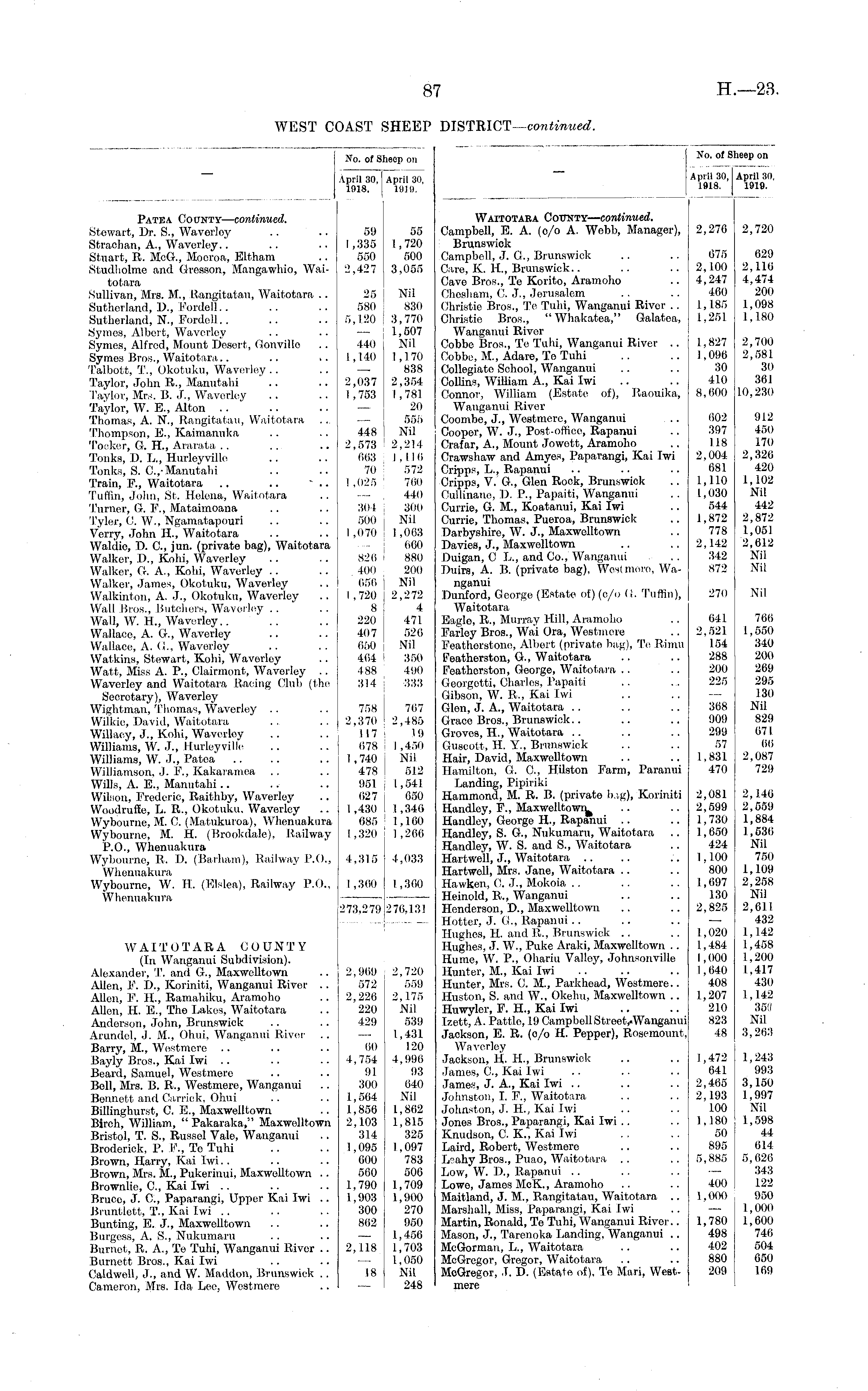 No. of SI April 30, 1918. beep on April 30, 1919. No. of SI A prll 30, 1918. leep on April 30, 1919. Patea Coonty— continued. Stewart, Dr. S., Waverley Strachan, A., Waverley.. Stuart, R. MeG., Moeroa, Eltham Studholme and Gresson, Mangawhio, Waitotara Sullivan, Mrs. M., Rangitatau, Waitotara .. Sutherland, D., Fordell.. Sutherland, N., Fordell. . Symes, Albert, Waverley Symes, Alfrod, Mount Desert, Gonvillo Symes Bros., Waitotara.. Talbott, T., Okotuku, Waverley Taylor, John R., Manutahi Taylor, Mrs. B. J., Wavorley Taylor, W. E., Alton Thomas, A. N., Rangitatau, Waitotara Thompson, E., Kaimanuka Toeker, G. H., Ararata Tonks, D. L., Hurleyville Tonks, S. G,-Manutahi Train, F., Waitotara .. .. ~ .. Tuffin, John, St. Helena, Waitotara Turner, G. P., Mataimoana Tyler, C. W., Ngamatapouri Verry, John H., Waitotara Waldio, D. C, jun. (private bag), Waitotara Walker, D., Kohi, Waverley Walker, G. A., Kohi, Waverley Walker, James, Okotuku, Waverley Walkinton, A. J., Okotuku, Waverley Wall Bros., Butchers, Waverley Wall, W. H., Waverley Wallace, A. G., Waverley Wallace, A. G., Waverloy Watkins, Stewart, Kohi, Waverley Watt, Miss A. P., Clairmont, Waverley .. Waverley and Waitotara Racing Club (the Seerotary), Waverley Wightman, Thomas, Waverley Wilkin, David, Waitotara Willacy, J., Kohi, Waverloy Williams, W. J., Hurleyville Williams, W. J., Patea Williamson, J. P., Kakaramea WiUs, A. E., Manutahi Wilson, Frederic, Raithby, Waverley Woodruffe, L. R., Okotuku, Waverley Wybourne, M. C. (Matukuroa), Whenuakura Wybourne, M. H. (Brookdale), Railway P.O., Whenuakura Wybourno, It. D. (Barham), Railway P.O., Whenuakura Wybourne, W. H. (Elslea), Railway P.O., Whenuakura 59 1,335 550 2,427 55 1,720 500 3,055 Waitotaea County— continued. CampbeU, E. A. (o/o A. Webb, Manager), Brunswiok CampbeU, J. G., Brunswick Caro, K. H., Brunswick.. Cave Bros., Te Korito, Aramoho Chcsham, G J., Jerusalem Christie Bros., Te Tuhi, Wanganui Rivor .. Christie Bros., " Whakatea," Galatea, Wanganui River Cobbe Bros., To Tuhi, Wanganui River .. Cobbe, M., Adare, Te Tuhi Collegiato School, Wanganui ColUns, William A., Kai Iwi Connor, William (Estate of), Raouika, Wanganui River Coombe, J., Westmere, Wanganui Cooper, W. J., Post-office, Rapanui Crafar, A., Mount Jowott, Aramoho Crawshaw and Amyes, Paparangi, Kai Iwi Cripps, L., Rapanui Cripps, V. G., Glen Rock, Brunswick Cullinane, I). P., Papaiti, Wanganui Currie, G. M., Koatanui, Kai Iwi Currie, Thomas. Pueroa, Brunswiok Darbyshire, W. J., Maxwelltown Davies, J., Maxwelltown Duigan, C L., and Co., Wanganui Duirs, A. B. (private bag), Westmere, Wanganui Dunford, George (Estate ot) (c/o G. Tuffin), Waitotara Eaglo, R., Murray Hill, Aramoho Farloy Bros., Wai Ora, Westmere Feathorstone, Albert (private bag), Te Rimu Featherston, G., Waitotara Eeatherston, George, Waitotara Georgotti, Charles, Papaiti Gibson, W. R., Kai Iwi Glen, J. A., Waitotara Grace Bros., Brunswick.. Groves, H., Waitotara Guscott, H. Y., Brunswick Hair, David, MaxweUtown Hamilton, G. G, Hilston Farm, Paranui Landing, Pipiriki Hammond, M. R. B. (private bag), Koriniti Handley, F., Maxwelltowi^ Handley, George H., Rapanui Handley, S. G., Nukumaru, Waitotara Handley, W. S. and S., Waitotara Hartwo'll, J., Waitotara .. Hartwell, Mrs. Jane, Waitotara Hawken, 0. J., Mokoia Heinold, R., Wanganui Henderson, D., Maxwelltown Hotter, J. G, Rapanui Hughes, II. and It., Brunswick Hughes, J. W., Puke Araki, Maxwelltown .. Hume, W. P., Ohariu Valloy, Johnsonville Hunter, M., Kai Iwi Hunter, Mrs. 0. M., Parkhead, Westmere.. Huston, S. and W., Okehu, Maxwelltown .. Huwyler, F. H., Kai Iwi Izett, A. Pattle, 19 CampbeU Street, Wanganui Jackson, E. R. (o/o H. Pepper), Rosemount, Waverley Jackson, 11. H., Brunswick James, G, Kai Iwi James, J. A., Kai Iwi Johnston, I. F, Waitotara Johnston, J. H, Kai Iwi Jones Bros., Paparangi, Kai Iwi Knudson, C. K., Kai Iwi Laird, Robert, Wostmere L?ahy Bros., Puao, Waitotara Low, W. D., Rapanui Lowe, James McK., Aramoho Maitland, J. M., Rangitatau, Waitotara .. Marshall, Miss, Paparangi, Kai Iwi Martin, Ronald, Te Tuhi, Wanganui River.. Mason, J., Tarenoka Landing, Wanganui .. McGorman, L., Waitotara McGregor, Gregor, Waitotara MoGregor, J. D. (Estate of), Te Mari, Westmere 2,270 675 2,100 4,247 460 1,1.85 1,251 2,720 629 2,116 4,474 200 1,098 1,180 25 580 5,120 Nil 830 3,770 1,507 Nil 1,170 838 2,354 1,781 20 555 Nil 2,214 1,116 572 760 440 300 Nil 1,063 660 880 200 Nil 2,272 4 471 526 Nil 350 490 333 440 1,140 1,827 1,090 30 410 8,600 2,700 2,581 30 361 10,230 2,037 1,753 448 2,573 663 70 1 ,025 602 397 118 2,004 681 1,110 1,030 544 1,872 778 2,142 342 872 912 450 170 2,326 420 1,102 Nil 442 2,872 1,051 2,612 Nil Nil 304 500 1,070 826 400 656 I , 720 8 220 407 650 464 488 314 270 641 2,521 154 288 200 225 Nil 766 1,550 340 200 269 295 130 Nil 829 671 66 2,087 729 758 2,370 117 678 1,740 478 951 027 1,430 685 1,320 767 ' 2,485 19 1,450 Nil 512 : 1,541 650 1,346 1,160 1,266 368 909 299 57 1,831 470 4,315 4,033 2,081 2,599 1,730 1,650 424 1,100 800 1,097 130 2,825 2,146 2,559 1,884 1,536 Nil 750 1,109 2,258 Nil 2,611 432 1,142 1,458 1,200 1,417 430 1,142 35(1 Nil 3,263 1,300 1,360 273,279 276,131 WAITOTARA COUNTY (In Wanganui Subdivision). Alexander, T. and G., Maxwelltown Allen, F. D., Koriniti, Wanganui River .. Allen, F. IL, Ramahiku, Aramoho Allen, IL E., The Lakes, Waitotara Anderson, John, Brunswick Arundel, J. M., Ohui, Wanganui River Barry, M., Wostmere Bayly Bros., Kai Iwi Beard, Samuel, Westmere Boll, Mrs. B. It., Westmere, Wanganui Bonnett and Carriek. Ohui Billinghurst, C. E., Maxwelltown Birch, William, " Pakaraka," Maxwelltown Bristol, T. S., Russel Vale, Wanganui Broderick, P. F., Te Tuhi Brown, Harry, Kai Iwi Brown, Mrs. M., Pukerinui, Maxwelltown .. Brownlie, G, Kai Iwi Bruce, J. G, Paparangi, Upper Kai Iwi .. Bruntlett, T., Kai Iwi .. Bunting, E. J., Maxwelltown Burgess, A. S., Nukumaru Burnet, R. A., Te Tuhi, Wanganui River .. Burnett Bros., Kai Iwi Caldwell, J., and W. Mad