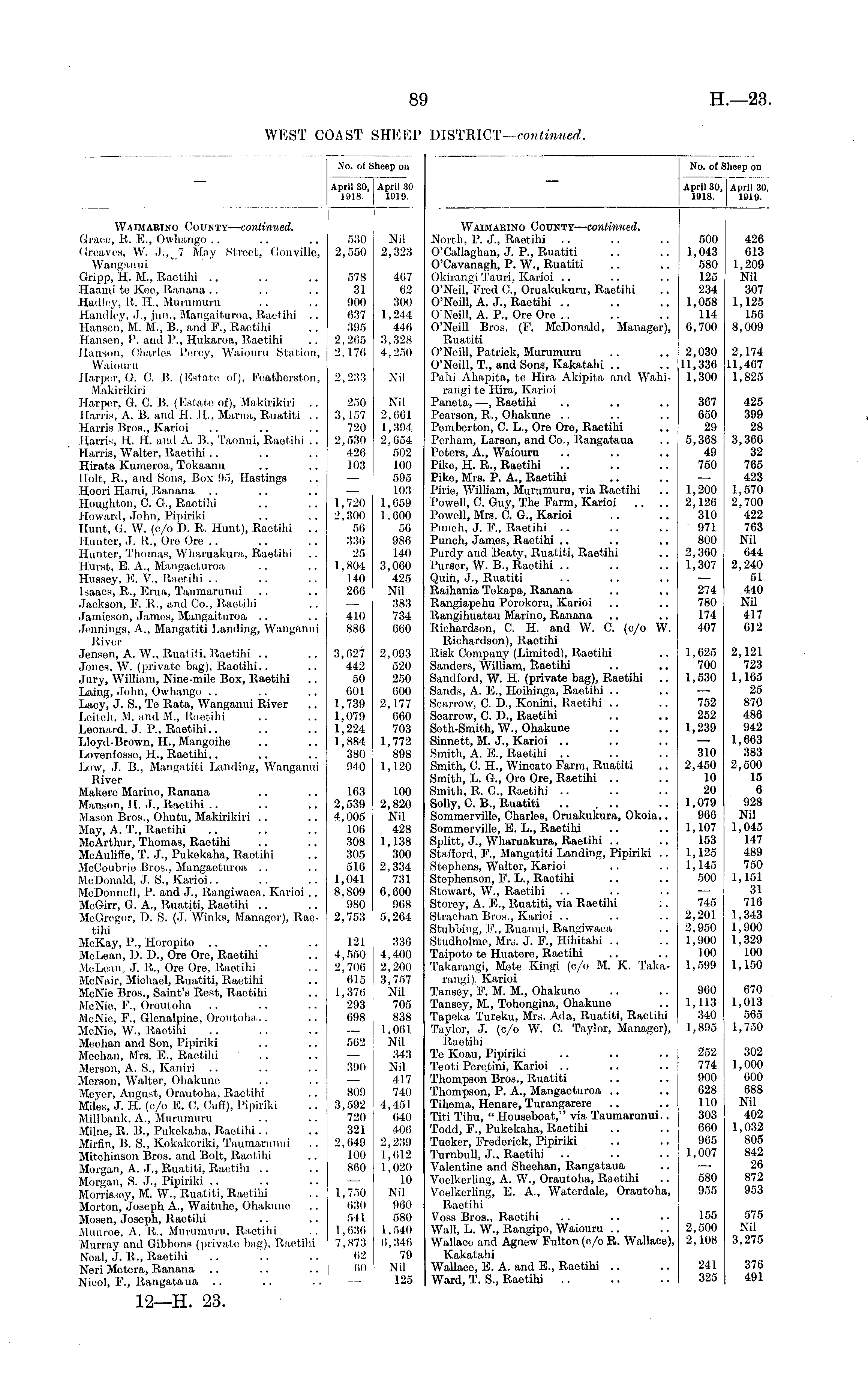 No. of Sheep on April 30, April 30 1918 1019. No. of Sheep on April 30, April 30, 1918. 1919. Waimaeino County— continued. Grace, It. E., Owhango Greaves, W. >L,1 May Street, Gonvillc, Wanganui Gripp, H. M., Raotihi Haami to Kee, Ranana Hadley, It. H., Murumuru Handley, J., jun., Mangaituroa, Raetihi Hansen, M. M., B., and F., Raetihi Hansen, P. and P., Hukaroa, Itaetihi Hanson, Charles Percy, Waiouru Station, Waiouru Harper, G. C. B. (Estate of), Featherston, Makirikiri Harper, G. C. B. (Estate of), Makirikiri .. Harris, A. B. and H. IL, Mania, Ruatiti .. Harris Bros., Karioi Harris, H. H. and A. B., Taonui, Raetihi .. Harris, Walter, Raetihi .. Hirata Kumeroa, Tokaanu Holt, It., and Sons, Box 95, Hastings Hoori Hami, Ranana Houghton, C. G., Raetihi Howard, John, Pipiriki Hunt, G. W. (e/o D. R. Hunt), Raetihi .. Hunter, J. It., Ore Ore Hunter, 'Thomas, Wharuakura, Raetihi Hurst, E. A., Mangaeturoa Hussey, E. V., Raetihi Isaacs, R., Erua, Taumarunui Jackson, F. It., and Co., Raetihi Jamieson, James, Mangaituroa Jennings, A., Mangatiti Landing, Wanganui River 530 2,550 578 31 900 037 395 2,205 2,176 2,233 250 3,157 720 2,530 420 103 Nil 2,323 467 62 300 1,244 446 3,328 4,250 Nil Nil 2,661 1,394 2,054 502 100 595 103 1,059 1,000 50 986 140 3,000 425 Nil 383 734 060 Waimaeino County— continued. North, P. J., Raetihi .. O'Callaghan, J. P., Ruatiti O'Cavanagh, P. W., Ruatiti Okirangi Tauri, Karioi. O'Neil, Fred G, Oruakukuru, Raetihi O'Neill, A. J., Raetihi O'Neill, A. P., Ore Oro .. O'Neill Bros. (F. McDonald, Manager), Ruatiti O'Neill, Patrick, Murumuru O'Neill, T., and Sons, Kakatahi Pahi Ahapita, te Hira Akipita and Wahirangi te Hira, Karioi Panota, —, Raetihi Pearson, R., Ohakuno Pemberton, C. L., Ore Ore, Raetihi Pcrham, Larsen, and Co., Rangataua Peters, A., Waiouru Pike, H. R., Raetihi Pike, Mrs. P. A., Raetihi Pirie, WiUiam, Mummuru, via Raetihi Powell, C. Guy, Tho Farm, Karioi .. Powell, Mrs. G G., Karioi Punch, J. P., Raetihi Punch, James, Raetihi Purely and Beatv, Ruatiti, Raetihi Purser, W. B., Raetihi Quih, J., Ruatiti Raihania Tokapa, Ranana Rangiapehu Porokoru, Karioi Rangihuatau Marino, Ranana Richardson, C. H. and W. G (c/o W. Richardson), Itaetihi Risk Company (Limited), Raotihi Sanders, William, Raetihi Sandford, W. IL (private bag), Raetihi Sands, A. E., Hoihinga, Raetihi Scarrow, G D., Konini, Itaetihi Scarrow, C. D., Raotihi Seth-Smith, W., Ohakune Sinnett, M. J., Karioi Smith, A. E., Raetihi Smith, C. IL, Wincato Farm, Ruatiti Smith, L. G., Ore Ore, Raetihi Smith, R. G, Raetihi Solly, C. B., Ruatiti .. ... Sommerville, Charles, Oruakukura, Okoia.. Sommerville, E. L., Itaetihi SpUtt, J., Wharuakura, Raetihi Stafford, F., Mangatiti Landing, Pipiriki .. Stophens, Walter, Karioi Stephenson, F. L., Raetihi Stewart, W., Raetihi Storey, A. E., Ruatiti, via Raotihi ;. Strachan Bros., Karioi Stubbing, P., Ruanui, Rangiwaea Studholme, Mrs. J. P., Hihitahi Taipoto te Huatere, Itaetihi Takarangi, Mete Kingi (c/o M. K. Takarangi), Karioi Tansey, F. M. M., Ohakune Tansey, M., Tohongina, Ohakune Tapeka Tureku, Mrs. Ada, Ruatiti, Raetihi Taylor, J. (c/o W. C. Taylor, Manager), Raetihi Te Koau, Pipiriki Teoti Pere.tini, Karioi Thompson Bros., Ruatiti Thompson, P. A., Mangaeturoa Tihema, Henare, Turangarcro Titi Tihu, " Houseboat," via Taumarunui.. Todd, F., Pukekaha, Raotihi Tucker, Frcdorick, Pipiriki Turnbull, J., Raetihi Valentine and Sheehan, Rangataua Voelkcrling, A. W., Orautoha, Raetihi Voclkerling, E. A., Waterdale, Orautoha, Raetihi Voss Bros., Raetihi Wall, L. W., Rangipo, Waiouru Wallace and Agnew Fulton (c/o R. Wallace), Kakatahi WaUace, E. A. and E., Raetihi Ward, T. S., Raetihi 500 1,043 580 125 234 1,058 114 0,700 2,030 11,330 1,300 367 650 29 5,308 49 750 426 613 1,209 Nil 307 1,125 150 8,009 2,174 11,407 1,825 425 399 28 3,300 32 705 423 1,570 2,700 422 703 Nil 044 2,240 51 440 Nil 417 612 1,720 2,300 56 336 25 1,804 140 266 1,200 2,126 310 971 800 2,300 1,307 410 886 274 780 174 407 Jensen, A. W., Ruatiti, Itaetihi Jones, W. (privato bag), Raotihi.. Jury, WiUiam, Nine-mile Box, Raetihi Laing, John, Owhango Lacy, J. S., Te Rata, Wanganui Rivor Leiteh. M. and M., Raetihi Leonard, J. P., Raetihi.. Lloyd-Brown, H., Mangoihe Lovenfosse, H., Raotihi.. Low, J. B., Mangatiti Landing, Wanganui River Makere Marino, Ranana Manson, H. J., Raetihi Mason Bros., Ohutu, Makirikiri May, A. T., Raotihi McArthur, Thomas, Raetihi MoAuliffe, T. J., Pukekaha, Raotihi McCoubrio Bros., Mangaeturoa McDonald, J. S., Karioi.. McDonnell, P. and J., Rangiwaea, Karioi .. McGirr, G. A., Ruatiti, Raetihi McGregor, D. S. (J. Winks, Manager), Raetihi McKay, P., Horopito McLean, D. D., Ore Ore, Raetihi McLean, J. it., Ore Ore, Raotihi McNn.ir, Michael, Ruatiti, Itaetihi McNie Bros., Saint's Rest, Raotihi McNie, P., Oroutoha McNie, F., Glenalpine, Oroutoha.. McNie, W., Raetihi Meehan and Son, Pipiriki Meehan, Mrs. E., Raetihi Merson, A. S., Kaniri Merson, Walter, Ohakuno Moyer, August, Orautoha, Raetihi Miles, J. IL (c/o E. 0. Cuff), Pipiriki Millbank, A., Murumuru Milne, R. B., Pukekaha, Raetihi Mirfin, B. S., Kokakoriki, Taumarunui Mitchinson Bros, and Boit, Raetihi Morgan, A. J., Ruatiti, Raetihi Morgan, S. J., Pipiriki Morrisscy, M. W., Ruatiti, Raetihi Morton, Joseph A., Waituho, Ohakune Mosen, Joseph, Raotihi Munroe, A. R., Murumuru, Raetihi Murray and Gibbons (private bag), Raetihi Neal, J. It., Raetihi Neri Metera, Ranana Nicol, F., Rangataua .. 3,627 442 50 001 1,739 1,079 1,224 1,884 380 940 2,093 520 250 000 2,177 660 703 1,772 898 1,120 1,625 700 1,530 2,121 723 1,105 25 870 480 942 1,063 383 2,500 15 0 928 Nil 1,045 147 489 750 1,151 31 716 1,343 1,900 1,329 100 1,150 752 252 1,239 103 2,539 4,005 100 308 305 510 1,041 8,809 980 2,753 100 2,820 Nil 428 1,138 300 2,334 731 6,000 908 5,264 310 2,450 10 20 1,079 900 1,107 153 1,125 1,145 500 121 4,550 2,706 615 1,370 293 698 336 4,400 2,200 3,757 Nil 705 838 1,001 Nil 343 Nil 417 740 4,451 640 400 2,239 1,012 1,020 10 Nil 900 580 1,540 0