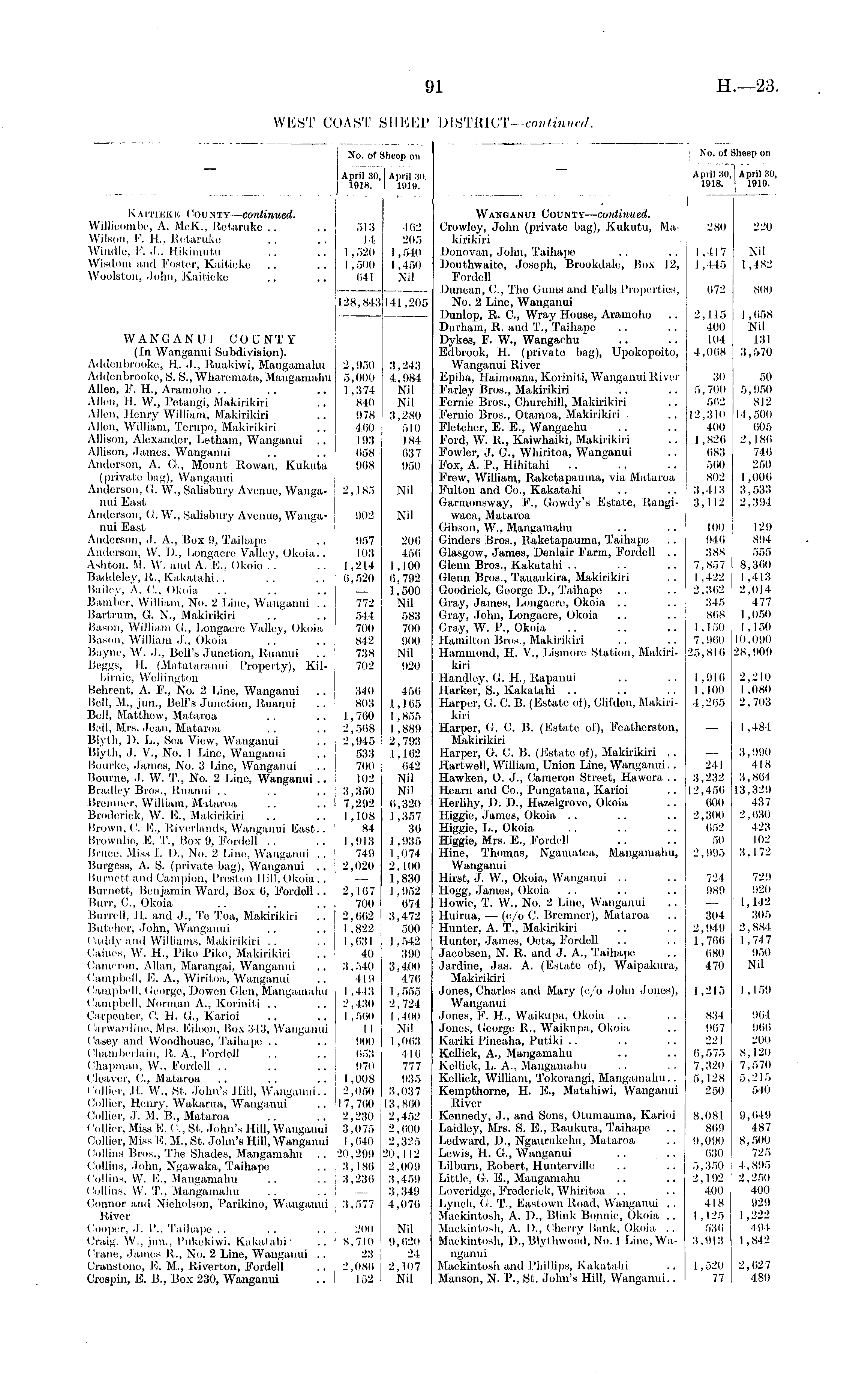 No. of Sheep on April 30,1 April 80. 1918. | 1919. No. of Sheep on April 39, April 30, 1918. 1919. K A mint H Oou NT Y— continued. Willieombc, A. McK., Rctaruke .. .. 513 162 Wilson, F. H, Retaruke .. .. It 205 Windlo, I 1 '. J., Hikiiiiiitu ,,, .. 1,520 1,540 Wisdom and Foster, Kaitieke .. .. 1,500 1,450 Woolston, John, Kaitieke .. .. 641 Nil Wanganui County— continued. Crowley, John (privato bag), Kukutu, Makirikiri Donovan, John, Taihape Douthwaito, Josoph, Brookdale, Box 12, Fordell Duncan, 0., The Gums and Falls Properties, No. 2 Line, Wanganui Dunlop, It. G, Wray House, Aramoho Durham, It. and T., Taihape Dykes, F. W., Wangaehu Edbrook, H. (privato bag), Upokojioito, Wanganui Rivor Epiha, Haimoana, Koriniti, Wanganui River Farley Bros., Makirikiri Fernie Bros., Churchill, Makirikiri Pernio Bros., Otamoa, Makirikiri Fletcher, E. E., Wangaehu Ford, W. It., Kaiwhaiki, Makirikiri Fowler, J. G., Whiritoa, Wanganui Fox, A. P., Hihitahi .. Frew, William, Raketapauma, via Mataroa Pulton and Co., Kakatahi Garmonsway, F., Gowdy's Estate, Rangiwaea, Mataroa Gibson, W., Mangamahu Ginders Bros., Raketapauma, Taihape Glasgow, Jamos, Denlair Farm, Fordell .. Glenn Bros., Kakatahi Glenn Bros., Tauaukira, Makirikiri Goodriok, George I)., Taihape Gray, James, Longacre, Okoia Gray, John, Longacre, Okoia Gray, W. P., Okoia Hamilton Bros.. Makirikiri Hammond, H. V., Lismore Station, Makirikiri Handley, G. H., Rapanui Harker, S., Kakatahi Harper, G. C. B. (Estate of), Clifden, .Makirikiri Harper, G. C. B. (Estate of), Featherston, Makirikiri Harper, G. C. B. (Estate of), Makirikiri .. Hartwell, William, Union Line, Wanganui.. Hawken, O. J., Cameron Street, Hawera .. Hearn and Co., Pungataua, Karioi Herlihy, D. D., Hazelgrove, Okoia Higgie, James, Okoia Higgie, L., Okoia Higgie, Mrs. E., Fordell Hine, Thomas, Ngamatea, Mangamahu, Wanganui Hirst, J. W., Okoia, Wanganui Hogg, Jamos, Okoia Howie, T. W., No. 2 Line, Wanganui Huirua, — (e/o 0. Bremner), Mataroa Hunter, A. T., Makirikiri Hunter, James, Oeta, Fordell Jaeobsen, N. It. and J. A., Taihape Jardine, Jas. A. (Estate of), Waipukura, Makirikiri J ones, Charles and Mary (c/o John Jones), Wanganui Jones, F. H., Waikupa, Okoia Jones, George R., Waikupa, Okoia Kariki Pineaha, Putiki Kelliek, A., Mangamahu Kelliek, L. A., Mangamahu Kelliek, William, Tokorangi, Mangamahu. . Kempthorne, H. E., Matahiwi, Wanganui River Kennedy, J., and Sons, Otumauma, Karioi Laidley, Mrs. S. E., Raukura, Taihape Ledward, I)., Ngaurukchu, Mataroa Lewis, H. G., Wanganui .. .. Lilburn, Robert, Hunterville Little, G. E., Mangamahu Loveridge, Frederick, Whiritoa Lynch, G. T., Eastown Road, Wanganui .. Mackintosh, A. I)., Blink Bonnie, Okoia .. Mackintosh, A. I)., Cherry Bank, Okoia .. Mackintosh, D., Blythwond, No. 1 Line, Wanganui Mackintosh and Phillips, Kakatahi Manson, N. P., St. John's Hill, Wanganui.. 2,80 220 1,117 Nil 1,445 1,482 128,843141,205 672 800 WANGANUI COUNTY (In Wanganui Subdivision). Addenbrooke, H. J., Ruakiwi, Mangamahu 2,950 3,243 Addenbrooke, S. S.-, Wharemata, Mangamahu 5,000 4,984 Allen, F. H, Aramoho .. .. .. 1,374 Nil Allen, II. W„ Petangi, Makirikiri .. 840 Nil Allen, Honry William, Makirikiri .. 978 3,280 Allen, William, Terupo, Makirikiri .. 400 510 Allison, Alexander, Letham, Wanganui .. 193 184 Allison, James, Wanganui .. .. 658 637 Anderson, A. G., Mount Rowan, Kukuta 968 950 (private bag), Wanganui Anderson, G. W, Salisbury Avenue, Wanga- 2,185 Nil nui East Anderson, G.W., Salisbury Avenue, Wanga- 902 Nil nui East Anderson, J. A., Box 9, Taihape .. 957 206 Anderson, W. D., Longacre Valley, Okoia.. 103 456 Ashton, M. W. and A. E., Okoio .. .. 1,214 I , 100 Baddeley, It., Kakatahi.. .. .. 6,520 6,792 Bailey, A. G, Okoia .. .. .. — 1,500 Bainber. William, No. 2 Line, Wanganui .. 772 Nil Bartrum, G. N., Makirikiri .. .. 544 583 Bason, William (!., Longacre Valley, Okoia j 700 700 Bason, William J., Okoia .. .. 842 900 Bayne, W. J., Bell's Junction, Ruanui .. \ 738 Nil Beggs, II. (Mat.ataraniii Property), Kil- 702 920 birnie, Wellington Behrent, A. P., No. 2 Line, Wanganui .. 340 456 Bell, M., jun., Bell's Junction, Ruanui .. 803 1,165 Bell, Matthew, Mataroa .. .. 1,760 1,855 BrII, Mrs. Jean, Mataroa .. .. 2,508 1,889 Blyth, D. L., Soa View, Wanganui .. 2,945 2,793 Blyth, J. V., No. 1 Line, Wanganui .. 533 1,102 Bourke, James, No. 3 Line, Wanganui .. 700 642 Bourne, J. W. T., No. 2 Line, Wanganui .. 102 Nil Bradley Bros., Ruanui . . .. .. 3,350 Nil Bremu'er, William, Mataroa .. .. 7,292 6,320 Broderick, W. E., Makirikiri .. .. 1,108 1,357 Brown, ('. E., Riverlauds, Wanganui East.. 84 36 Brownlie, E, T., Box 9, Fordell .. .. 1,913 1,935 Bruce, Miss I. I)., No. 2 Line, Wanganui .. 74!) 1,074 Burgess, A. S. (private bag), Wanganui .. 2,020 2,100 Burnett and Campion, Preston Hill, Okoia.. — 1,830 Burnett, Benjamin Ward, Box 6, Fordoll .. 2,167 .1 ,952 Burr, C, Okoia .. .. . . 700 674 Burrell, H. and J., Te Toa, Makirikiri .. 2,662 3,472 Butcher, John, Wanganui .. .. 1,822 500 Caddy and Williams, Makirikiri .. .. 1,631 1,542 Gaines, W. H., Piko Piko, Makirikiri .. 40 390 Cameron, Allan, Marangai, Wanganui .. 3,540 3,400 Campbell, E. A., Wiritoa, Wanganui .. 41!) 476 Campbell, George, Dowen Glen, Mangamahu I ,443 I ,555 Campbell, Norman A., Koriniti .. .. 2,430 2,724 Carpenter, 0. H. G., Karioi .. .. 1,560 1,400 ('arwurdine, Mrs. Eileen, Box 343, Wanganui I I Nil Casey and Woodhouse, Taihape . . .. 900 1,063 Chamberlain, R. A., Fordell .. .. 653 416 Chapman, W., Fordell .. .. .. 970 777 Cleaver, C, Mataroa .. .. .. j 1,008 935 Collier, H. W., St. John's Hill, Wanganui.. 2,050 3,037 Collier, Henry, Wakarua, Wanganui .. 17,760 13,860 Collier, J. M. B., Mataroa .. .. 2,230 2,452 ('oilier, Miss E. ('., St. John's Hill, Wanganui 3.075 2,000 (Jollier, Miss E. M., St. John's Hill, Wanganui 1,040 2,325 Collins Bros., The Shades, Mangamahu .. 20,299 20,112 Collins, John, Ngawaka, Taihapo .. 3,186 2,009 Collins, W. E., Mangamahu .. .. 3,236 3,459 Collins, W