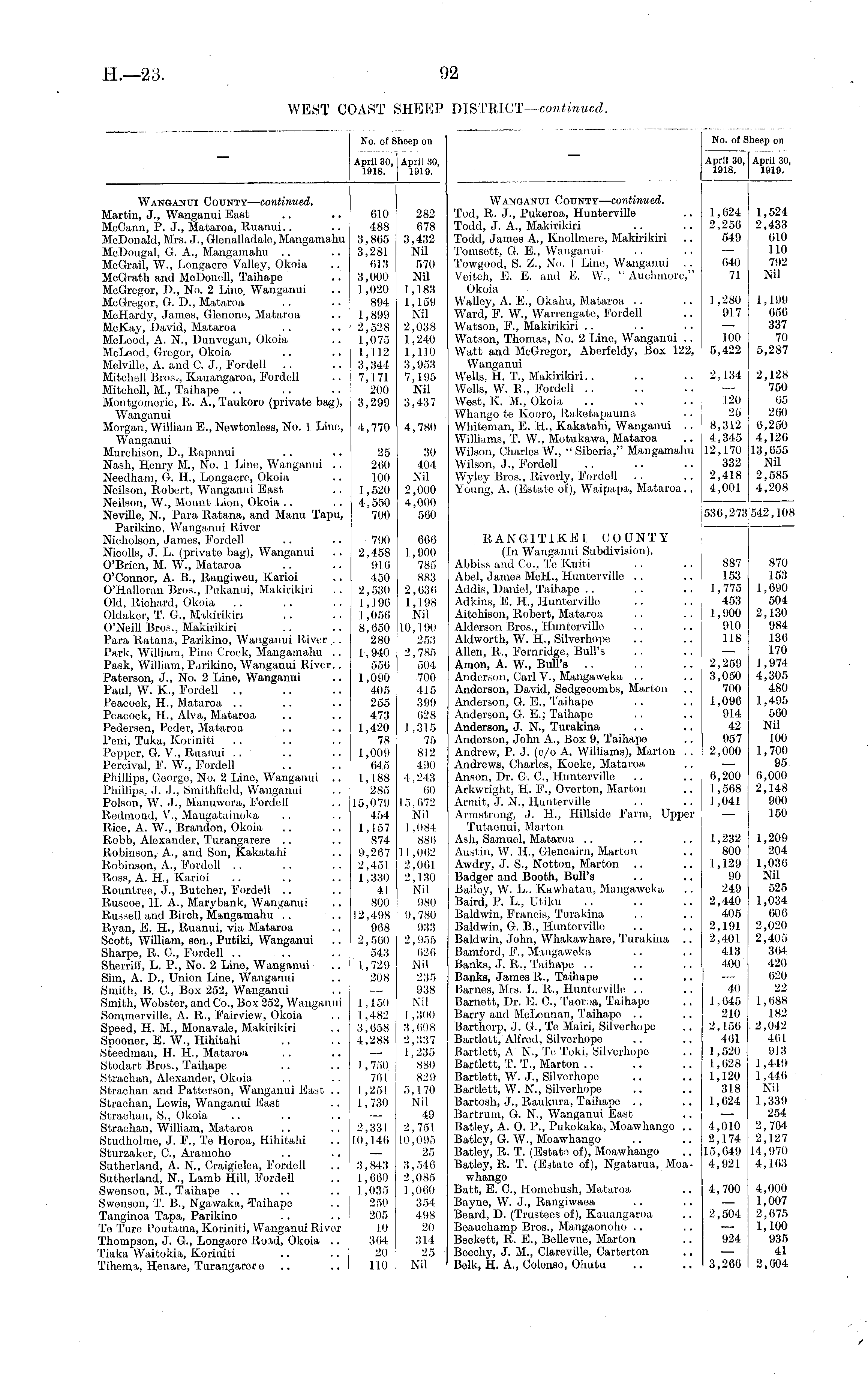 No. of Sheep on April 30, April 30, 1918. 1919. No. of Sheep on April 30, April 30, 1918. 1919. Wanganui County— continued. Martin, J., Wanganui East McCann, P. J., Mataroa, Ruanui.. McDonald, Mrs. J., Glenalladale, Mangamahu McDougal, G. A., Mangamahu McGrail, W., Longacro Valley, Okoia McGrath and McDoneU, Taihape McGregor, I)., No. 2 Lino, Wanganui McGregor, G. D., Mataroa McHardy, Jamos, Glenono, Mataroa McKay, David, Mataroa McLeod, A. N., Dunvcgan, Okoia McLeod, Gregor, Okoia Melville, A. and C. J., Fordell Mitchell Bros., Kauangaroa, Fordell Mitchell, M., Taihapo Montgomcric, It. A.,T'aukoro (private bag), Wanganui Morgan, William E., Newtonless, No. 1 Line, Wanganui Murchison, D., Rapanui Nash, Henry M., No. 1 Line, Wanganui .. Needham, G. H., Longacre, Okoia Neilson, Robert, Wanganui East Neilson, W., Mount Lion. Okoia NevUle, N., Para Ratana, and Manu Tapu, Parikino, Wanganui River Nicholson, James, Fordell Nicolls, J. L. (privato bag), Wanganui O'Brien, M. W., Mataroa O'Connor, A. B., Rangiwou, Karioi O'Halloran Bros., Pukanui, Makirikiri Old, Richard, Okoia Oldakcr, T. G., M-ikirikin O'Neill Bros., Makirikiri Para Ratana, Parikino, Wanganui River ... Park, William, Pine Creek, Mangamahu .. Pask, William, Parikino, Wanganui Rivor.. Paterson, J., No. 2 Line, Wanganui Paul, W. K., Fordell Peacock, H., Mataroa Peacock, II., Alva, Mataroa Pedersen, Peder, Mataroa Peni, Tuka, Koriniti Pepper, G. V., Ruanui .. Percival, F. W., Fordell Phillips, George, No. 2 Line, Wanganui .. Phillips, J. J., Smithfield, Wanganui Poison, W. J., Manuwera, Fordell Redmond, V., Mangatainoka Rice, A. W., Brandon, Okoia Robb, Alexander, Turangarero Robinson, A., and Son, Kakatahi Robinson, A., Fordell Ross, A. H, Karioi Rountree, J., Butcher, Fordell Ruseoe, H. A., Morybank, Wanganui Russell and Birch, Mangamahu Ryan, E. H., Ruanui, via Mataroa Scott, William, sen., Putiki, Wanganui Sharpe, R. C, Fordoll Sherriff, L. P., No. 2 Line, Wanganui Sim, A. D., Union Line, Wanganui Smith, B. G, Box 252, Wanganui Smith, Wobster, and Co., Box 252, Wanganui Sommerville, A. It., Fairviow, Okoia Speed, H. M., Monavale, Makirikiri Spoonor, E. W., Hihitahi Steedman, H. H, Mataroa Stodart Bros., Taihape Strachan, Alexander, Okoia Strachan and Patterson, Wanganui East .. Strachan, Lewis, Wanganui East Strachan, S., Okoia Strachan, William, Mataroa Studholme, J. P., Te Horoa, Hihitahi Sturzaker, G, Aramoho Sutherland, A. N., Craigieloa, Fordell Sutherland, N., Lamb Hill, Fordell Swenson, M., Taihape Swenson, T. B., Ngawaka, -Taihapo Tanginoa Tapa, Parikino Te Ture Poutarna, Koriniti, Wanganui River Thompson, J. G., Longacro Road, Okoia .. Tiaka Waitokia, Koriniti Tihema, Henare, Turangarer o .. 610 488 3,865 3,281 613 3,000 1,020 894 1,899 2,528 1,075 1,112 3,344 7,171 200 3,299 282 678 3,432 Nil 570 Nil 1,183 1,159 Nil 2,038 1,240 1,110 3,953 7,195 Nil 3,437 Wanganui County— continued. Tod, It. J., Pukeroa, Hunterville Todd, J. A., Makirikiri Todd, Jamos A., Knollmere, Makirikiri Tomsett, G. E., WanganuiTowgood, S. Vj., No. I Line, Wanganui .. Veitch, E. E. and E. W., " Auchmorc," Okoia Walloy, A. E., Okahu, Mataroa Ward, F. W., Warrengate, Fordell Watson, P.; Makirikiri Watson, Thomas, No. 2 Line, Wanganui .. Watt and McGregor, Aberfcldy, Box 122, Wanganui Wells, H. T., Makirikiri.. Wells, W. R., Fordell West, K. M., Okoia Whango te Kooro, Raketapauma Whiteman, E. IL, Kakatahi, Wanganui .. Williams, T. W., Motukawa, Mataroa Wilson, Charles W., " Siberia," Mangamahu Wilson, J., Fordell Wyley Bros., Riverly, Fordell Young, A. (Estate of), Waipapa, Mataroa.. 1,624 2,256 549 640 71 1,280 917 100 5,422 1,524 2,433 010 110 792 Nil 1,199 656 337 70 5,287 2,134 2,128 750 05 260 0,250 4,126 13,655 Nil. 2,585 4,208 4,770 4,780 120 25 8,312 4,345 12,1.70 332 2,418 4,001 25 260 100 1,520 4,550 700 30 404 Nil 2,000 4,000 500 It A N G1T1K E I C 0 U N T Y (In Wanganui Subdivision). Abbiss and Co., Te Kuiti Abel, James McH., Hunterville Addis, Daniel, Taihape Adkins, E. H., Hunterville Aitehison, Itobert, Mataroa Alderson Bros., Hunterville Aldworth, W. II., Silverhope Allen, It., Fernridge, Bull's Amon, A. W., BuU's .. Anderson, Carl V., Mangaweka Anderson, David, Sodgecombs, Marton Anderson, G. E., Taihape Anderson, G. E.; Taihape Anderson, J. N., Turakina Anderson, John A., Box 9, Taihapo Andrew, P. J. (c/o A. Williams), Marlon .. Andrews, Charles, Koeke, Mataroa Anson, Dr. G. G, Hunterville Arkwright, H. F., Overton, Marton Arinit, J. N., Hunterville Armstrong, J. II., Hillside Farm, Upper Tutaenui, Marton Ash, Samuel, Mataroa Austin, W. H., Glencairn, Marton Awdry, J. S., Notton, Marton Badger and Booth, BuU's Bailoy, W. L.. Kawhatau, .Mangaweka Baird, P. L., Utiku Baldwin, Francis, Turakina Baldwin, G. B., Hunterville Baldwin, John, Whakawharc, Turakina .. Bamford, F., Mangaweka Banks, J. R., Taihape Banks, Jamos It., Taihapo Barnes, Mis. L. It., Hunterville Barnett, Dr. E. G, Taoroa, Taihape Barry and McLennan, Taihape Barthorp, J. G., Te Mairi, Silverhope Bartlott, Alfred, Silverhope Bartlett, A N., Te Toki, Silverhope Bartlett, T. T., Marton Bartlett, W. J., Silverhope Bartlett, W. N., Silverhope Bartosh, J., Raukura, Taihape Bartrum, G. N., Wanganui East Batley, A. O. P., Pukekaka, Moawhango .. Batloy, G. W., Moawhango Batley, It. T. (Estate of), Moawhango Batloy, R. T. (Estate of), Ngatarua, Moawhango Batt, E. G, Homebush, Mataroa Bay no, W. J., Rangiwaea Beard, D. (Trustees of), Kauangaroa Boauchamp Bros., Mangaonoho Beckett, R. E., Bollevue, Marton Boeehy, J. M., Clareville, Carterton Bolk, K. A., Oolonso, Ohutu 536,273 542,10 790 2,458 916 450 2,530 I , I 90 1 ,056 8,650 280 1,940 556 1,090 405 255 473 1,420 78 1,009 045 1,188 285 15,079 454 1,157 874 9,207 2,451 1,330 41 800 12,498 968 2,560 543 1,729 208 060 I , 900 785 883 2,636 1,198 Nil 10,190 253 2,785 504 700 415 399 028 1,315 75 812 490 4,243 60 15,672 Nil 1,084 886 1.1,062 2,061 2,130 Nil 080 9,780 933 2,956 626 Nil 235 938 Nil I ,300 3,608 2,337 1,2:35 880 8