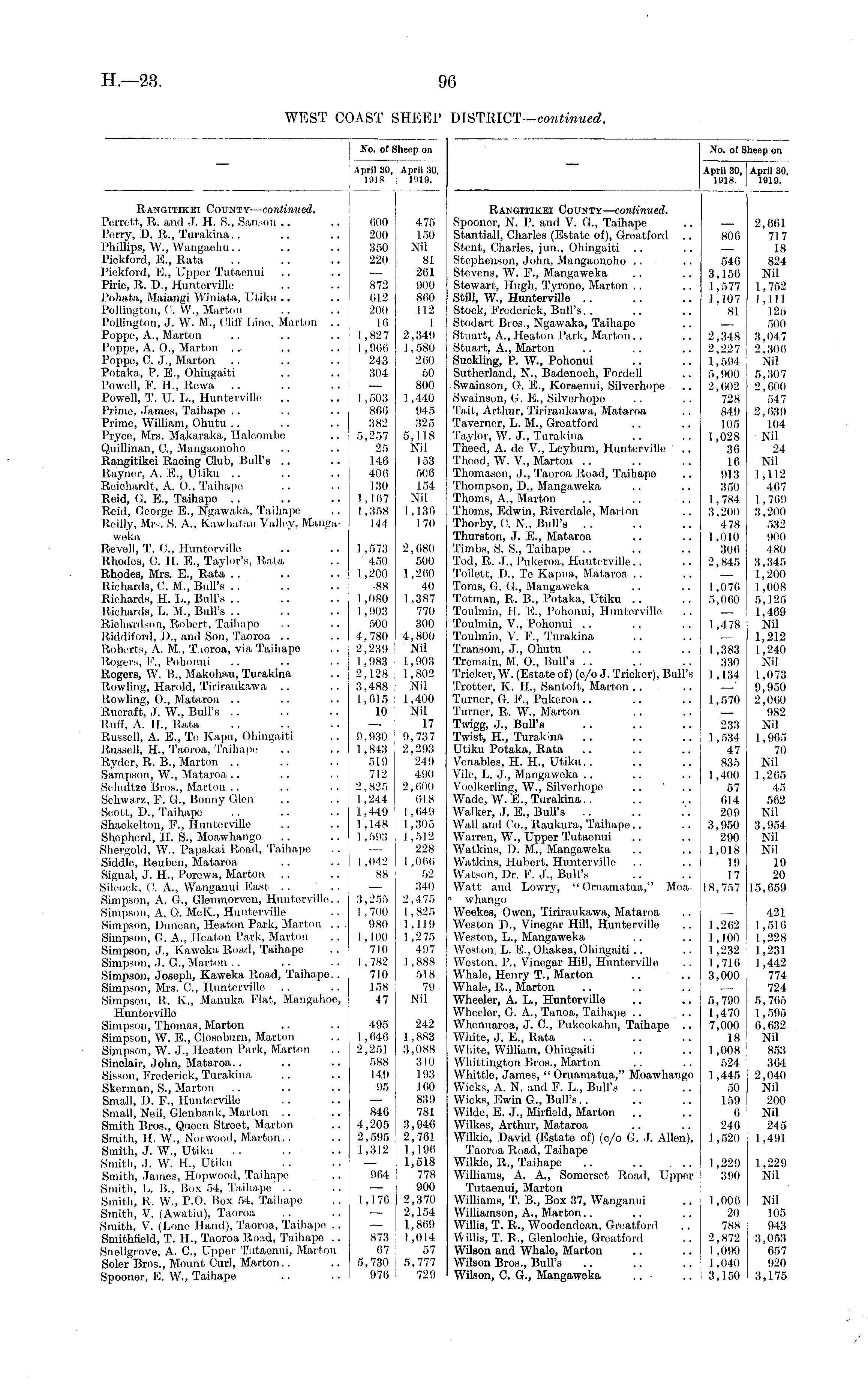 No. of -heep on I April 39, I 1019. No. of Sheep on April 39, 1918. April 39, 1918. April 39, 1919. Rangitikei County-— continued. Perrett, R. and J. H. S., Sanson Perry, D. It., Turakina.. Phillips, W., Wangaohu Pickford, E., Rata Pickford, E., Upper Tutaenui Pirie, It. D., Hunterville Pohata, Maiangi Winiata, Utiku Pollington, 0. W., Marton Pollington, J. W. M., Cliff Line, Marton .. Poppe, A., Marton Poppe, A. ()., Marton ... Poppe, 0. J., Marton Potaka, P. E., Ohingaiti Powell, P. H., Rewa Powell, T. U. L., Hunterville Prime, James, Taihape Prime, William, Ohutu Pryce, Mrs. Makaraka, Halcombe Quillinan, G, Mangaonoho Rangitikei Racing Club, Bull's Rayner, A. E., Utiku Reichardt, A. 0., Taihape Reid, G. E., Taihape Reid, George E., Ngawaka, Taihape Reilly, Mrs. S. A., Kawhatau Valley, Mangaweka Revell, T. G, HunterviUe Rhodes, C. H. E., Taylor's, Rata Rhodes, Mrs. E., Rata Richards, C. M., Bull's Richards, H. L., Bull's Richards, L. M., Bull's Richardson, Robert, Taihape Riddiford, D., and Son, Taoroa Roberts, A. M., Taoroa, via Taihape Rogers, P., Pohonui Rogers, W. B.. Makohau, Turakina Rowling, Harold, Tiriraukawa Rowling, 0., Mataroa Rucraft, J. W., Bull's Ruff, A. II., Rata Russell, A. E., Te Kapu, Ohingaiti Russell, H., Taoroa, Taihape Ryder, R. B., Marton Sampson, W., Mataroa Schultze Bros., Marton Schwarz, F. G., Bonny Glen Seott, D., Taihapo Shackelton, F., Hunterville Shepherd, H. S., Moawhango Shergold, W., Papakai Road, Taihape Siddle, Reuben, Mataroa Signal, J. H., Porewa, Marton Silcock, C. A., Wanganui East Simpson, A. G., Glenmorven, Hunterville.. Simpson, A. G. McIC, HunterviUe Simpson, Duncan, Heaton Park, Marton .. , Simpson, G. A., Heaton Park, Marton Simpson, J., Kaweka Road, Taihape Simpson, J. G., Marton Simpson, Joseph, Kaweka Road, Taihape.. Simpson, Mrs. C, Hunterville Simpson, R. K., Manuka Flat, Mangahoe, HunterviUe Simpson, Thomas, Marton Simpson, W. E., Closoburn, Marton Simpson, W. J., Heaton Park, Marton Sinclair, John, Mataroa.. Sisson, Frederick, Turakina Skerman, S., Marton Small, D. F., Hunterville Small, Neil, Glenbank, Marton Smith Bros., Queen Street, Marton Smith, H. W., Norwood, Marton.. Smith, J. W., Utiku Smith, J. W. IL, Utiku Smith, James, Hopwood, Taihape Smith, L. B., Box 54, Taihape Smith, It. W., P.O. Box 54, Taihape Smith, V. (Awatiu), Taoroa Smith, V. (Lone Hand), Taoroa, Taihape .. Smithfield, T. H., Taoroa Road, Taihape .. Snollgrove, A. G, Upper Tutaonui, Marton Solor Bros., Mount Curl, Marton.. Spoonor, E. W., Taihapo 600 200 350 220 872 012 200 16 1,827 I , 966 243 304 1 ,503 860 382 5,257 25 146 400 130 1,167 1,358 144 1,573 4.50 I , 200 •88 I ,080 1,903 500 4,780 2,239 1,983 2.128 3,488 1,615 10 9,930 I , 843 519 712 2,825 1,244 1,44.9 1,148 1 ,593 475 150 Nil 81 201 900 800 112 I 2,34!) 1,580 260 50 800 1,440 945 325 5,118 Nil 153 506 154 Nil 1,130 170 2,680 500 1,260 40 1,387 770 300 4,800 Nil 1,903 I , 802 Nil 1,400 Nil 17 9,737 2,293 249 490 2,000 618 I , 64!) 1,305 1,512 228 I ,066 52 340 2,475 1,825 1,119 I ,275 497 I ,888 518 79 Nil Rangitikei County— continued. Spooner, N. P. and V. G., Taihape Stantiall, Charles (Estate of), Greatford .. Stent, Charles, jun., Ohingaiti .. Stephenson, John, Mangaonoho Stevens, W. F., Mangaweka Stewart, Hugh, Tyrone, Marton Still, W., HunterviUe Stock, Frederick, Bull's Stodart Bros., Ngawaka, Taihapo Stuart, A., Heaton Park, Marton.. Stuart, A., Marton Suckling, P. W-, Pohonui Sutherland, N., Badenoch, Fordell Swainson, G. E., Koraenui, Silverhope Swainson, G. E., Silverhope Tait, Arthur, Tiriraukawa, Mataroa Taverner, L. M., Greatford Taylor, W. J., Turakina Theed, A. de V., Leyburn, Huntervillo Theed, W. V., Marton Thomason, J., Taoroa Road, Taihapo Thompson, D., Mangaweka Thorns, A., Marton Thorns, Edwin, Riverdale, Marton Thorby, C. N., Bull's .. Thurston, J. E., Mataroa Timbs, S. S., Taihape Tod, It. J., Pukeroa, HunterviUe.. Tollett, D., Te Kapua, Mataroa Toms, G. G., Mangaweka Totman, R. B., Potaka, Utiku Toulmin, H. E., Pohonui, HunterviUe Toulmin, V., Pohonui Toulmin, V. P., Turakina Transom, J., Ohutu Tromain, M. 0., Bull's Tricker, W. (Estate of) (c/o J. Tricker), Bull's Trotter, K. IL, Santoft, Marton Turner, G. P., Pukeroa Turner, It. W., Marton Twigg, J., Bull's Twist, IL, Turakma Utiku Potaka, Rata Vonables, H. IL, Utiku.. Vile, L. J., Mangaweka Voolkorling, W., Silverhope Wade, W. E., Turakina Walker, J. E., BuU's Wall and Co., Raukura, Taihape Warren, W., Upper Tutaonui Watkins, D. M., Mangaweka Watkins, Hubert, Hunterville . . Watson, Dr. F. J., Bull's Watt and Lowry, " Oruamatua," Moawhango Weekes, Owen, Tiriraukawa, Mataroa Weston I)., Vinegar Hill, Hunterville Weston, L., Mangaweka Weston, L. E., Ohakea, Ohingaiti Weston, P., Vinegar Hill, Hunterville Whale, Henry T., Marton Whale, It., Marton Wheeler, A. L., Hunterville Wheeler, G. A., Tanoa, Taihape Whenuaroa, J. C, Pukeokahu. Taihape .. White, J. E., Rata .. White, William, Ohingaiti Whittington Bros., Marton Whittle, James, " Oruamatua," Moawhango Wicks, A. N. and F. L„ Bull's Wicks, EwinG., Bull's.. Wilde, E. J., Mirfield, Marton Wilkes, Arthur, Mataroa Wilkio, David (Estate of) (c/o G. J. Allen), Taoroa Road, Taihape Wilkie, It., Taihape Williams, A. A., Somerset Road, Upper Tutaenui, Marton Williams, T. B., Box 37, Wanganui Williamson, A., Marton.. Willis, T. R., Woodendoan, Greatford Willis, T. R., Glenlochie, Greatford WUson and Whale, Marton WUson Bros., Bull's Wilson, C. G., Mangaweka 806 546 3,150 1,577 1.107 81 2,348 2,227 1,594 5,900 2,602 728 849 105 1,028 30 16 913 350 1,784 3,200 478 1,010 306 2,845 1,076 5,060 1,478 1,383 330 1,134 1,570 233 1,534 4.7 835 1,4.00 57 014 209 3,950 290 1,018 I!) 17 18,757 2,661 717 18 824 Nil 1,752 1,111 125 500 3,047 2,306 Nil 5,307 2,600 547 2,639 104 Nil 24 Nil 1,112 467 1,769 3,200 532 900 480 3,345 1,200 1 ,008 5,125 1,469 Nil 1,212 1,240 Nil 1,073 9,950 2,000 982 Nil 1,965 70 Nil 1,265 45 562 Nil 3,954 Nil Nil 19 20 15,059 I ,042 88 3,255 I , 700 980 I ,