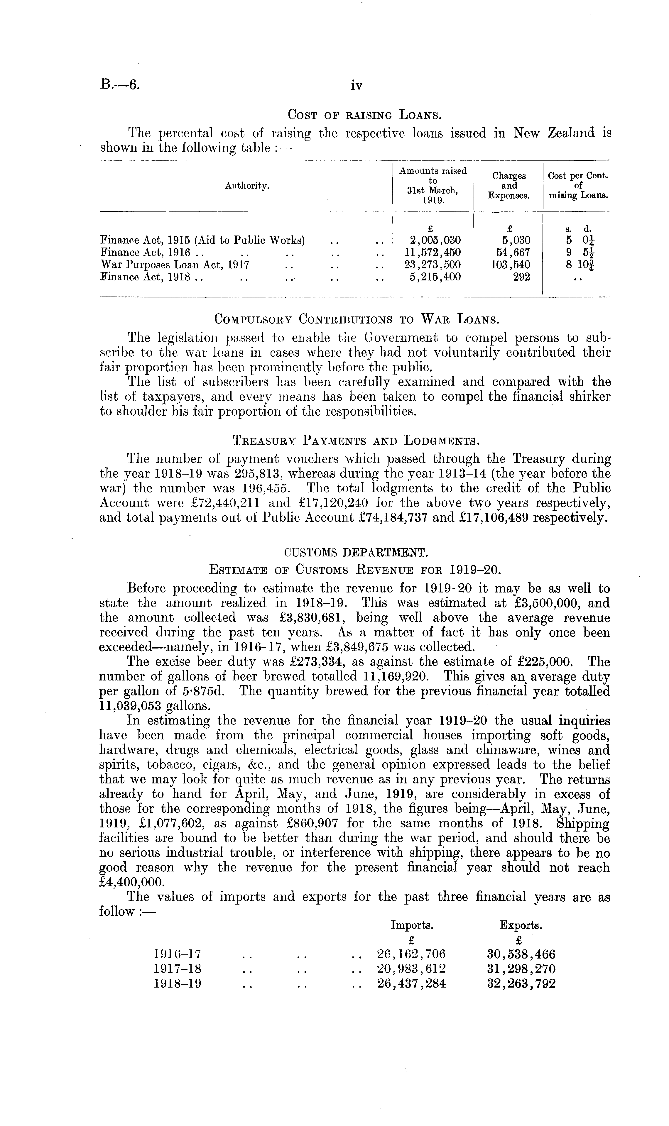 Compulsory Contributions to War Loans. The legislation passed to enable the Government to compel persons to subscribe to the war loans in cases where they had not voluntarily contributed their fair proportion has been prominently before the public. The list of subscribers has been carefully examined and compared with the list of taxpayers, and every means has been taken to compel the financial shirker to shoulder his fair proportion of the responsibilities. Treasury Payments and Lodgments. The number of payment vouchers which passed through the Treasury during the year 1918-19 was 295,813, whereas during the year 1913-14 (the year before the war) the number was 196,455. The total lodgments to the credit of the Public Account were £72,440,211 and £17,120,240 for the above two years respectively, and total payments out of Public Account £74,184,737 and £17,106,489 respectively. CUSTOMS DEPAETMENT. Estimate of Customs Revenue for 1919-20. Before proceeding to estimate the revenue for 1919-20 it may be as well to state the amount realized in 1918-19. This was estimated at £3,500,000, and the amount collected was £3,830,681, being well above the average revenue received during the past ten years. As a matter of fact it has only once been exceeded—namely, in 1916-17, when £3,849,675 was collected. The excise beer duty was £273,334, as against the estimate of £225,000. The number of gallons of beer brewed totalled 11,169,920. This gives an average duty per gallon of 5-875 d. The quantity brewed for the previous financial year totalled 11,039,053 gallons. In estimating the revenue for the financial year 1919-20 the usual inquiries have been made from the principal commercial houses importing soft goods, hardware, drugs and chemicals, electrical goods, glass and chinaware, wines and spirits, tobacco, cigars, &c, and the general opinion expressed leads to the belief that we may look for quite as much revenue as in any previous year. The returns already to hand for April, May, and June, 1919, are considerably in excess of those for the corresponding months of 1918, the figures being—April, May, June, 1919, £1,077,602, as against £860,907 for the same months of 1918. Shipping facilities are bound to be better than during the war period, and should there be no serious industrial trouble, or interference with shipping, there appears to be no good reason why the revenue for the present financial year should not reach £4,400,000. The values of imports and exports for the past three financial years are as follow : — Imports. Exports. £ £ 1916-17 .. .. .. 26,162,706 30,538,466 1917-18 .. .. .. 20,983,612 31,298,270 1918-19 .. .. .. 26,437,284 32,263,792
