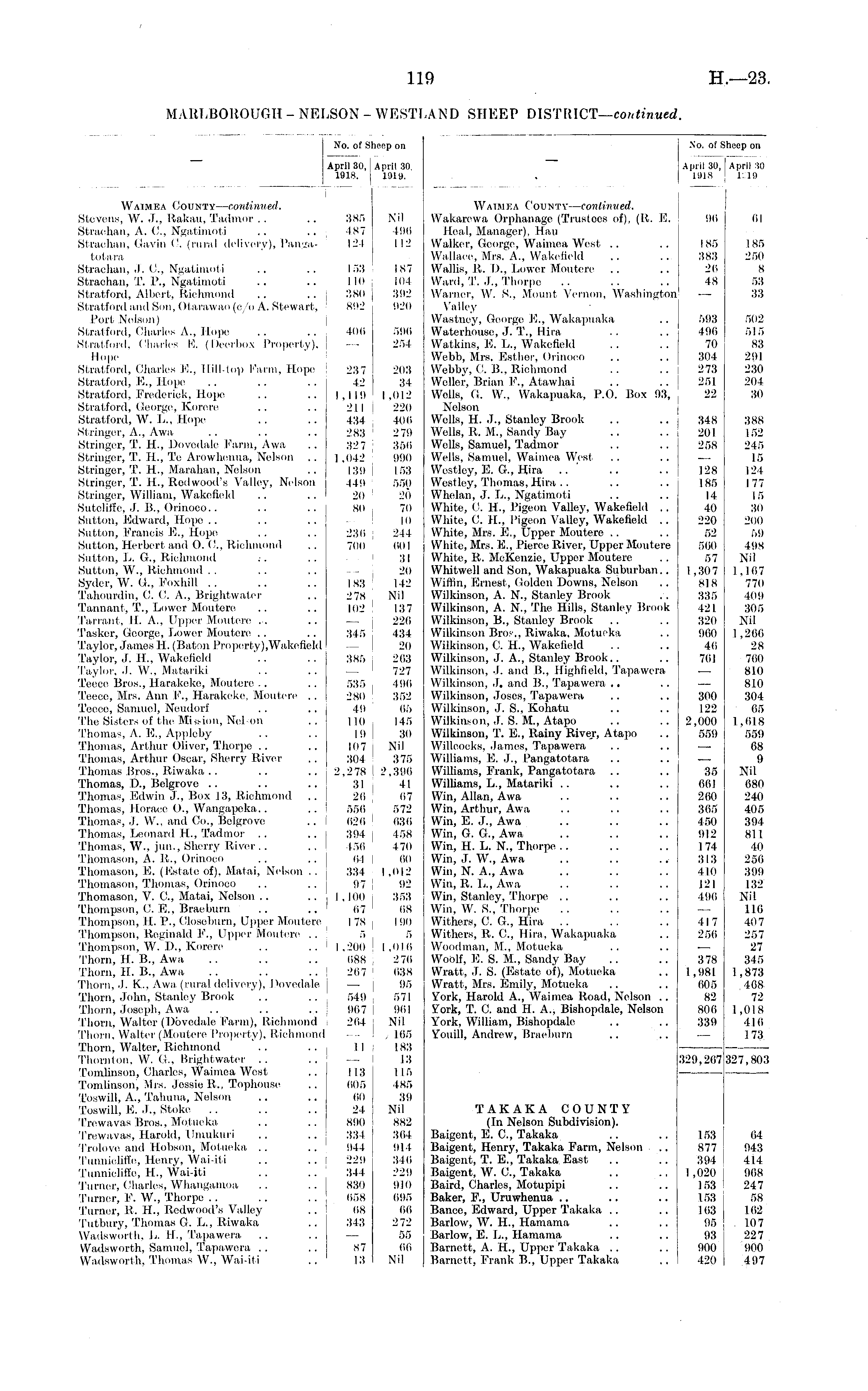 No. of SI April 39, 1918. Iieep on April 30, 1919. No. of SI April 30, [ 1918 J iheep on I April 30 r.io | Waimea County— continued, Wakarcwa Orphanage (Trustees of), (R. E. Heal, Manager), Hau Walker, George, Waimea West Wallace, Mrs. A., Wakefield WaUis, It. D., Lower Moutere Ward, T. J., Thorpe Warner, W. S., Mount Vernon, Washington Valley Wastney, George E., Wakapuaka Waterhouse, J. T., Hira Watkins, E. L., Wakefield Webb, Mrs. Esther, Orinoco Webby, 0. B., Richmond Weller, Brian F,, Atawhai Wells, G. W., Wakapuaka, P.O. Box 93, Nelson Wells, H. J., Stanley Brook Wells, It. M., Sandy Bay Wells, Samuel, Tadmor Wells, Samuel, Waimea West Westley, E. G., Hira Westley, Thomas, Hira .. Whelan, J. L., Ngatimoti White, 0. H., Pigeon Valley, Wakefield .. White, C. IL, Pigeon Valley, Wakefield .. White, Mrs. E., Upper Moutere White, Mrs. E., Pierce River, Upper Moutere White, It. McKenzie, Upper Moutere Whitwell and Son, Wakapuaka Suburban.. Willin, Ernest, Golden Downs, Nelson Wilkinson, A. N., Stanley Brook Wilkinson, A. N., The Hills, Stanley Brook Wilkinson, B., Stanley Brook Wilkinson Bros., Riwaka, Motueka Wilkinson, C. H., Wakefield Wilkinson, J. A., Stanley Brook.. Wilkinson, J. and B., Highfield, Tapawera Wilkinson, J. and B., Tapawera Wilkinson, .loses, Tapawera Wilkinson, J. S., Kohatu Wilkinson, J. S. M., Atapo Wilkinson, T. E., Rainy Rivej-, Atapo Willeoeks, James, Tapawera Williams, E. J., Pangatotara Williams, Frank, Pangatotara Williams, L., Matariki Win, Allan, Awa Win, Arthur, Awa Win, E. J., Awa Win, G. G., Awa Win, H. L. N., Thorpe Win, J. W., Awa Win, N. A., Awa Win, R. L., Awa Win, Stanley, Thorpe Win, W. S.," Thorpe Withers, G G., Hira Withers, R. G, Hira, Wakapuaka Woodman, M., Motueka Woolf, E. S. M., Sandy Bay Wratt, J. S. (Estate of), Motueka Wratt, Mrs. Emily, Motueka York, Harold A., Waimea Road, Nelson .. York, T. G and H. A., Bishopdale, Nelson York, William, Bishopdale Youill, Andrew, Braeburn Waimea County— continued. Stevens, W. J., Rakau, Tadmor Strachan, A. G, Ngatimoti .. .. Strachan, Gavin C (rural delivery), Pangatotara Strachan, J. C, Ngatimoti Strachan, T. P., Ngatimoti .. ... Stratford, Albert, Richmond Stratford and Son, Ofarawao (c/o A. Stewart, Port Nelson) Stratford, Charles A., Hope Stratford. Charles E. (Deerbox Property), Hope Stratford, Charles E., Hilltop Farm, Hope Stratford, __.., Hope, Stratford, Frederick, Hope Stratford, George, Korere Stratford, W. L., Hope Stringer, A., Awa Stringer, T. H., Dovedale Farm, Awa Stringer, T. H., Te Arowhenua, Nelson .. Stringer, T. H., Marahan, Nelson Stringer, T. H., Redwood's Valley, Nelson Stringer, William, Wakefield Sutolifie, J. B., Orinoco.. Sutton, Edward, Hope Sutton, Francis E., Hope Sutton, Herbert and O. (!., Richmond Sutton, L. G., Richmond Sutton, W., Richmond Sydor, W. G., Foxhill Tahourdin, 0. C. A., Brightwater T'annant, T., Lower Moutere Tarrant, It. A., Upper Moutere ... Taskcr, George, Lower Moutero Taylor, James H. (Baton Prop erty), Wake field Taylor, J. H., Wakefield Taylor, J. W., Matariki Teeoc Bros., Harakeke, Moutere Teece, Mrs. Ann P., Harakeke, Moutere .. Teeco, Samuel, Neudorf The Sisters of the Mission, NcLon Thomas, A. E., Appleby Thomas, Arthur Oliver, Thorpe Thomas, Arthur Oscar, Sherry River Thomas Bros., Riwaka Thomas, D., Belgrove Thomas, Edwin J., Box 13, Richmond Thomas, Horace O., Wangapeka.. Thomas, J. W., and Co., Belgrove .. I Thomas, Leonard IL, Tadmor Thomas, W., jun., Sherry River Thomason, A. It., Orinoco Thomason, E. (Estato of), Matai, Nelson . . Thomason, Thomas, Orinoco Thomason, V. G, Matai, Nelson .. Thompson, C. E., Braeburn .. Thompson, II. P., Closoburn, Upper Moutere Thompson, Reginald P., Upper Moutere .. Thompson, W. I)., Korere Thorn, H. B., Awa Thorn, H. B., Awa Thorn, J. K., Awa (rural delivery), Dovedale Thorn, John, Stanley Brook Thorn, Joseph, Awa Thorn, Walter (Dovedale Farm), Richmond Thorn, Walter (Moutere Property), Richmond Thorn, Walter, Richmond Thornton, W. G., Brightwater .. .. Tomlinson, Charles, Waimea West Tomlinson, Mrs. Jessie R., Tophouse Toswill, A., Tahuna, Nelson Toswill, E. J., Stoke Trewavas Bros., Motueka Trewavas, Harold, Umukuri Trolove and Hobson, Motueka Tunnioliffe, Henry, Wai-iti Tunnieliffe, H., Wai-iti Turner, Charles, Whangamoa Turner, P. W., Thorpe Turner, It. H., Redwood's Valley Tutbury, Thomas G. L., Riwaka Wadsworth, L. H., Tapawera Wadsworth, Samuel, Tapawera Wadsworth, Thomas W., Wai-iti 385 487 124 I 53 IIO 380 802 406 237 42 1,119 211 434 283 32 7 1.0-12 13!) 449 20 80 236 700 183 278 102 345 385 535 280 4!) 110 19 107 304 2,278 I 31 20 ,' 556 626 394 456 64 334 97 1,100 67 178 5 1,200 688 ! 267 549 967 264 II I I 13 605 60 24 890 334 044 229 344 830 658 68 343 87 13 Nil 196 112 187 101 392 920 596 254 203 34 I .012 220 406 279 356 900 I 53 550 20 70 10 244 001 31 20 142 Nil 137 220 434 20 263 727 496 352 65 145 30 Nil 375 2.396 41 67 572 636 458 470 60 1.012 92 353 68 190 I ,016 276 638 95 571 961 Nil . 165 183 13 I 15 485 39 Nil 882 364 914 346 229 010 695 66 272 55 66 Nil 96 61 I 85 383 26 48 185 250 8 53 33 593 496 70 304 273 251 22 502 515 83 291 230 204 30 i 348 201 258 388 152 245 15 124 177 15 30 200 59 498 Nil 1,107 770 409 305 Nil 1,266 28 760 810 810 304 65 1.618 559 68 9 Nil 680 240 405 394 811 40 256 399 132 Nil 116 407 257 27 345 1,873 408 72 1,018 416 173 128 185 14 40 220 52 560 57 1,307 818 335 421 320 960 40 701 300 122 2,000 559 35 001 260 365 450 912 174 313 410 121 496 417 256 378 1,981 605 82 800 339 329,207; 327,803 TAKAKA COUNTY (In Nelson Subdivision). Baigent, E. C, Takaka Baigent, Henry, Takaka Farm, Nelson Baigent, T. E., Takaka East Baigent, W. C, Takaka Baird, Charles, Motupipi Baker, P., Uruwhenua Banco, Edward, Upper Takaka Barlow, W. H., Hamama Barlow, E. L., Hamama Barnett, A. H., Upper Takaka .. Barnett, Frank B., Upper Takaka 153 877 394 I ,020 153 153 163 95 93 900 420 64 943 414 968 247 58 162 107 227 900 497